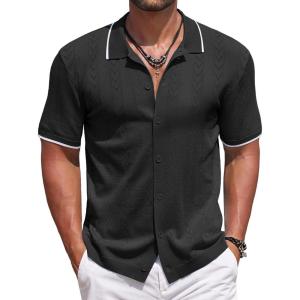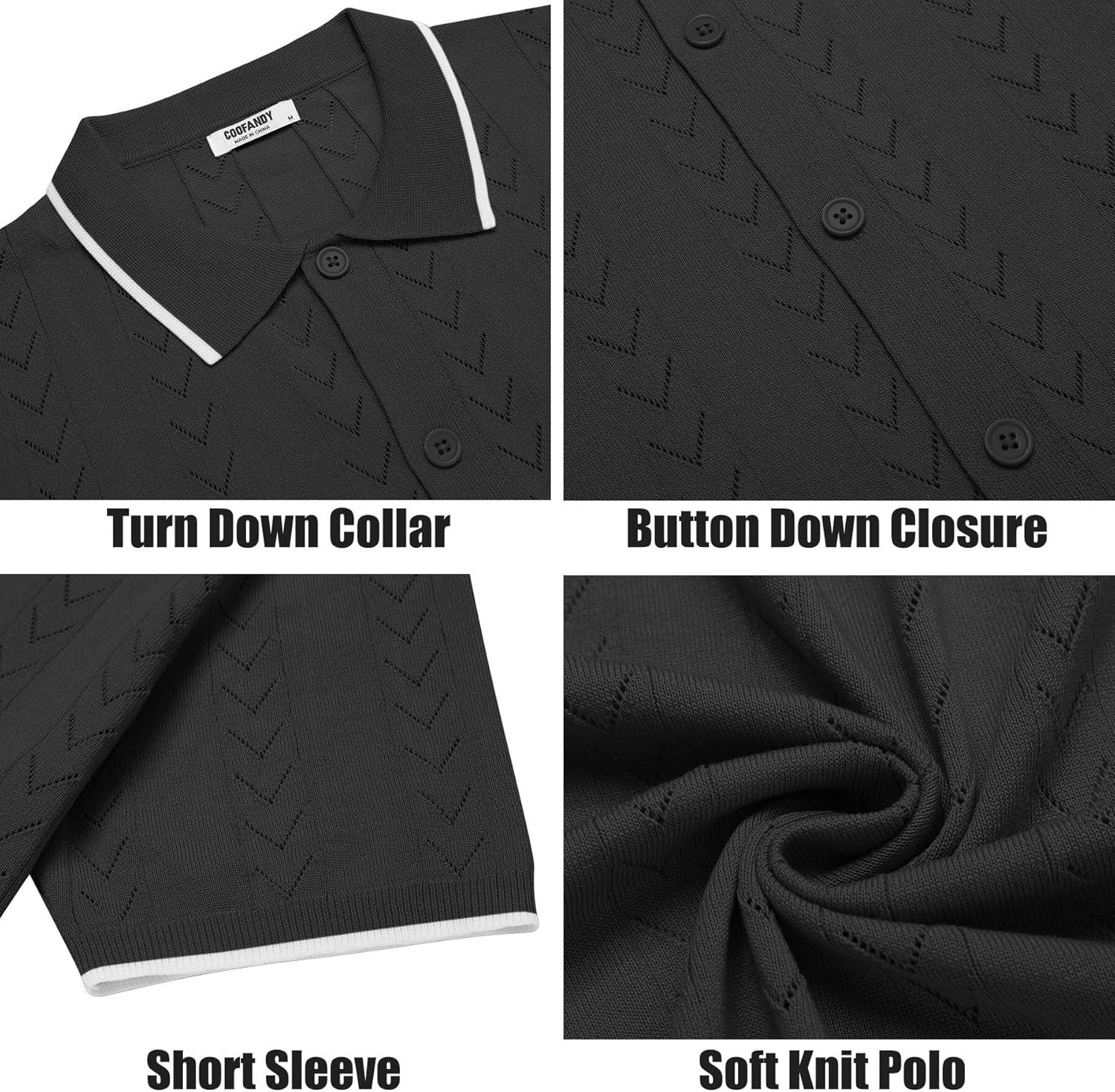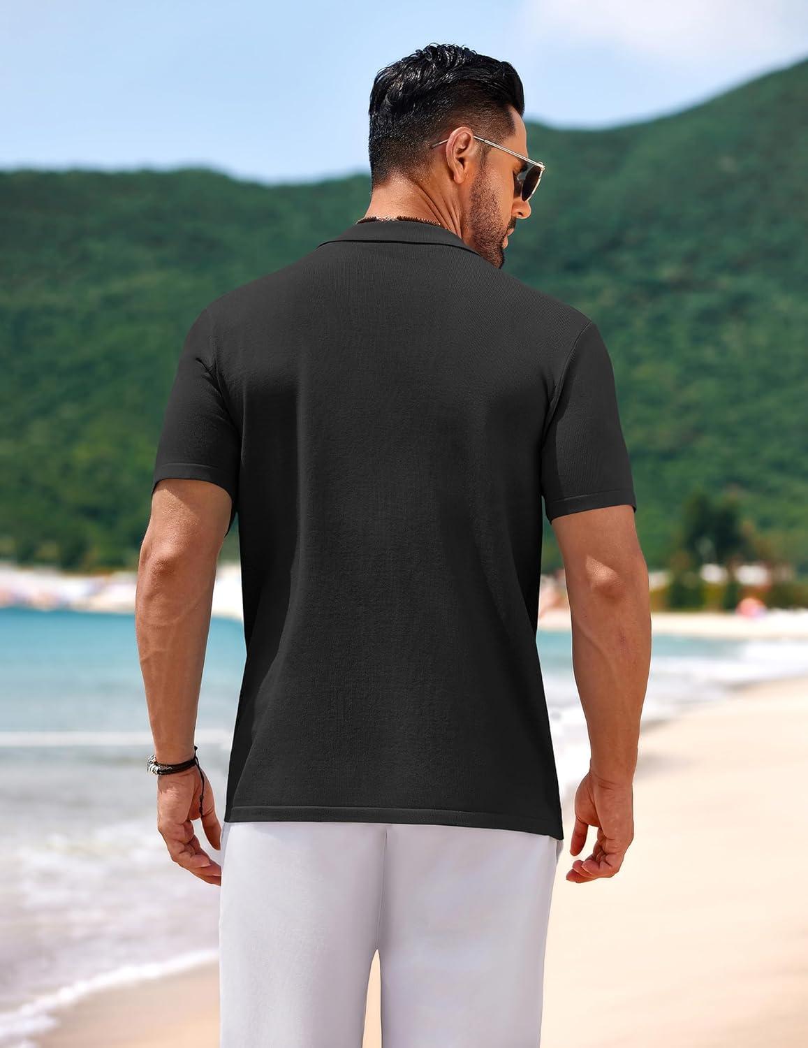 COOFANDY Mens Knit Polo Shirts Button Down Short Sleeve Shirt Summer Casual Beach Vacation Tops(Black)