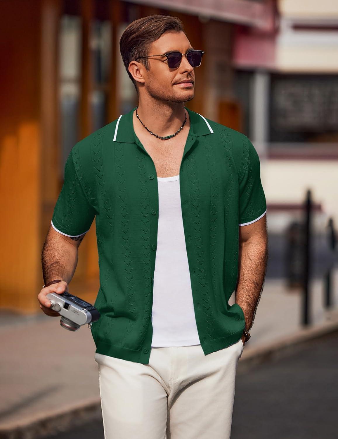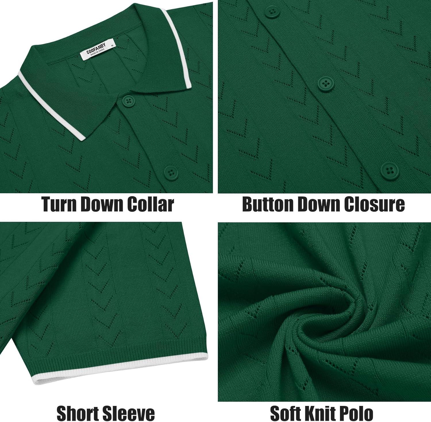 COOFANDY Mens Knit Polo Shirts Button Down Short Sleeve Shirt Summer Casual Beach Vacation Tops(Dark Green)