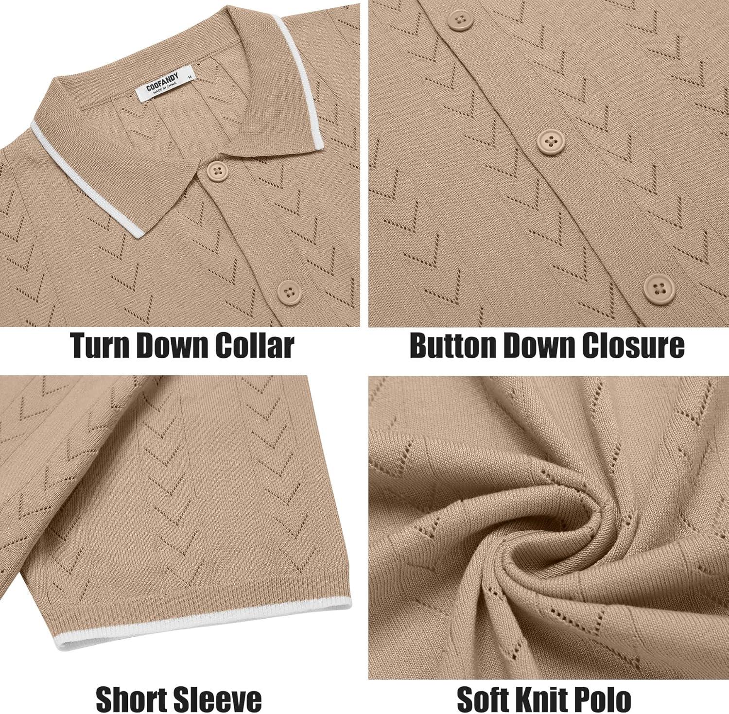 COOFANDY Mens Knit Polo Shirts Button Down Short Sleeve Shirt Summer Casual Beach Vacation Tops(Khaki)