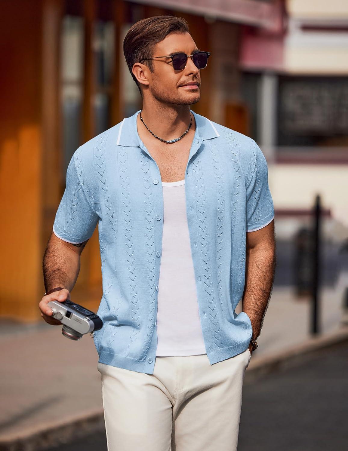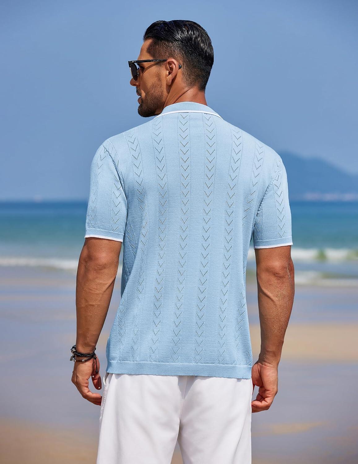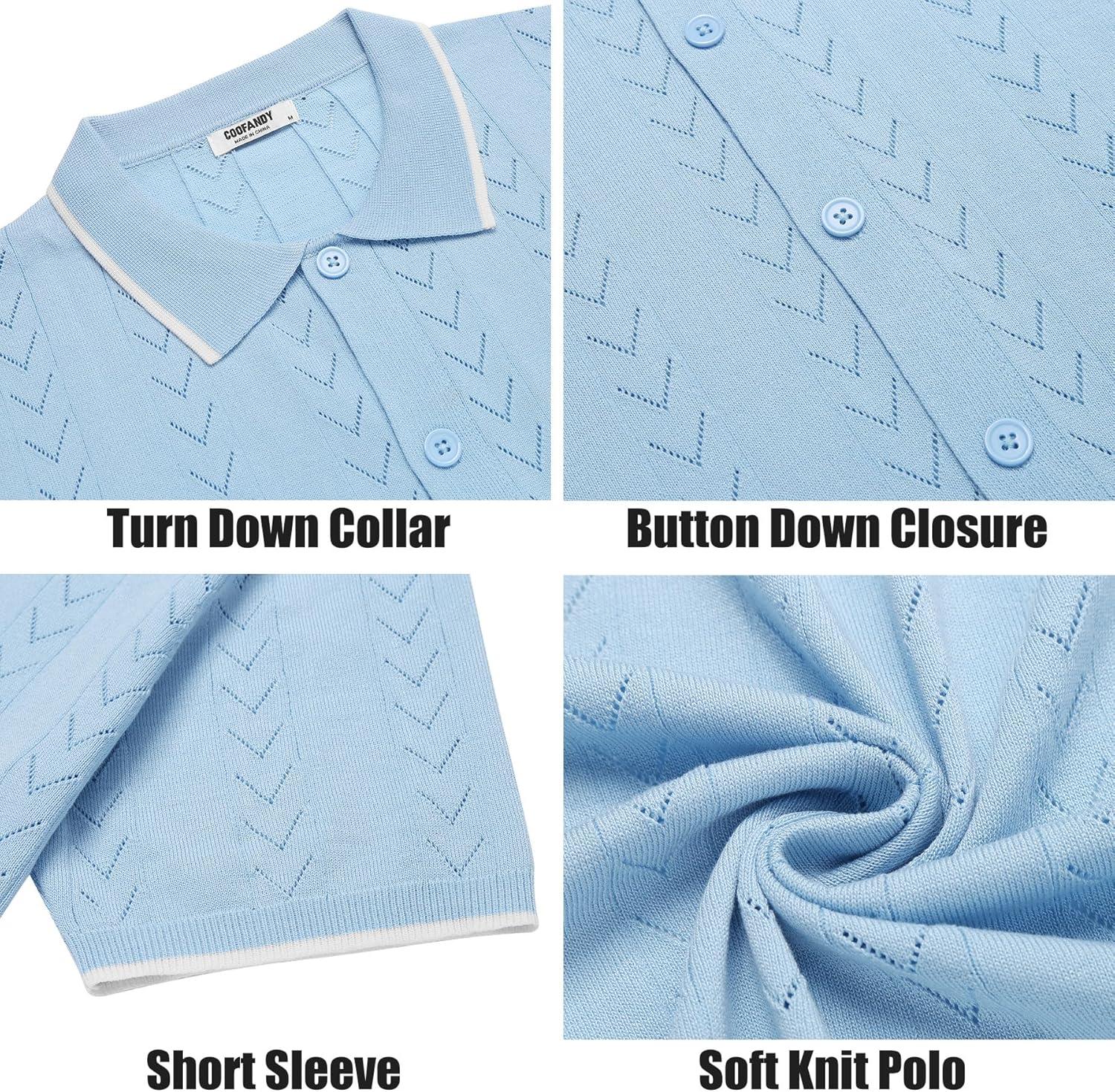 COOFANDY Mens Knit Polo Shirts Button Down Short Sleeve Shirt Summer Casual Beach Vacation Tops(Light Blue)