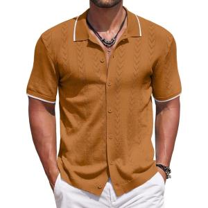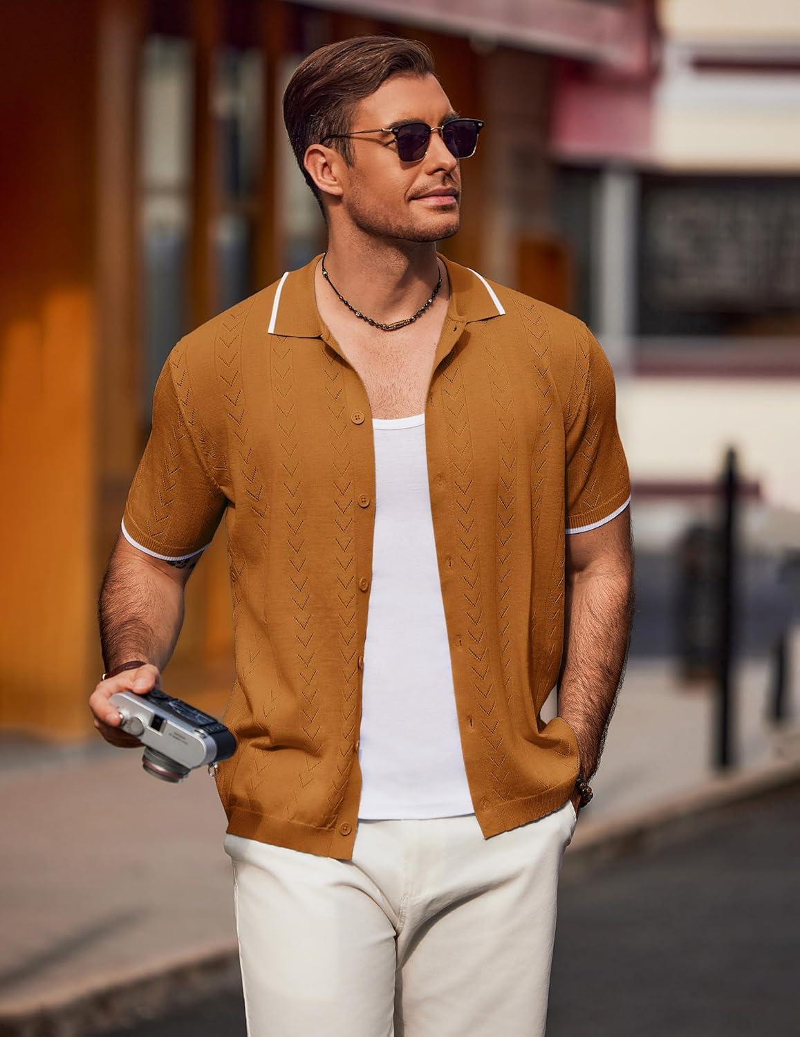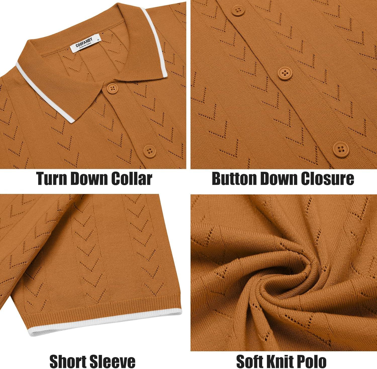 COOFANDY Mens Knit Polo Shirts Button Down Short Sleeve Shirt Summer Casual Beach Vacation Tops(Light Brown)