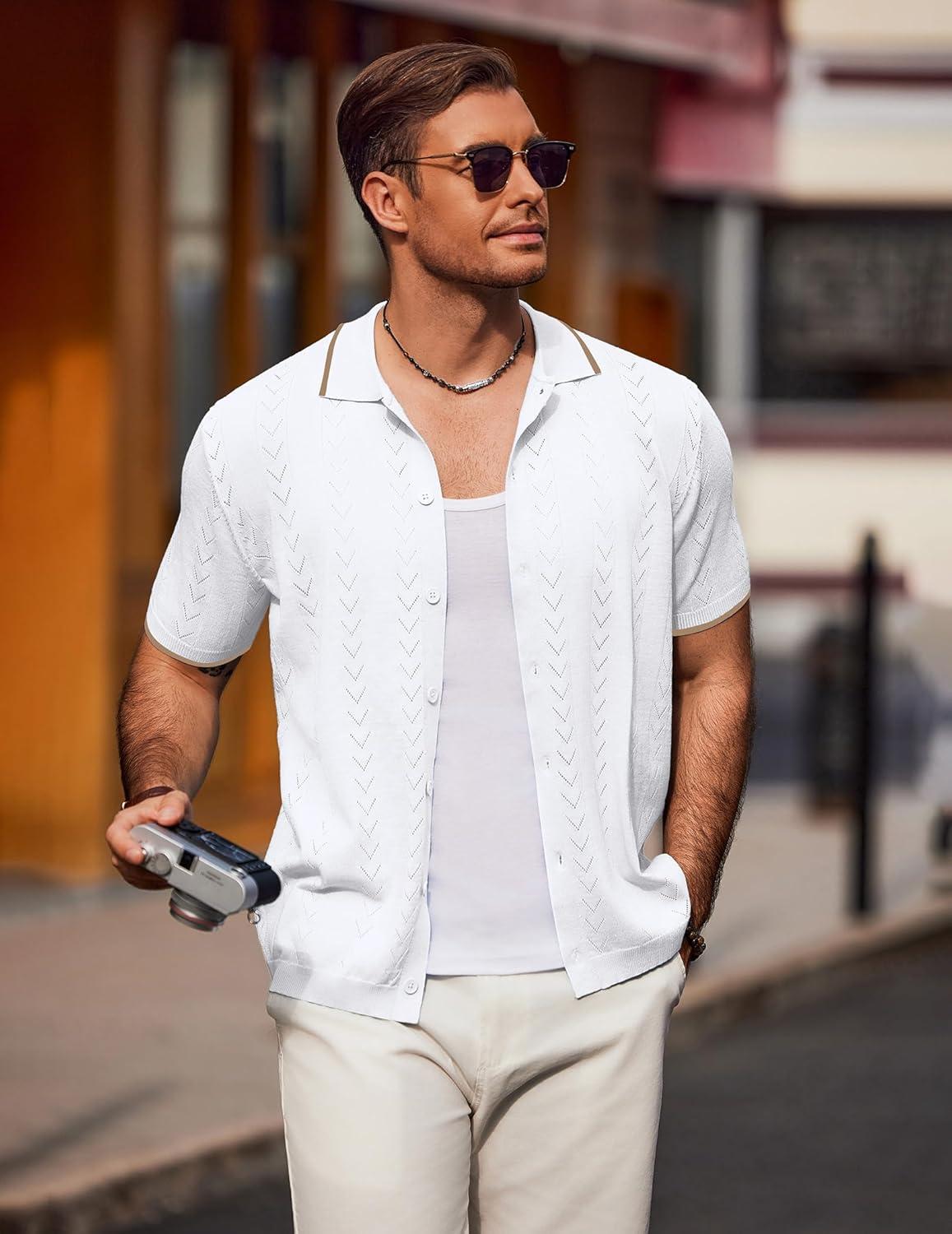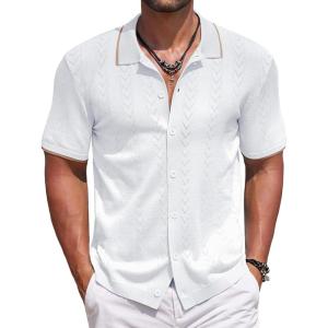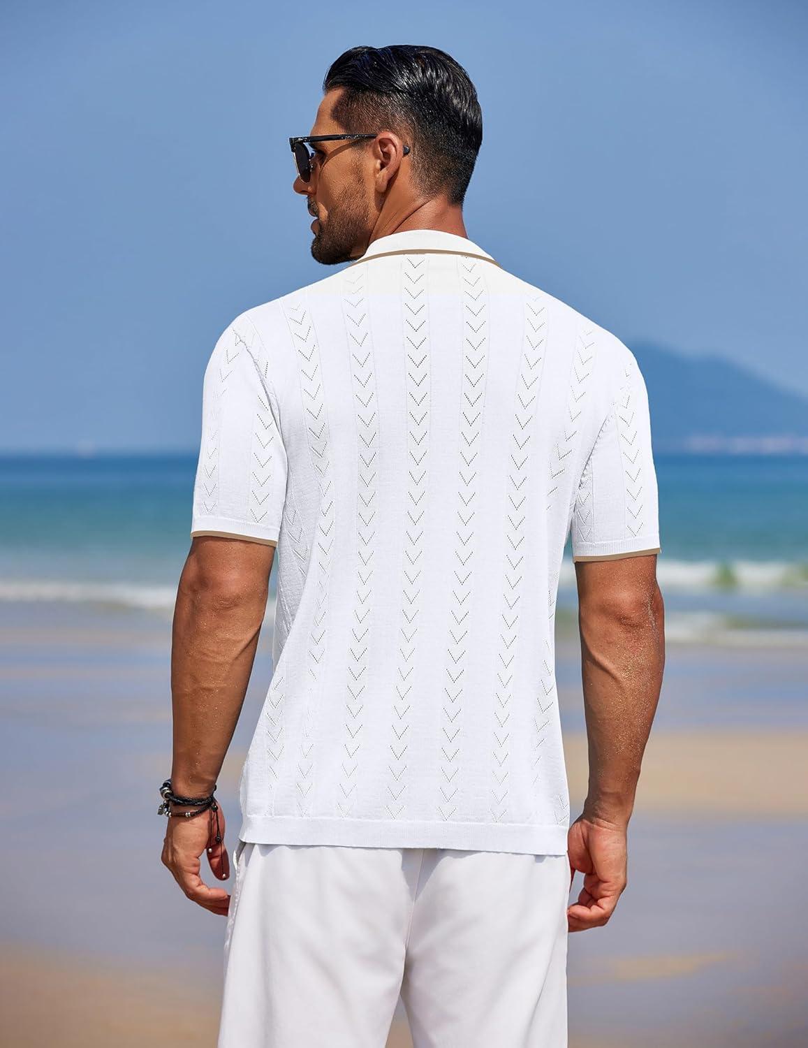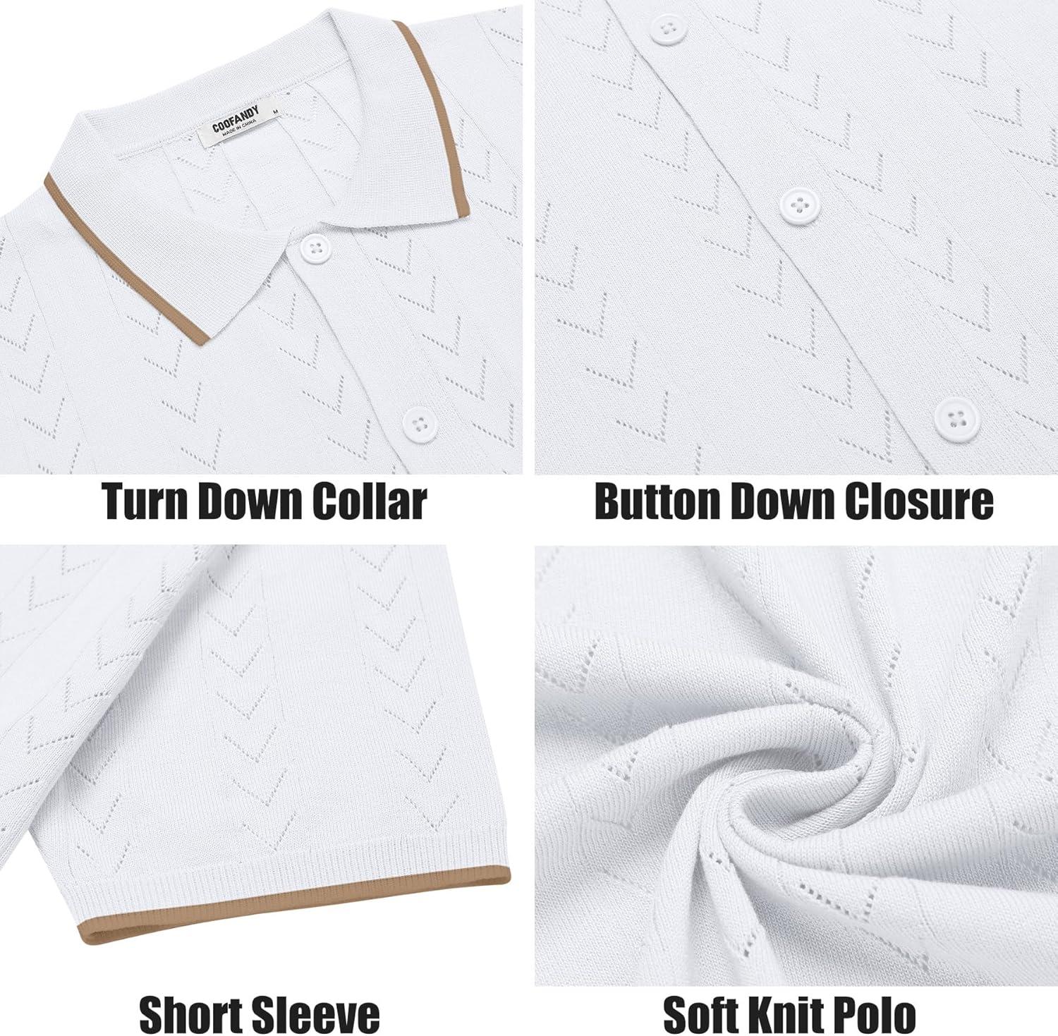 COOFANDY Mens Knit Polo Shirts Button Down Short Sleeve Shirt Summer Casual Beach Vacation Tops(White)