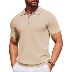 COOFANDY Mens Casual Quarter Zipper Knit Polo Shirts Short Sleeve Summer Beach Shirt Textured Jersey Tops(Khaki)