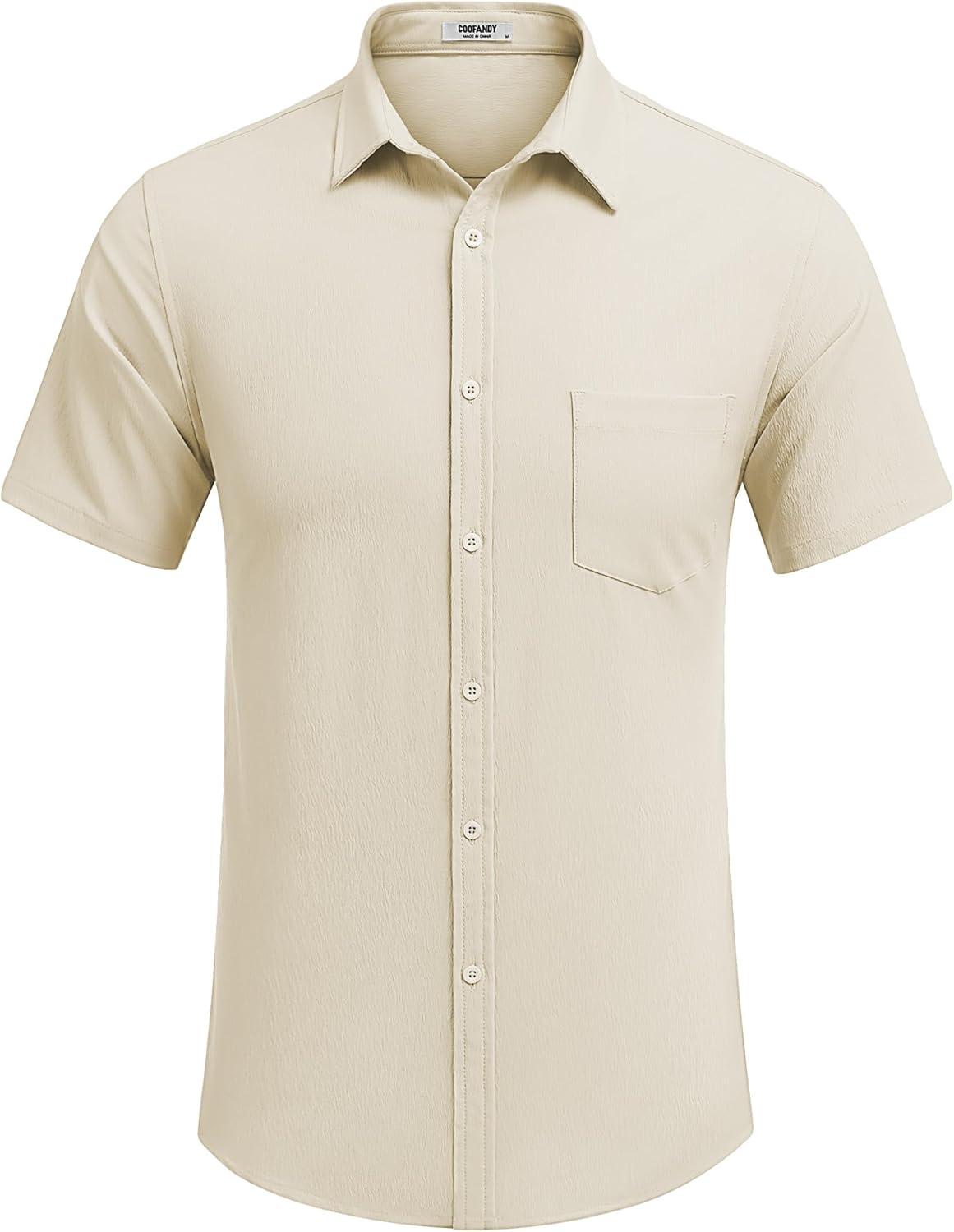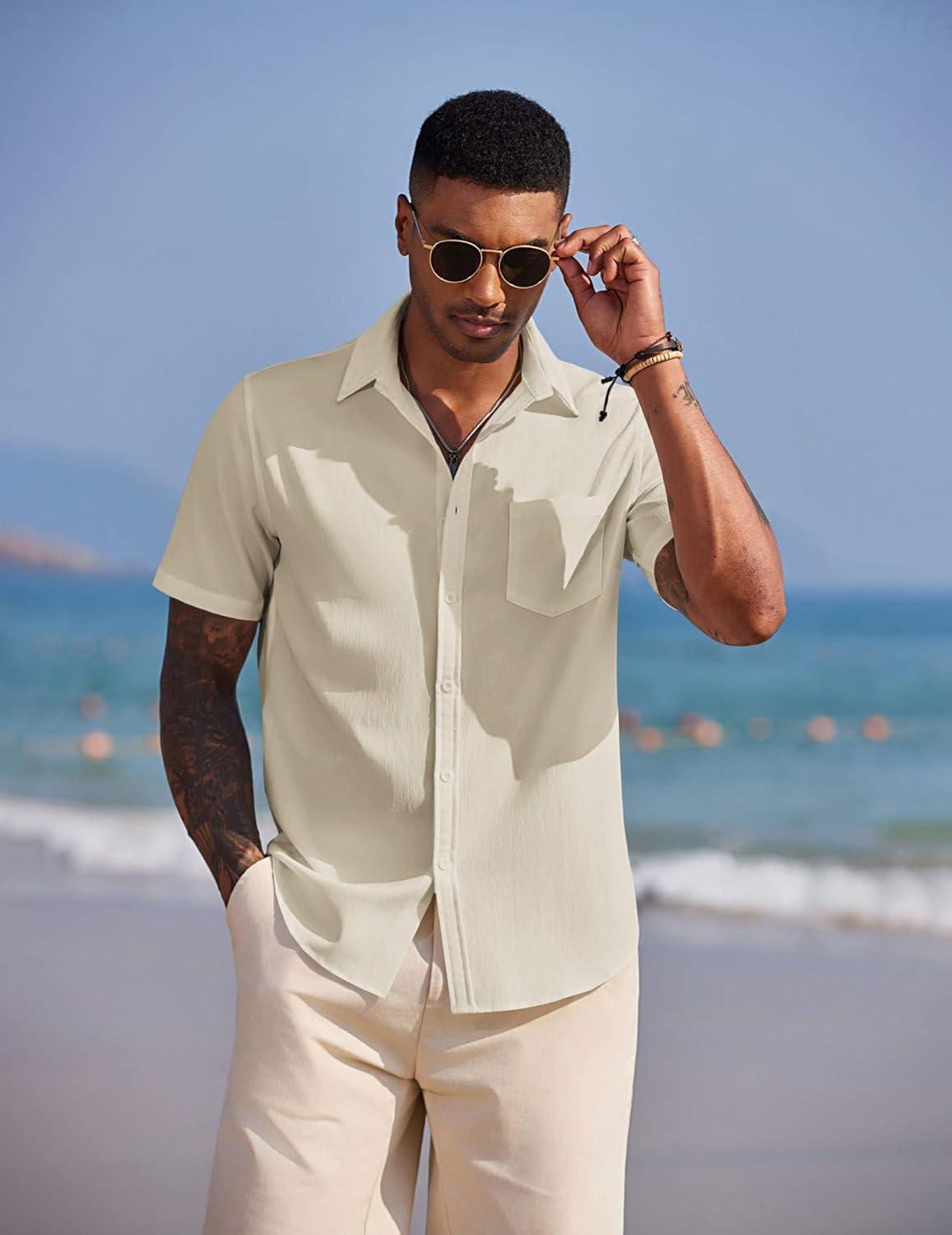 COOFANDY Men’s Casual Button Down Shirts Short Sleeve Textured Summer Beach Shirt with Pocket(Vanilla Ice)