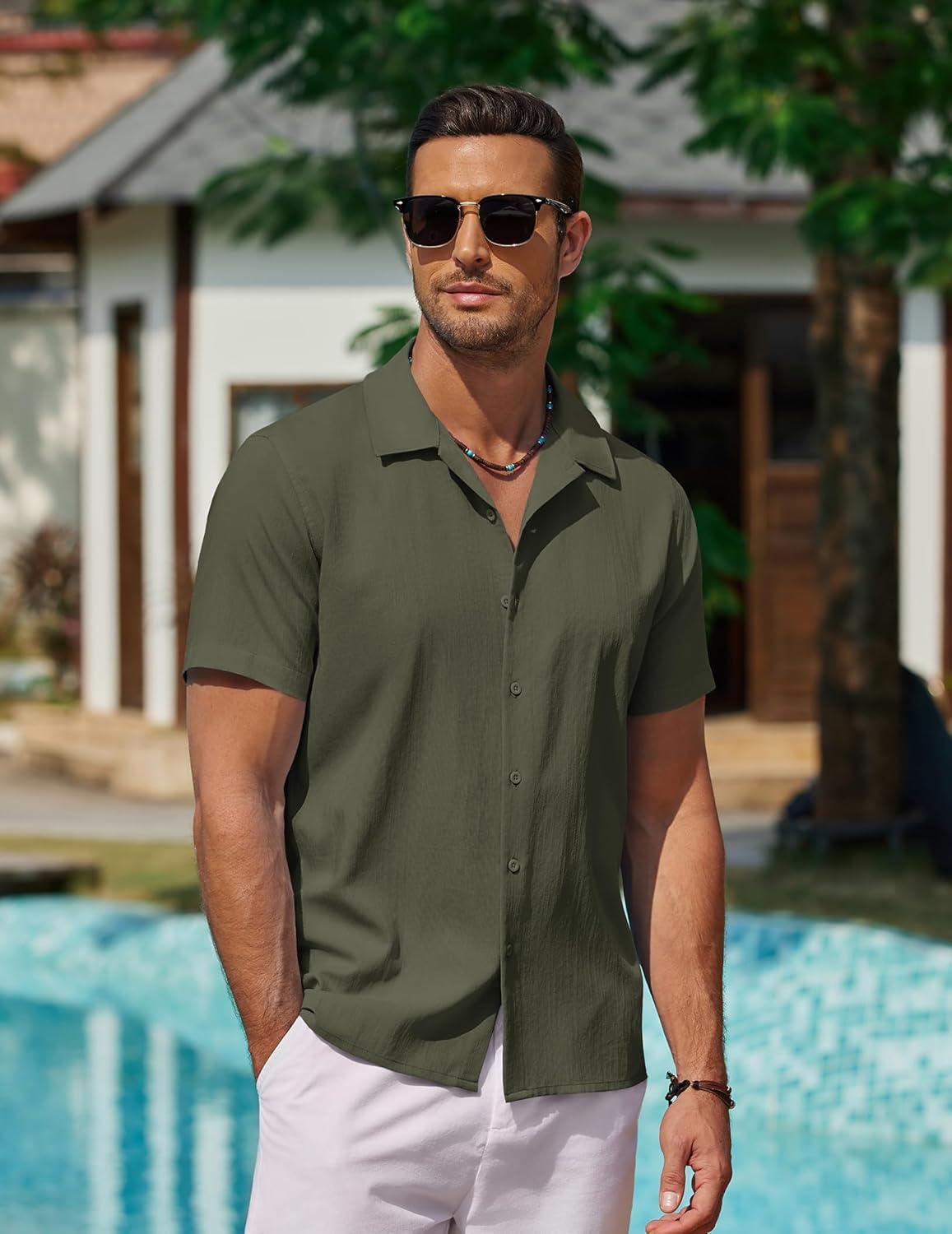 COOFANDY Men’s Casual Button Down Shirts Short Sleeve Textured Summer Beach Shirt with Pocket(Olive Green)