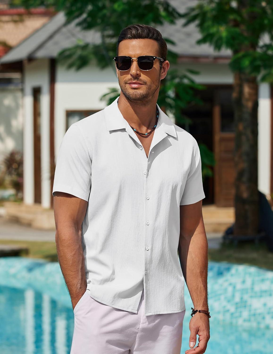 COOFANDY Men’s Casual Button Down Shirts Short Sleeve Textured Summer Beach Shirt with Pocket(White)
