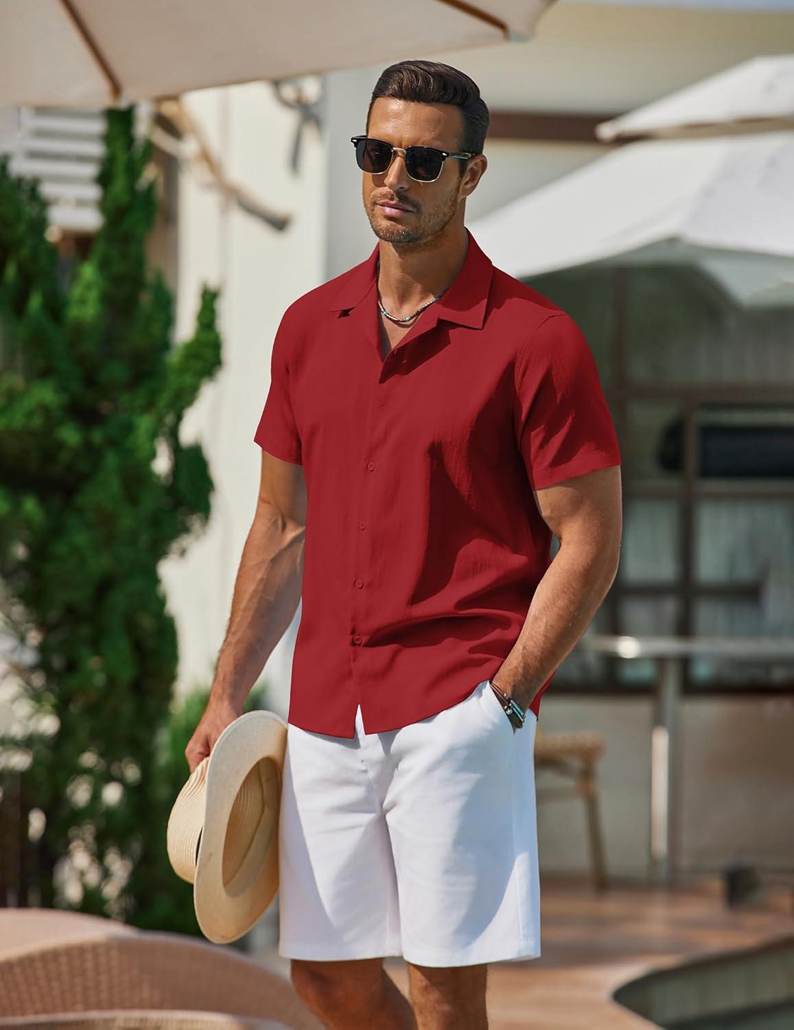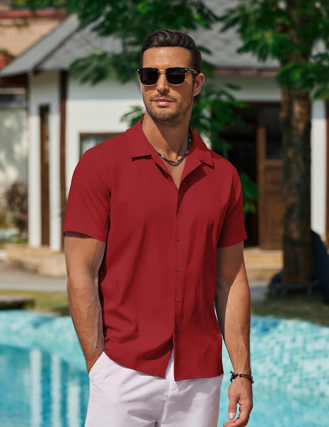 COOFANDY Men’s Casual Button Down Shirts Short Sleeve Textured Summer Beach Shirt with Pocket(Wine Red)
