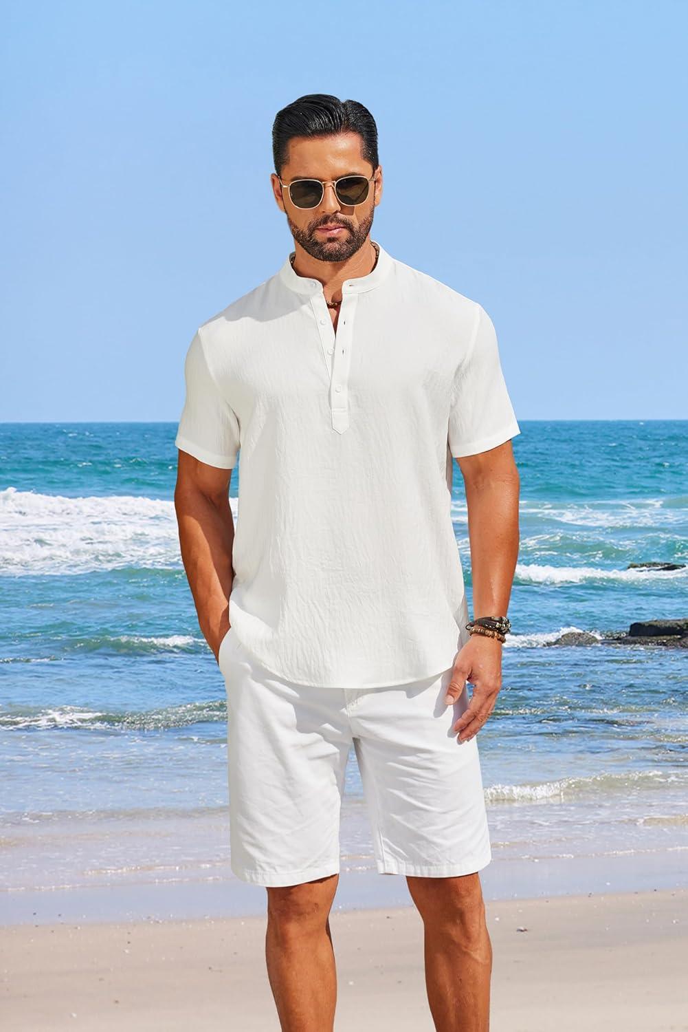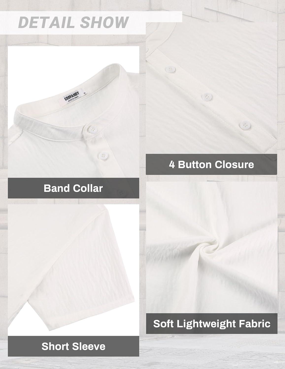 COOFANDY Men’s Casual Henley Shirt Short Sleeve Linen Shirt Band Collar Summer Hippie Beach T-Shirts(1-white)