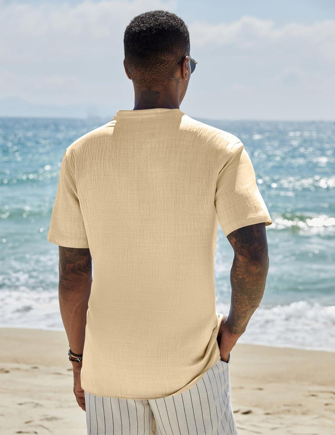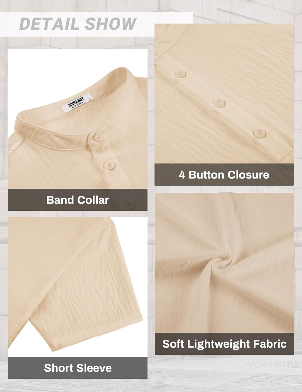 COOFANDY Men’s Casual Henley Shirt Short Sleeve Linen Shirt Band Collar Summer Hippie Beach T-Shirts(Beige)
