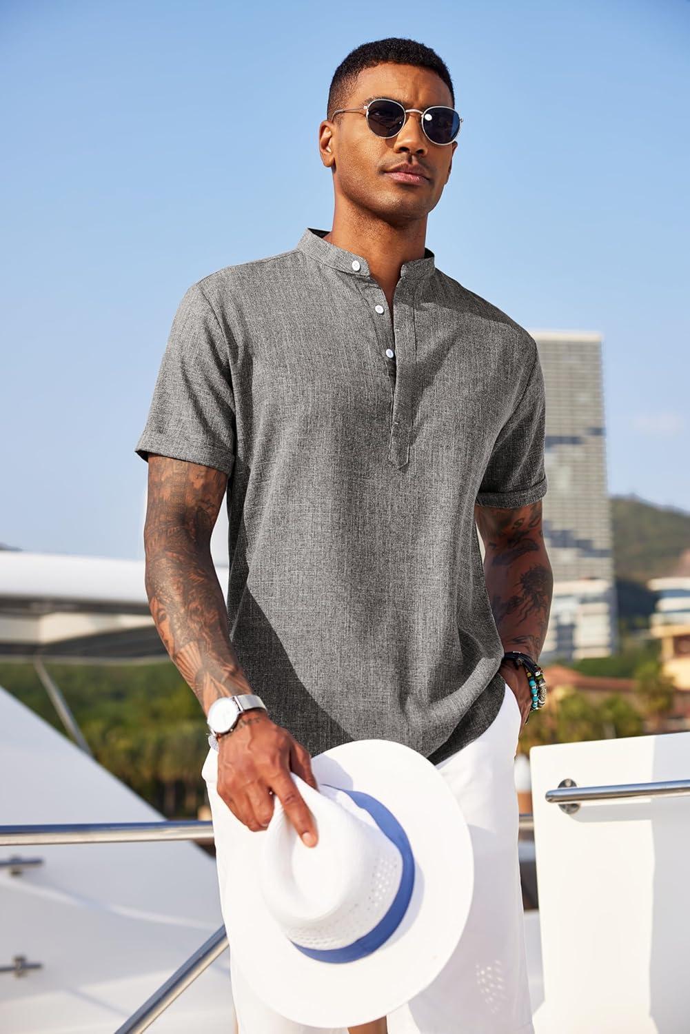 COOFANDY Men’s Casual Henley Shirt Short Sleeve Linen Shirt Band Collar Summer Hippie Beach T-Shirts(Dark Grey)