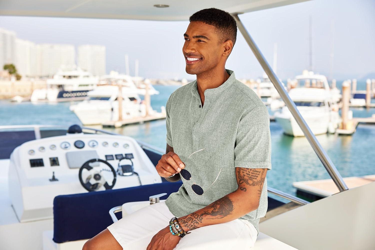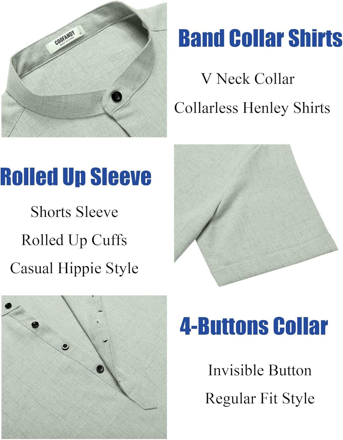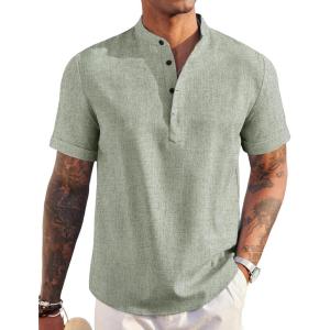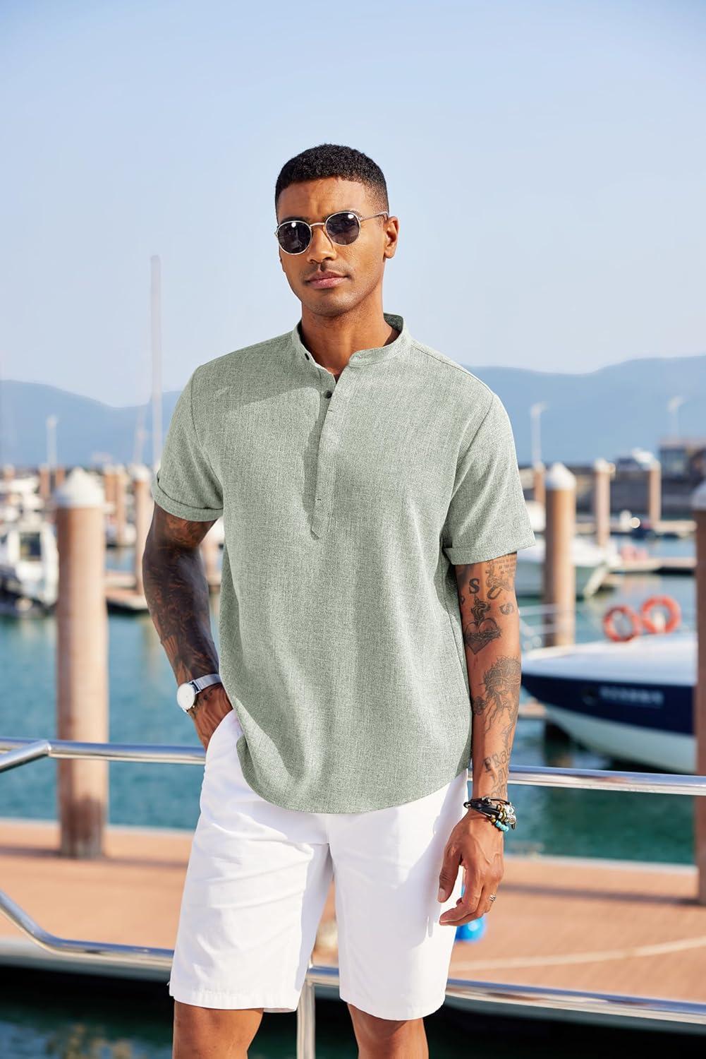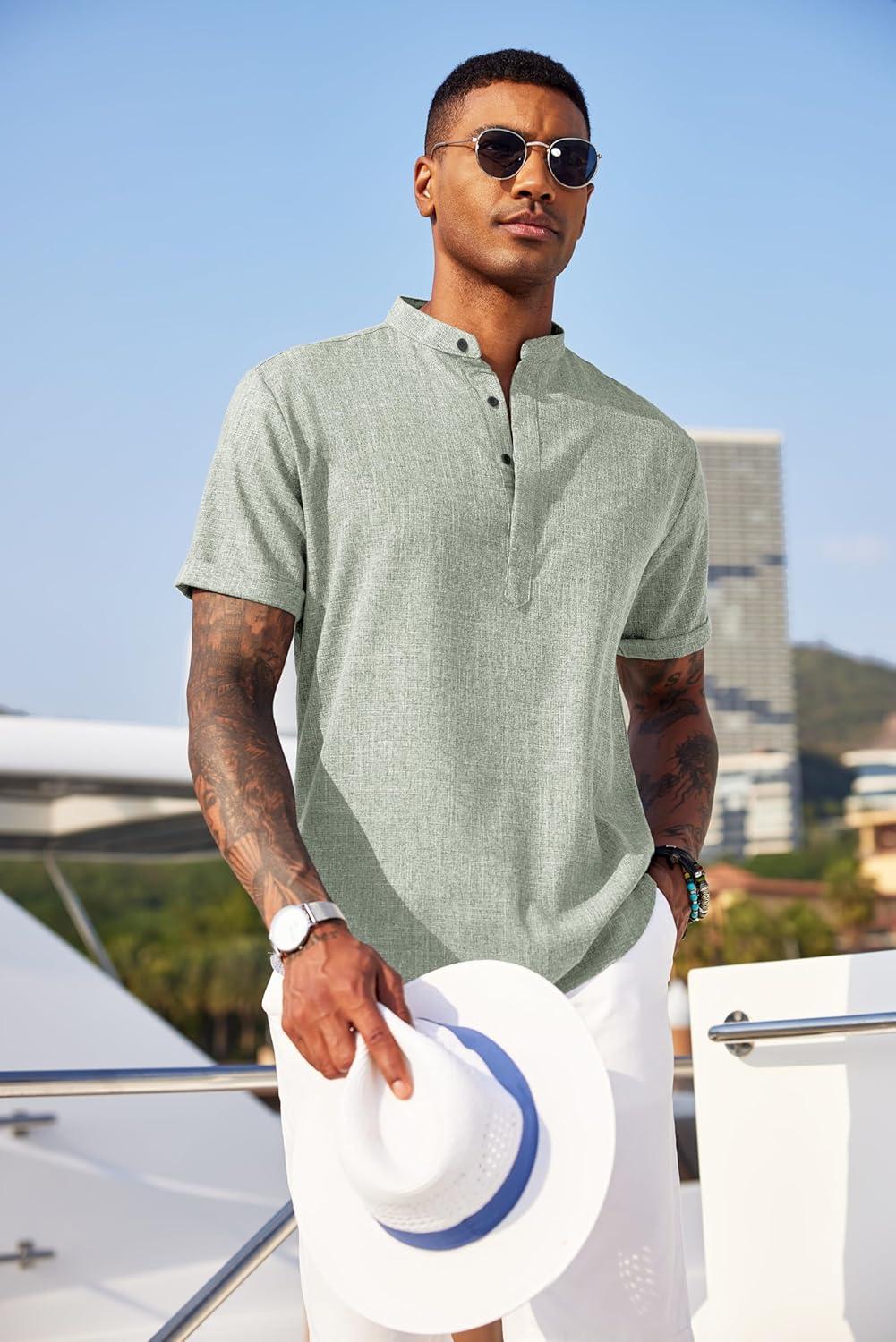 COOFANDY Men’s Casual Henley Shirt Short Sleeve Linen Shirt Band Collar Summer Hippie Beach T-Shirts(Light Green)