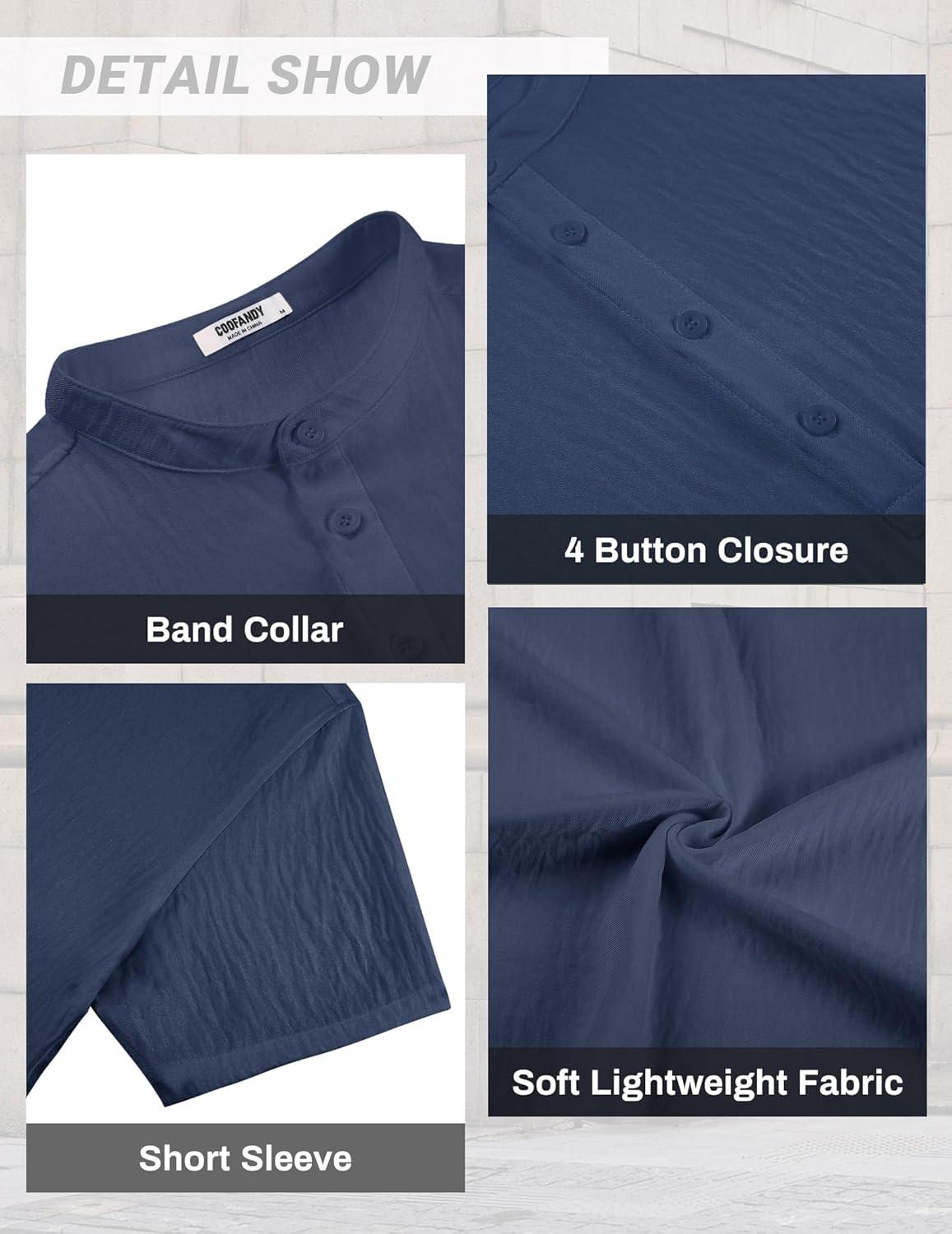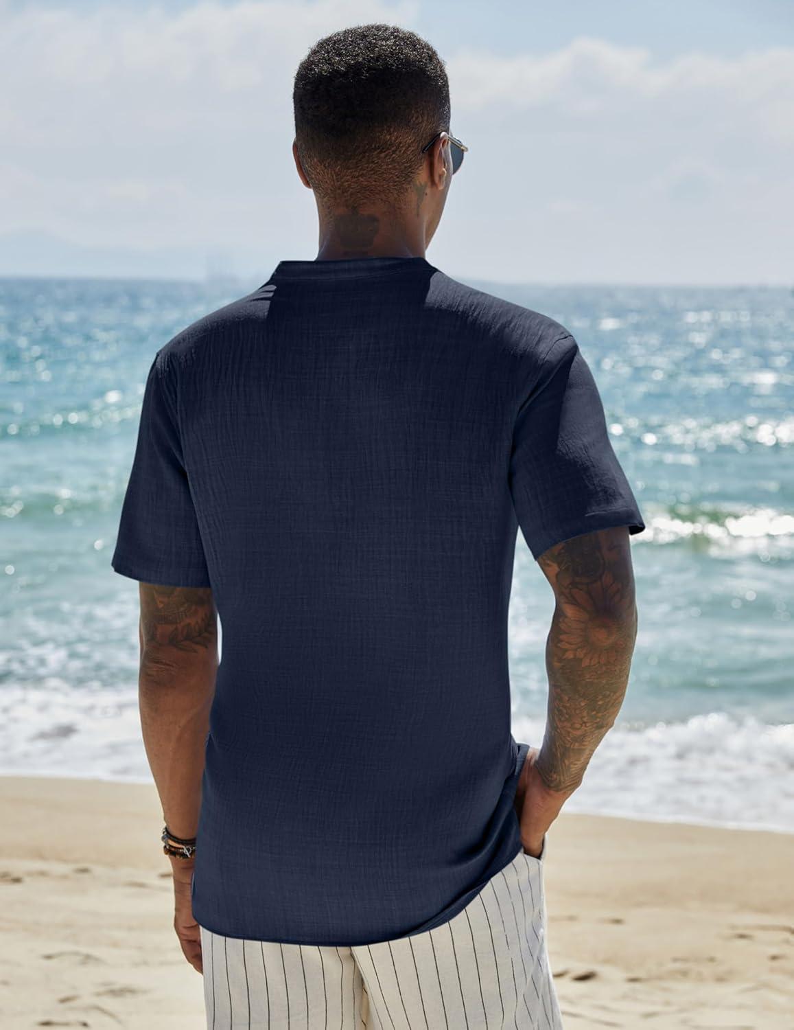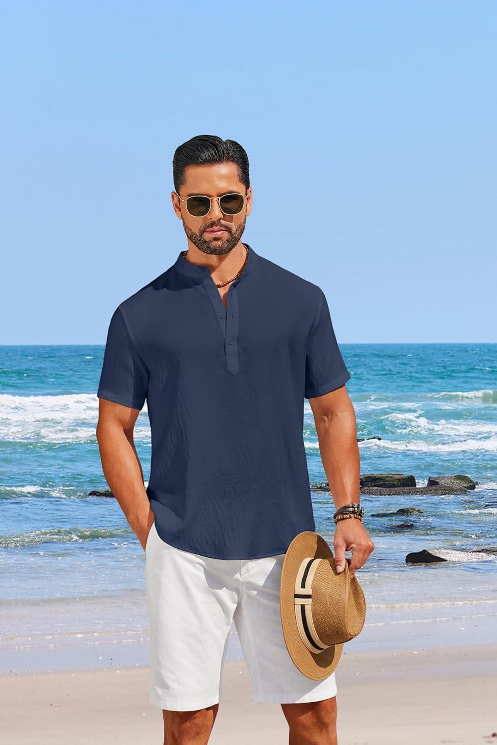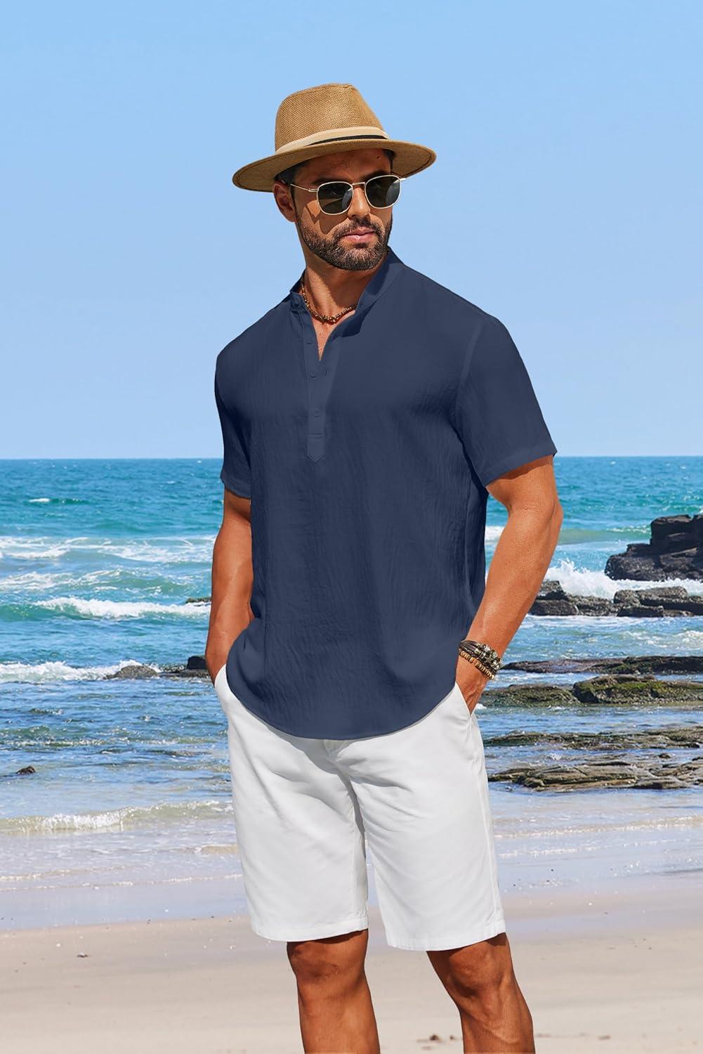 COOFANDY Men’s Casual Henley Shirt Short Sleeve Linen Shirt Band Collar Summer Hippie Beach T-Shirts(Navy Blue)