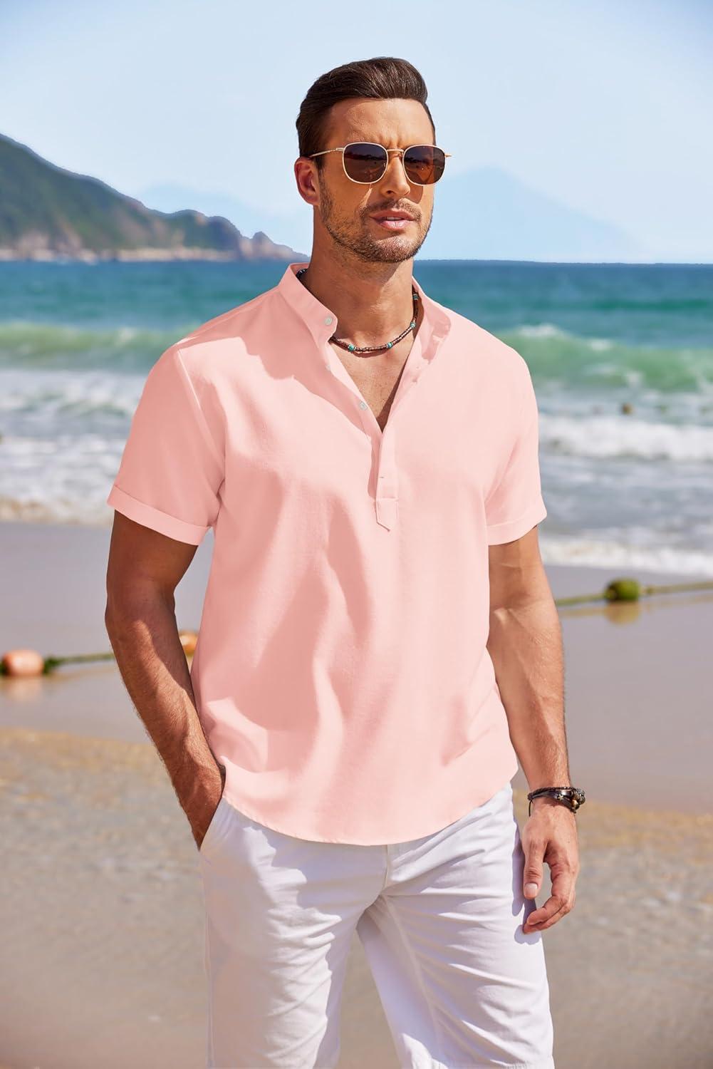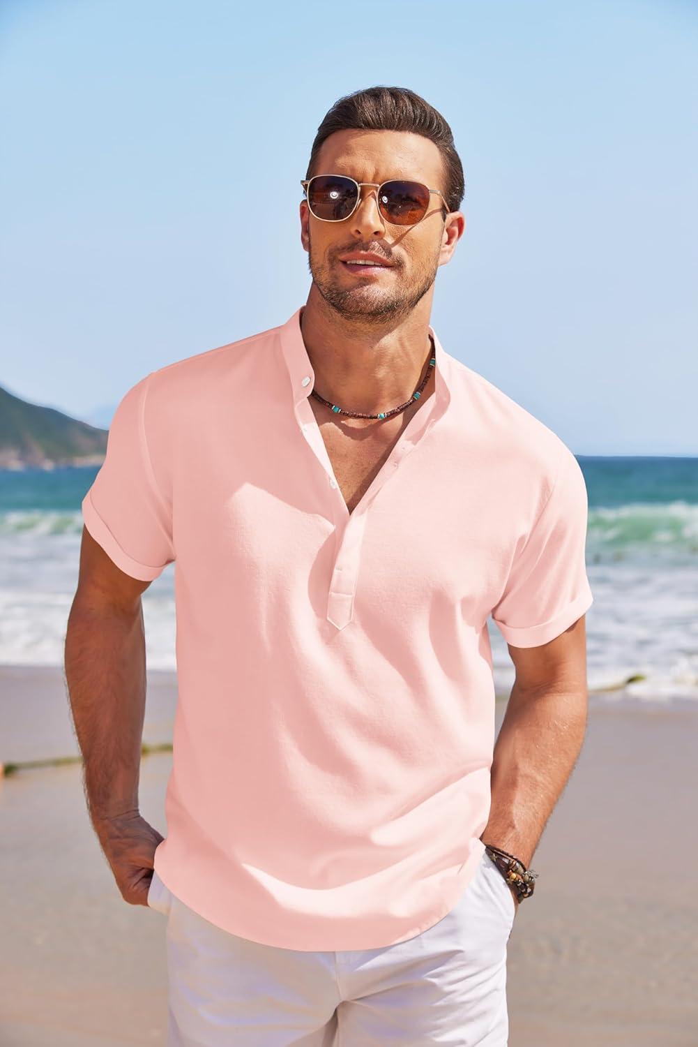 COOFANDY Men’s Casual Henley Shirt Short Sleeve Linen Shirt Band Collar Summer Hippie Beach T-Shirts(Pink)