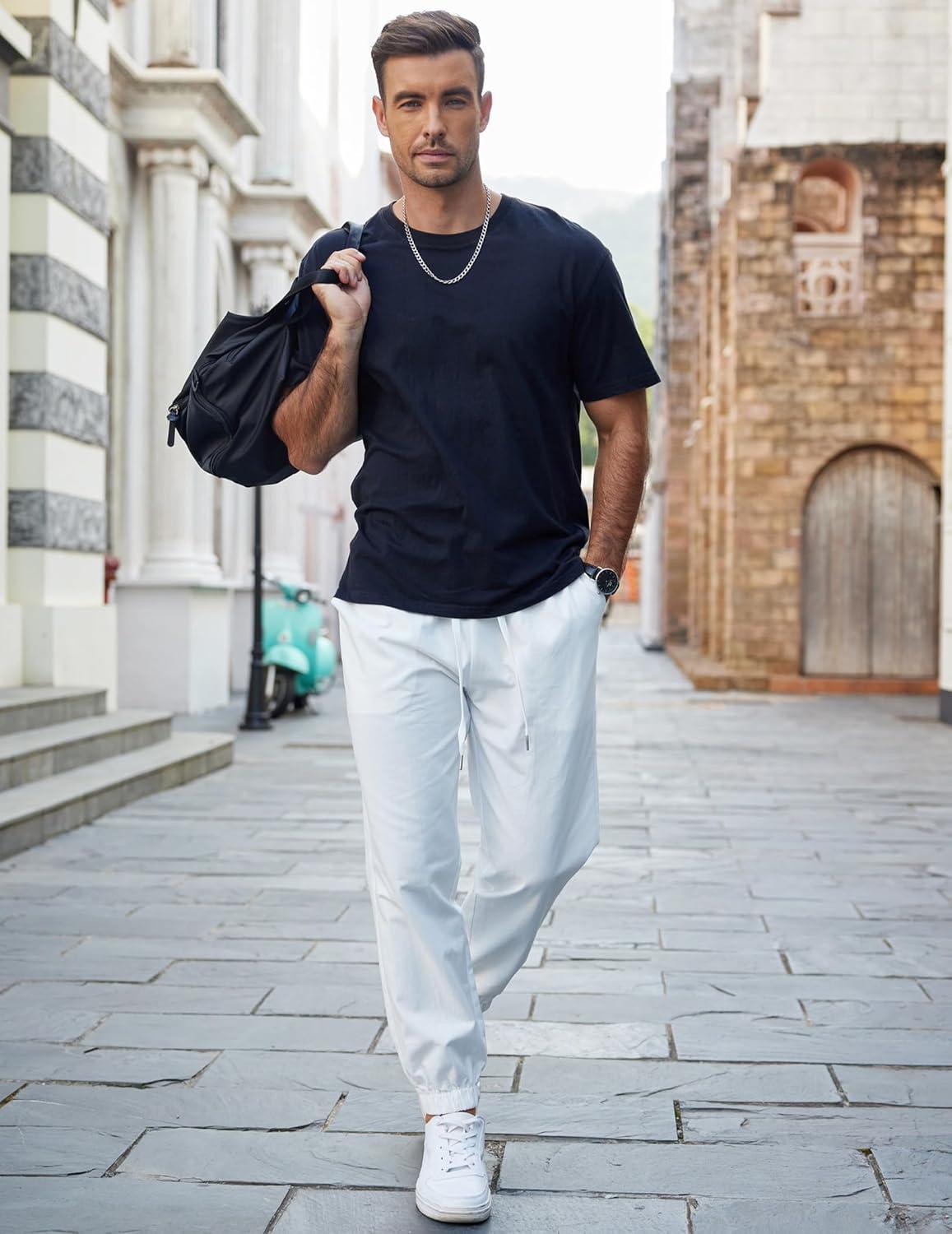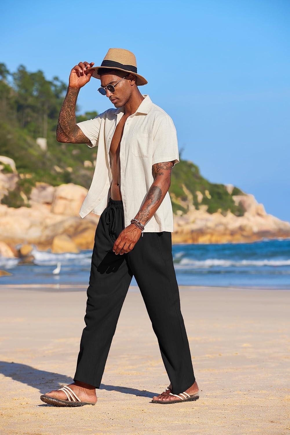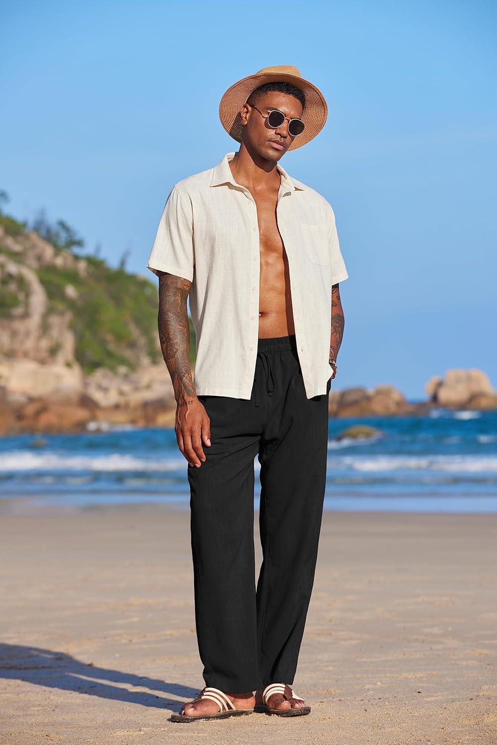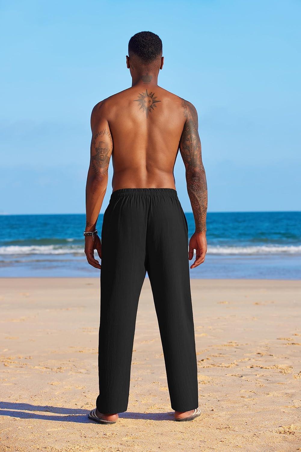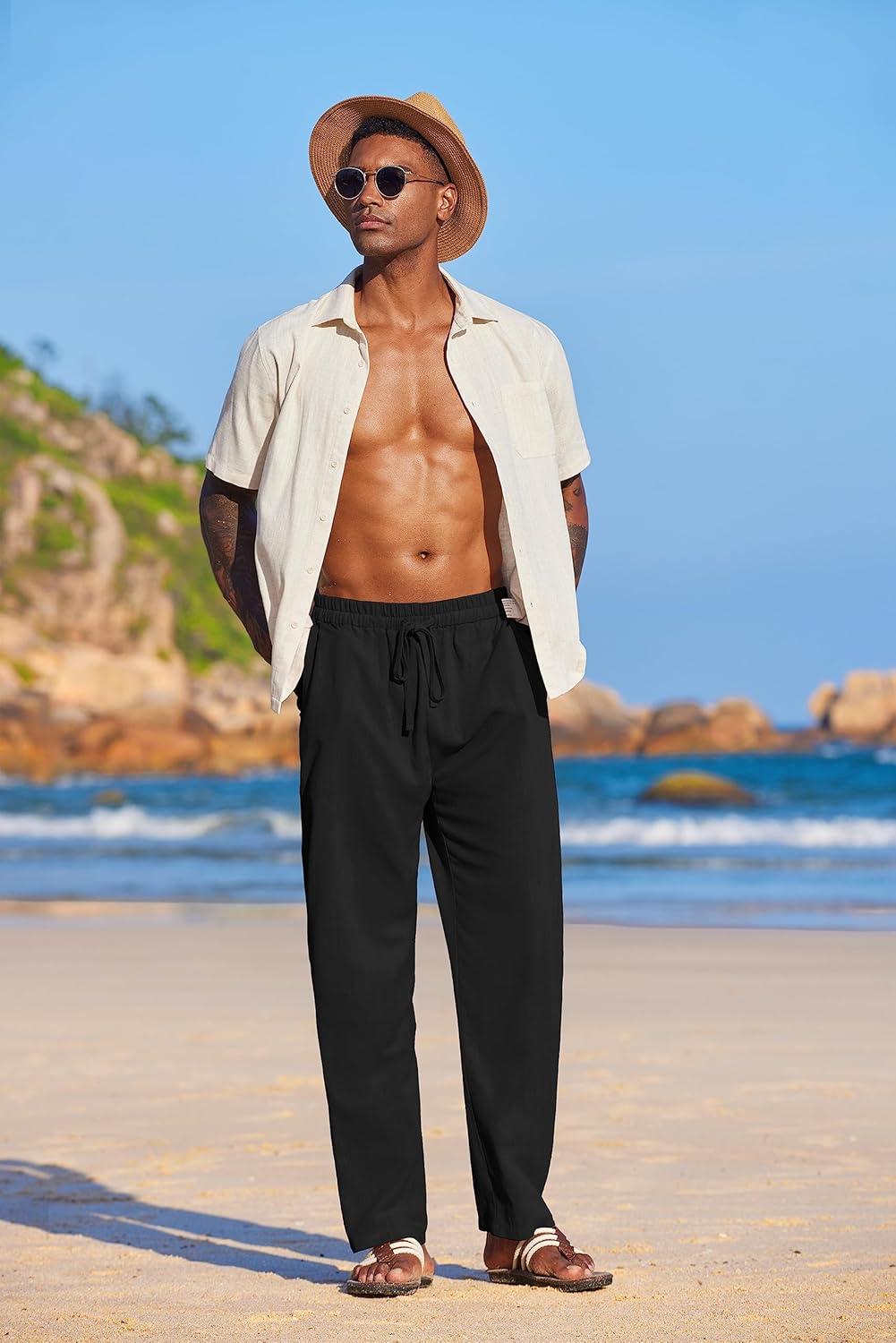 COOFANDY Men’s Casual Linen Summer Beach Pants Lightweight Drawstring Elastic Waist Yoga Trousers(Black)