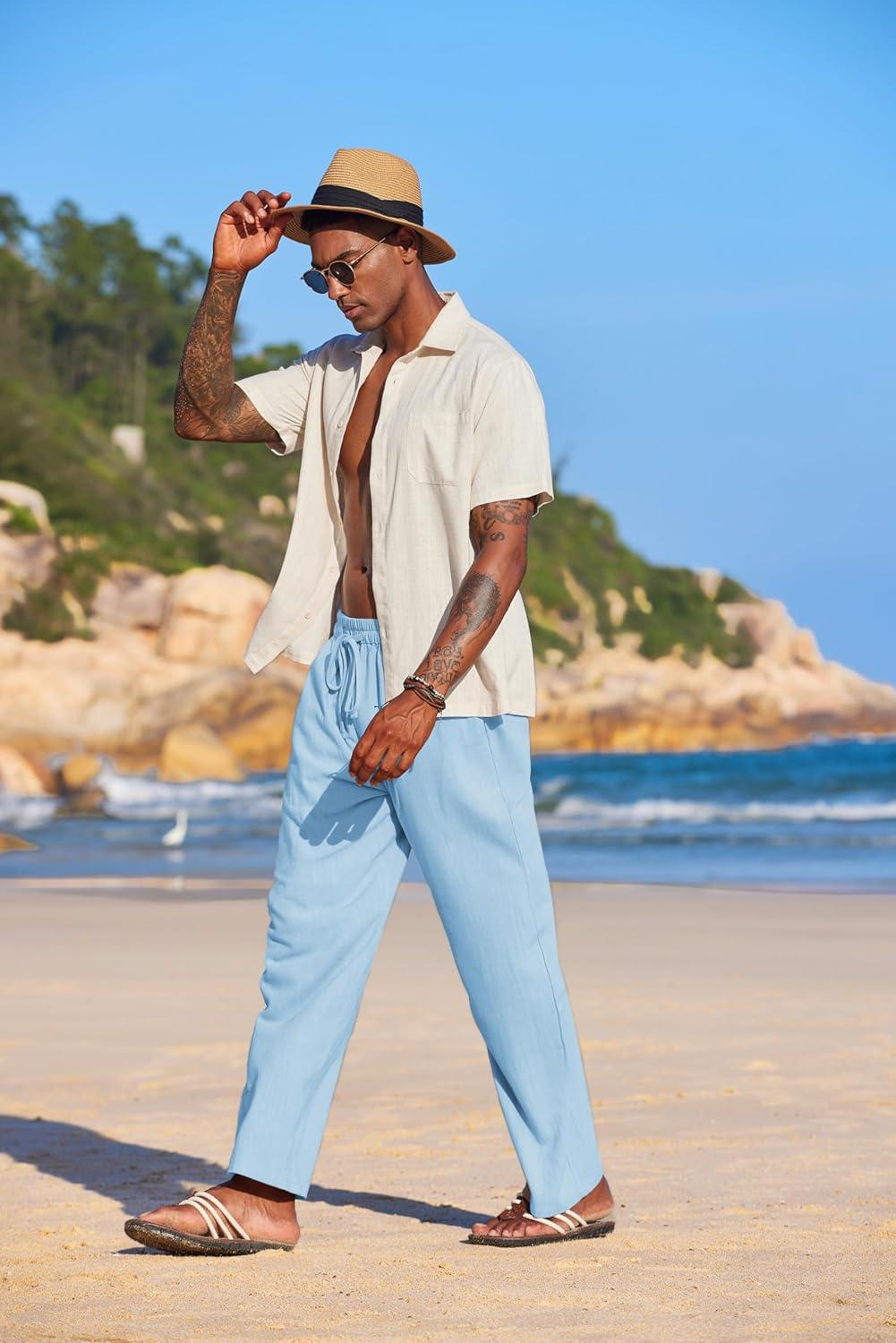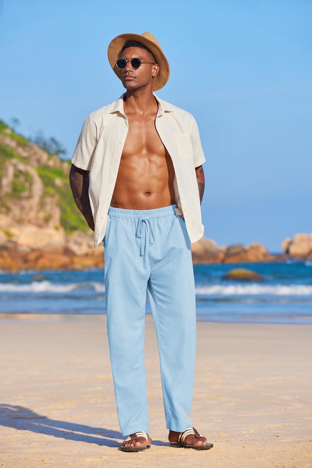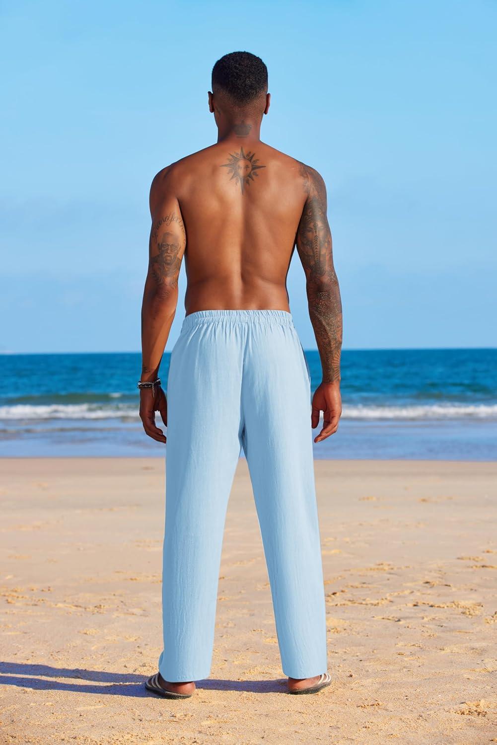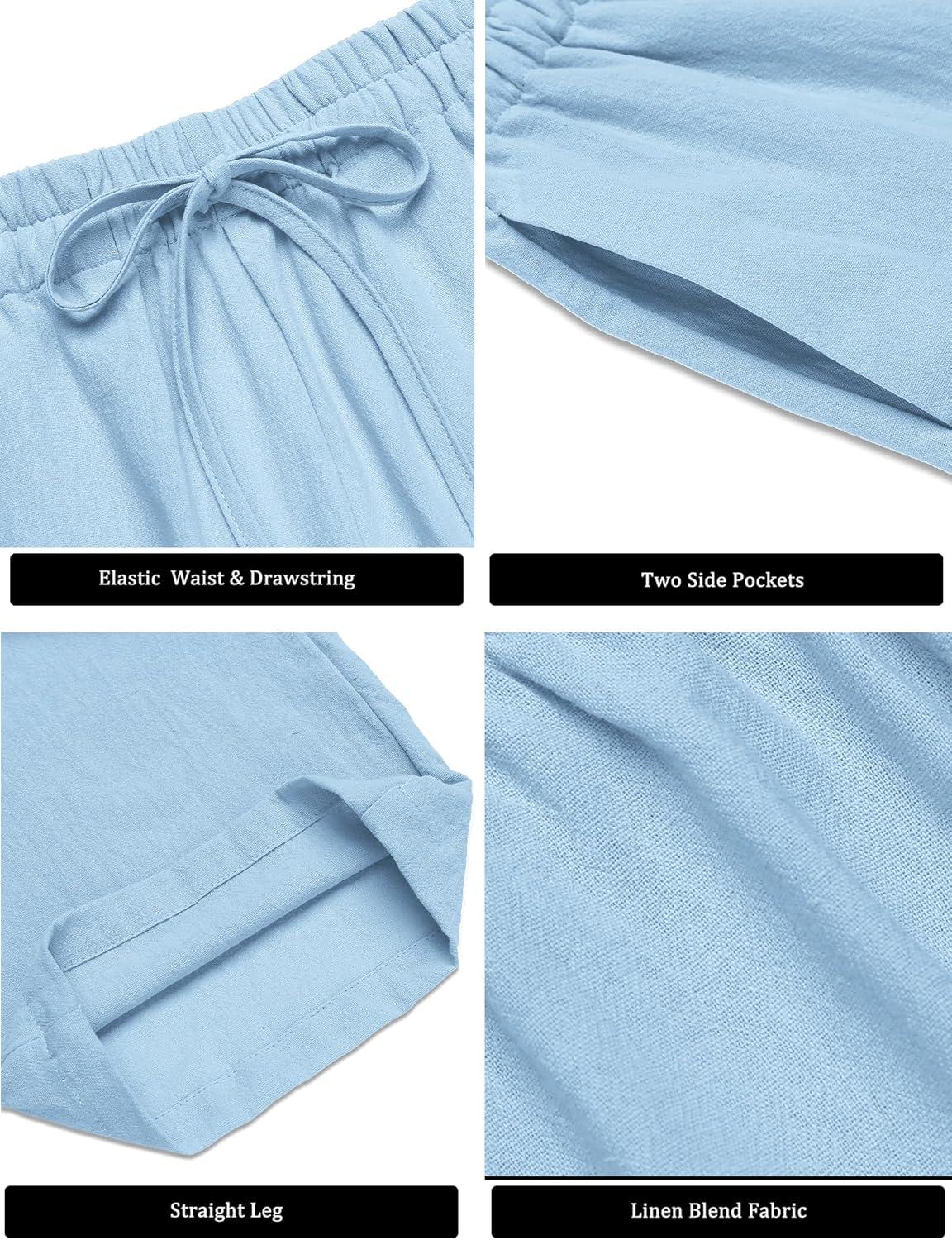 COOFANDY Men’s Casual Linen Summer Beach Pants Lightweight Drawstring Elastic Waist Yoga Trousers(Light Blue)