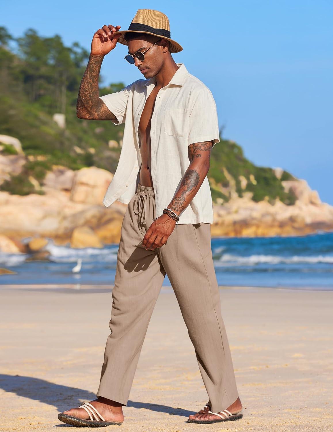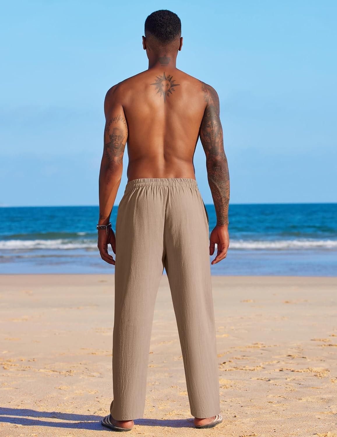 COOFANDY Men’s Casual Linen Summer Beach Pants Lightweight Drawstring Elastic Waist Yoga Trousers(Khaki)