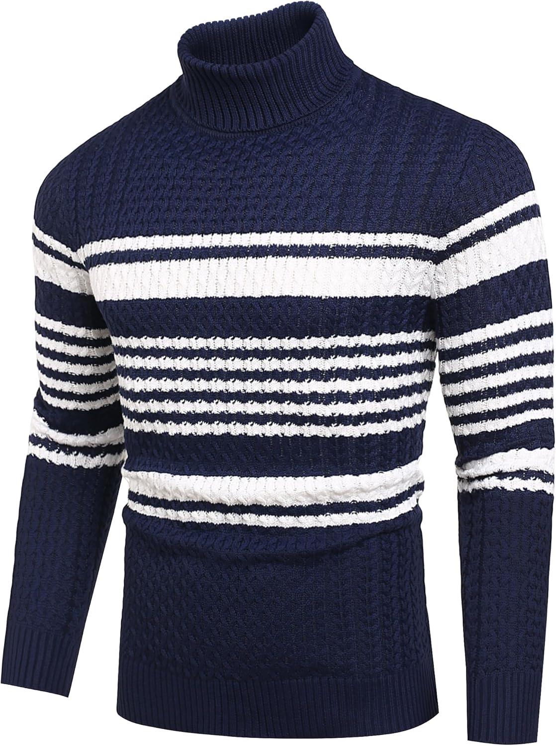 COOFANDY Men’s Slim Fit Turtleneck Sweaters Casual Cable Knitted Soft Pullover Sweaters(Navy Blue/White Stripes)