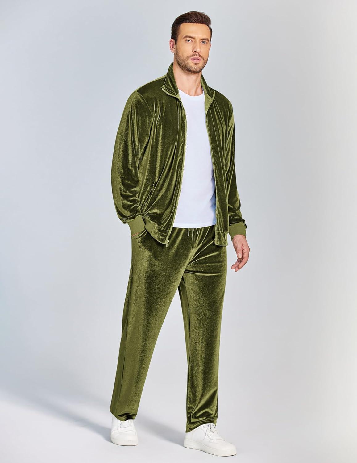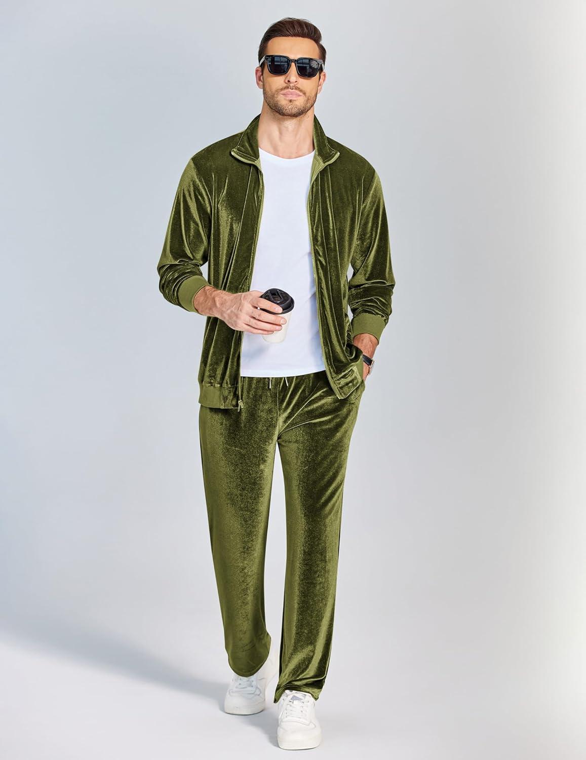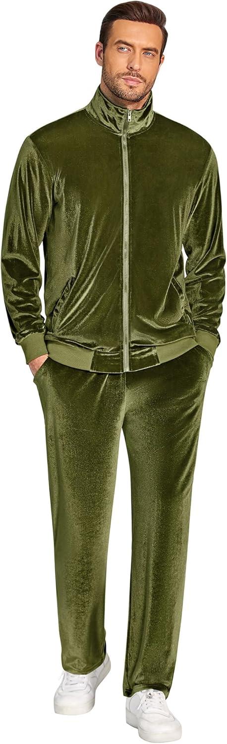 COOFANDY Mens 2 Piece Velour Tracksuit Full Zip Jackets Pants Velvet Jogging Suits Sweatsuit Set(Olive Green)