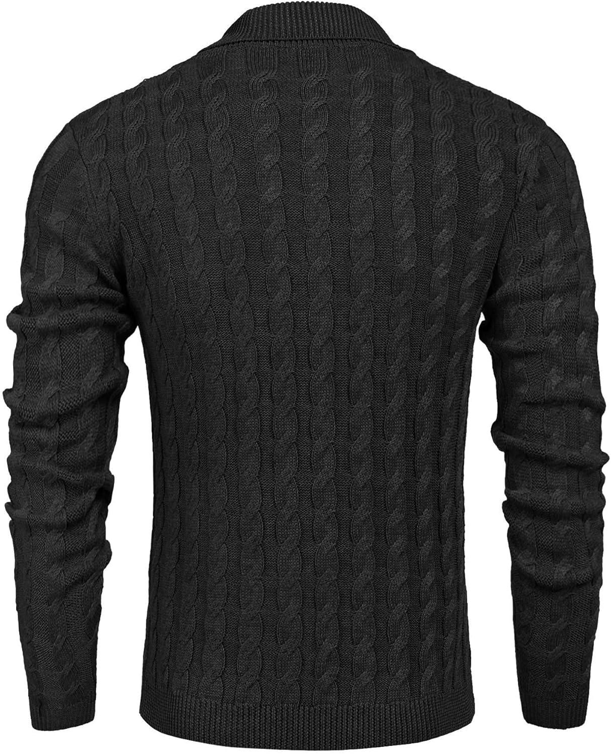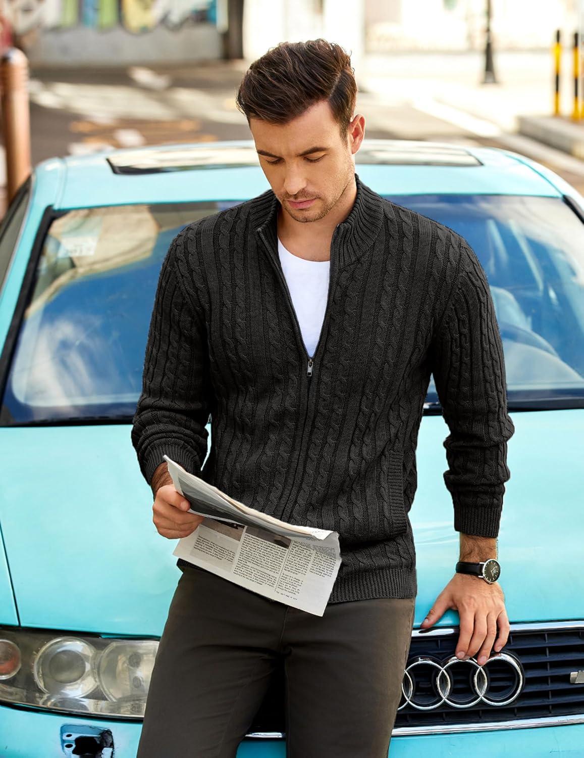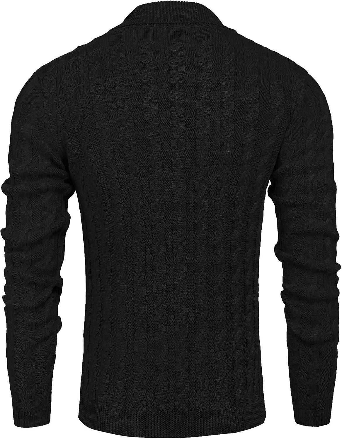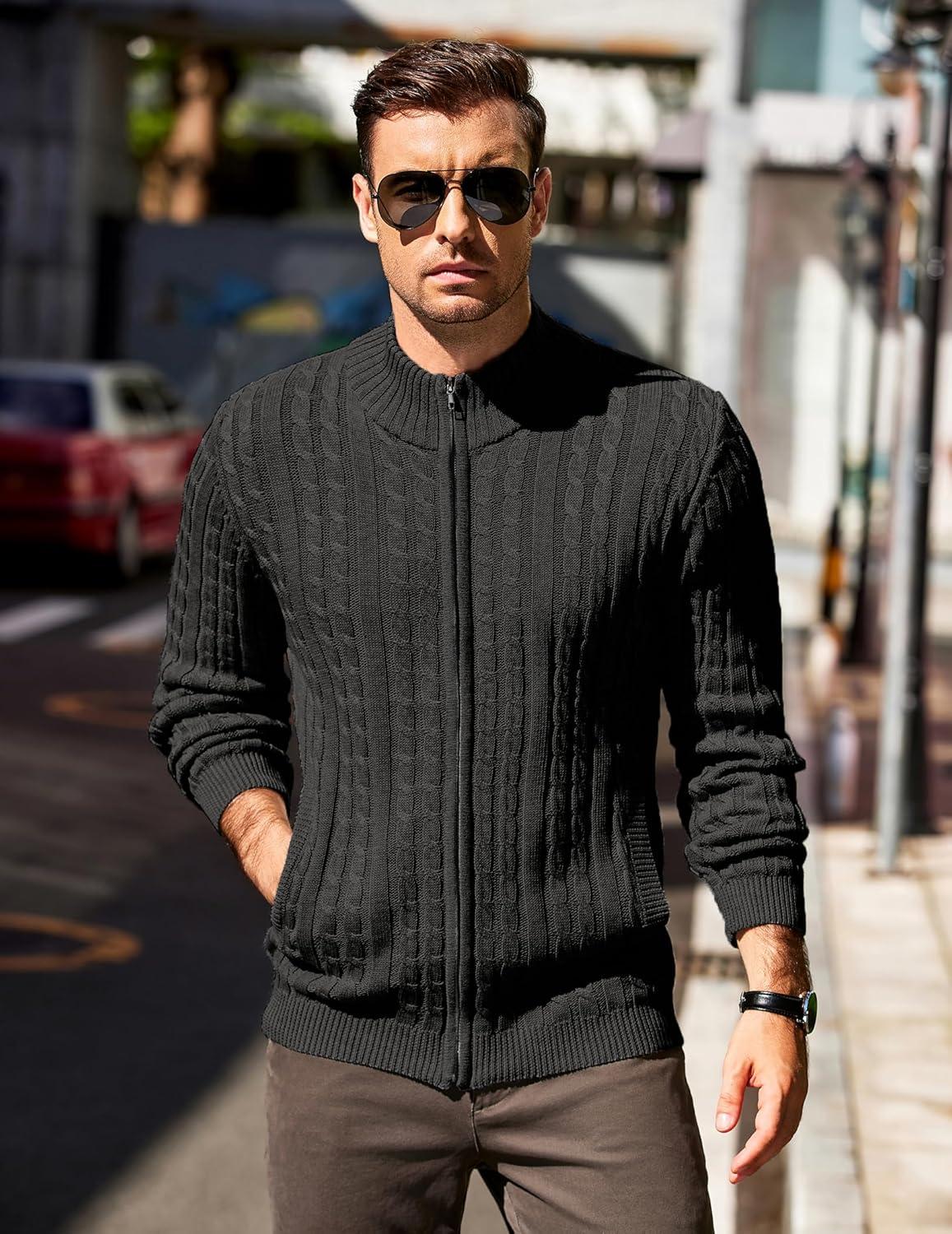 COOFANDY Men’s Full Zip Cardigan Sweater Slim Fit Cable Knitted Zip Up Sweater with Pockets(Black)