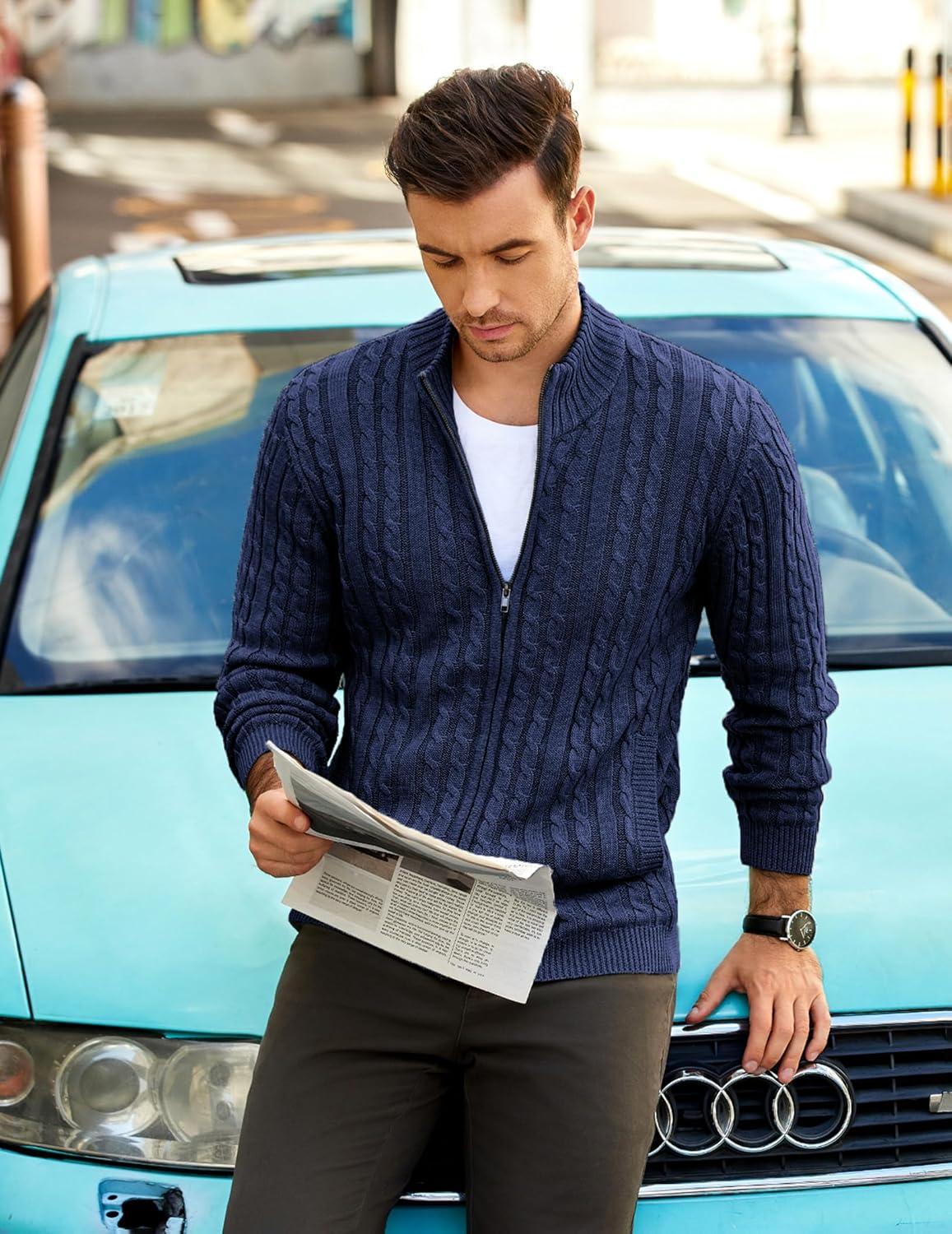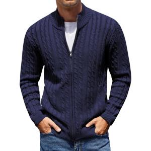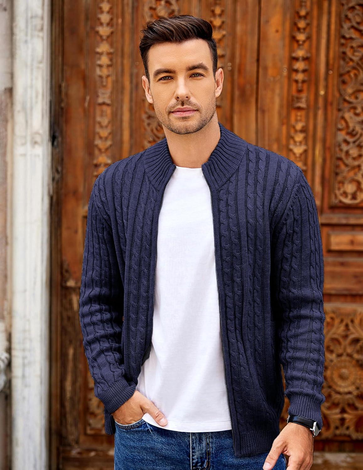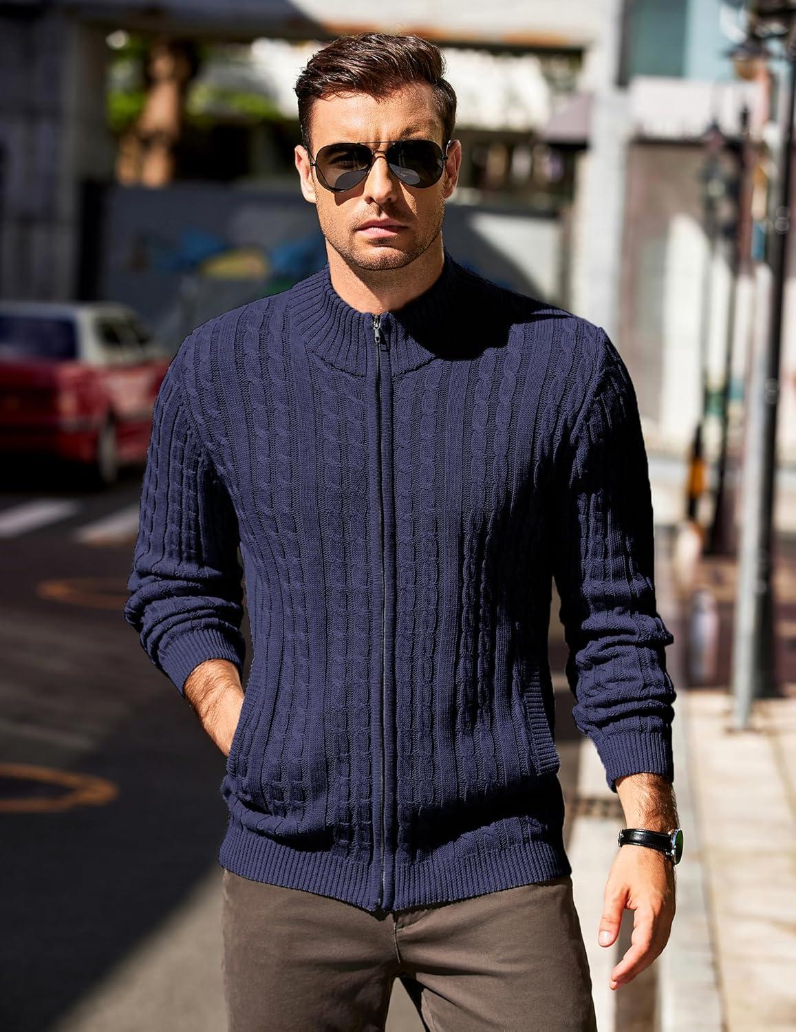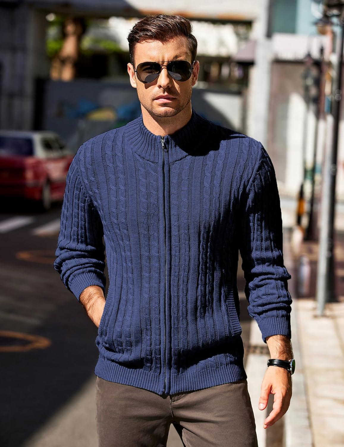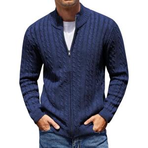 COOFANDY Men’s Full Zip Cardigan Sweater Slim Fit Cable Knitted Zip Up Sweater with Pockets(Deep Blue)