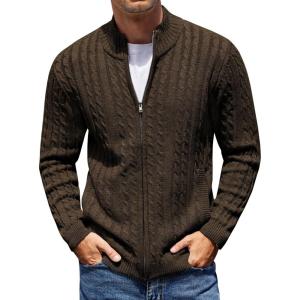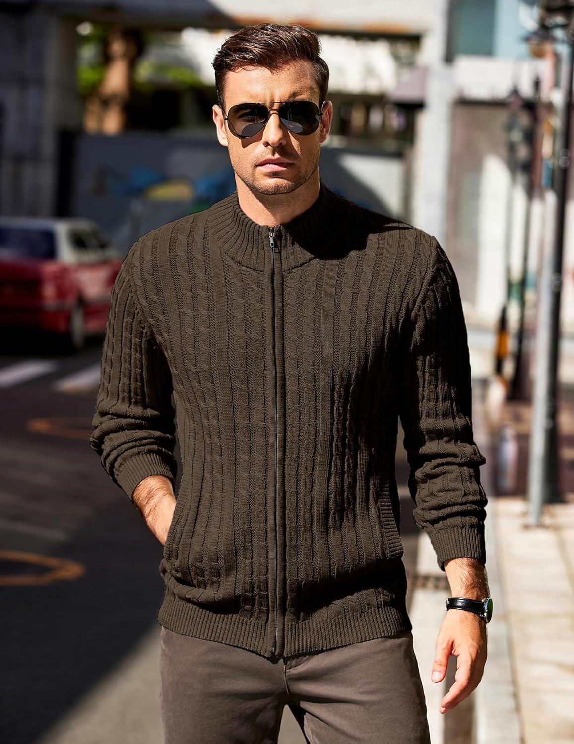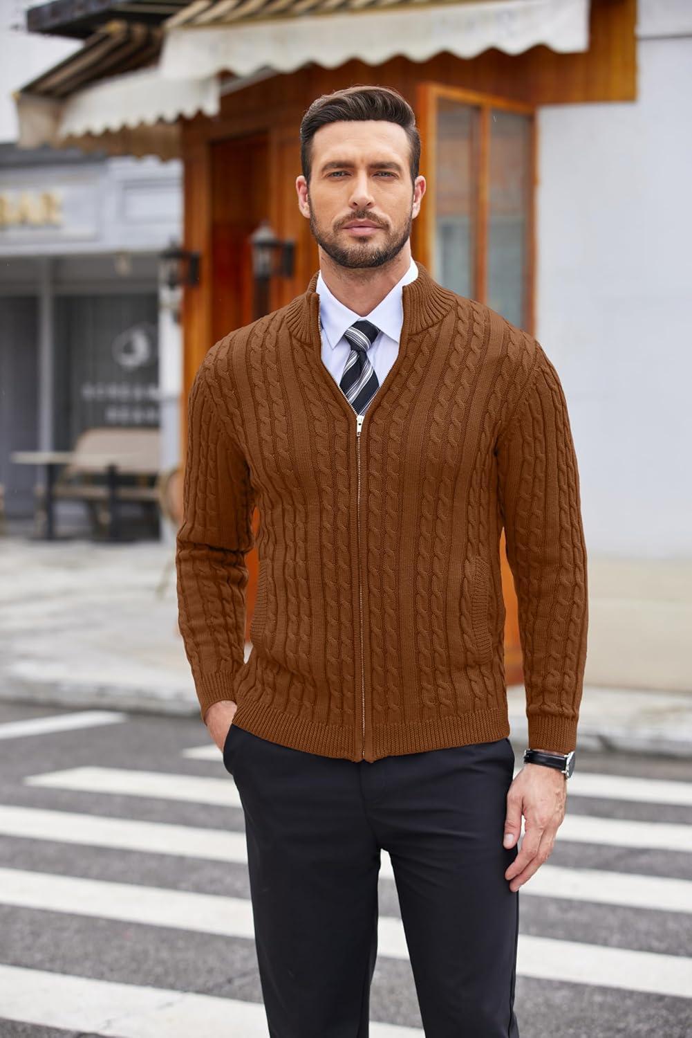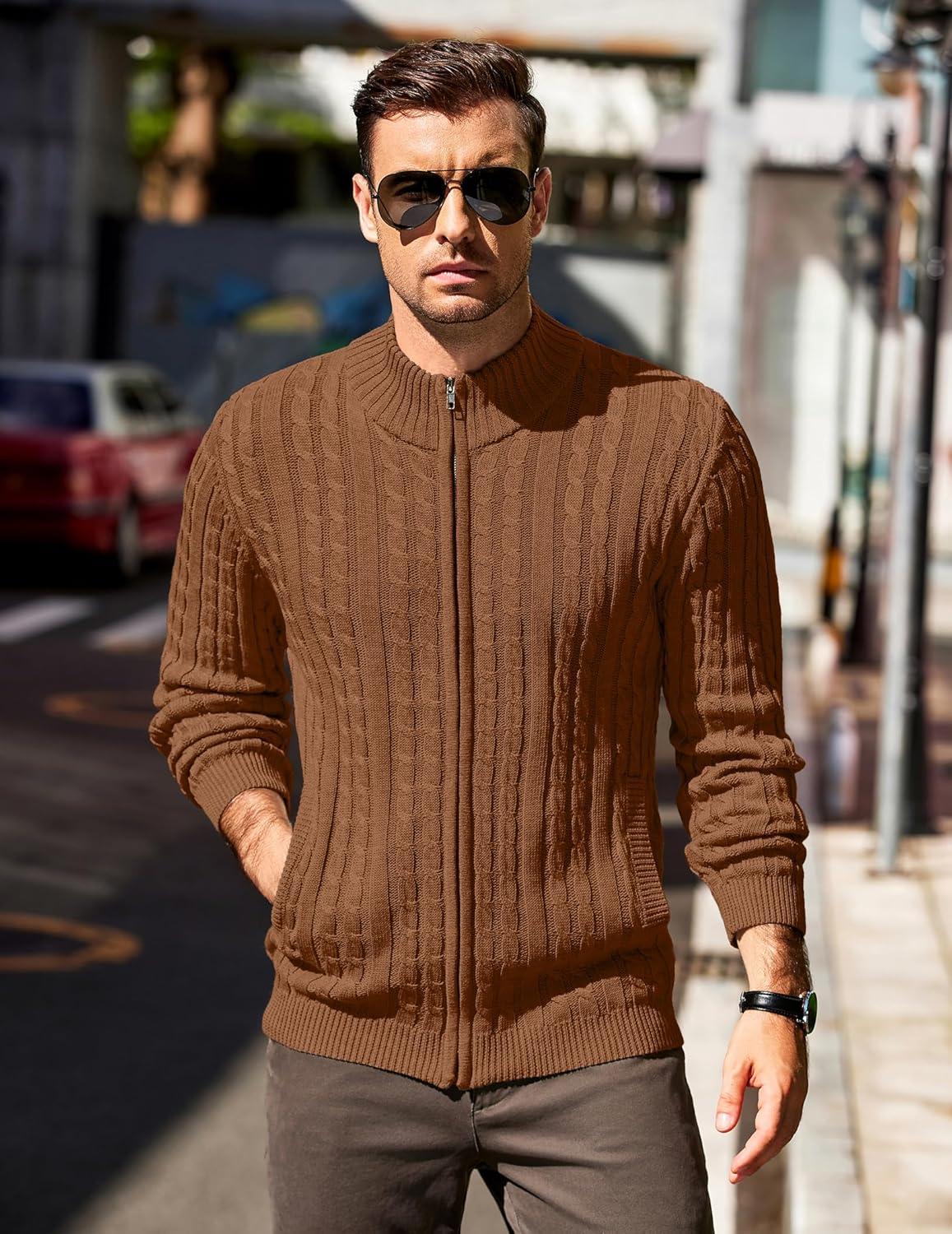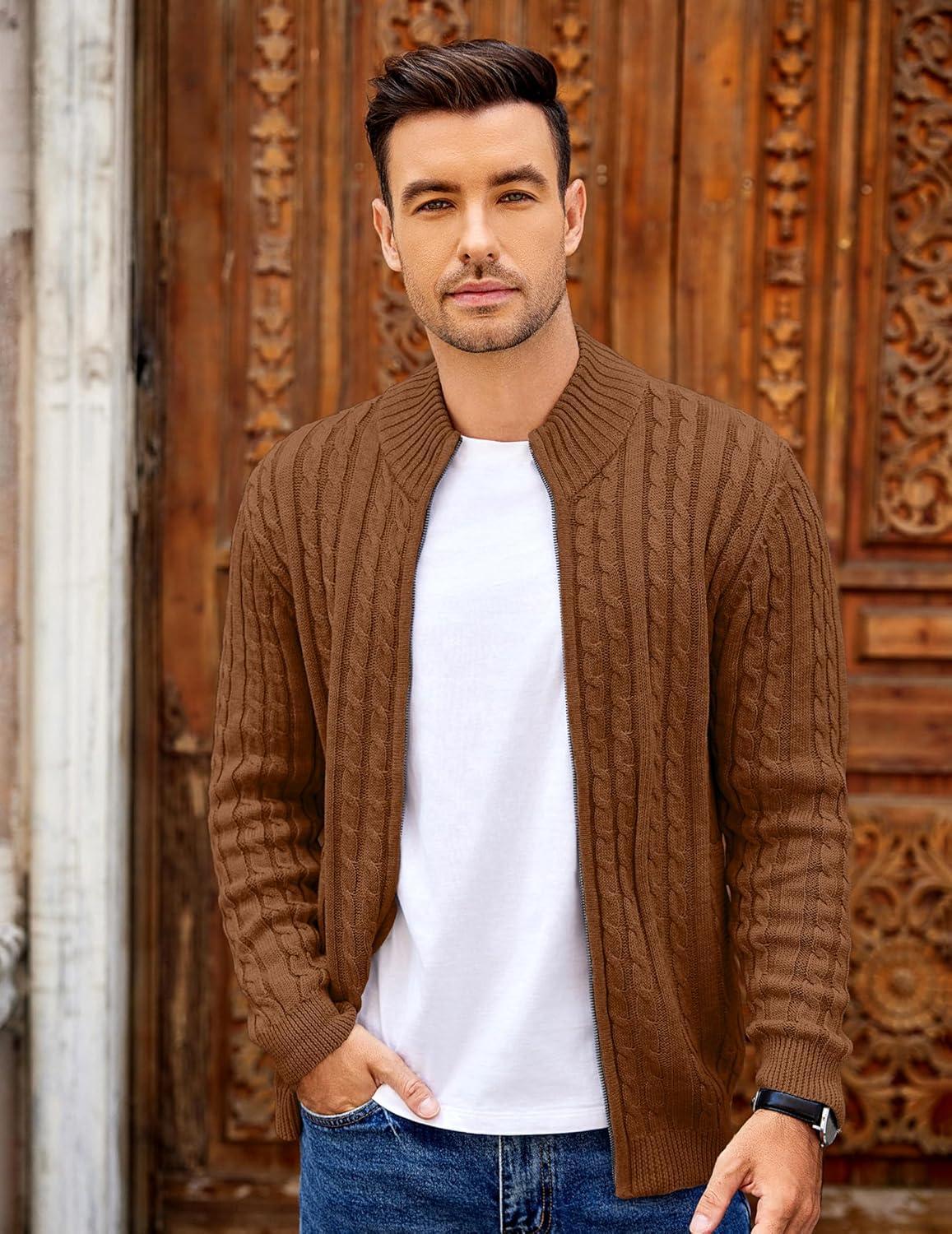 COOFANDY Men’s Full Zip Cardigan Sweater Slim Fit Cable Knitted Zip Up Sweater with Pockets(Brown)