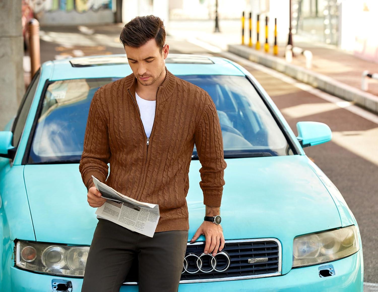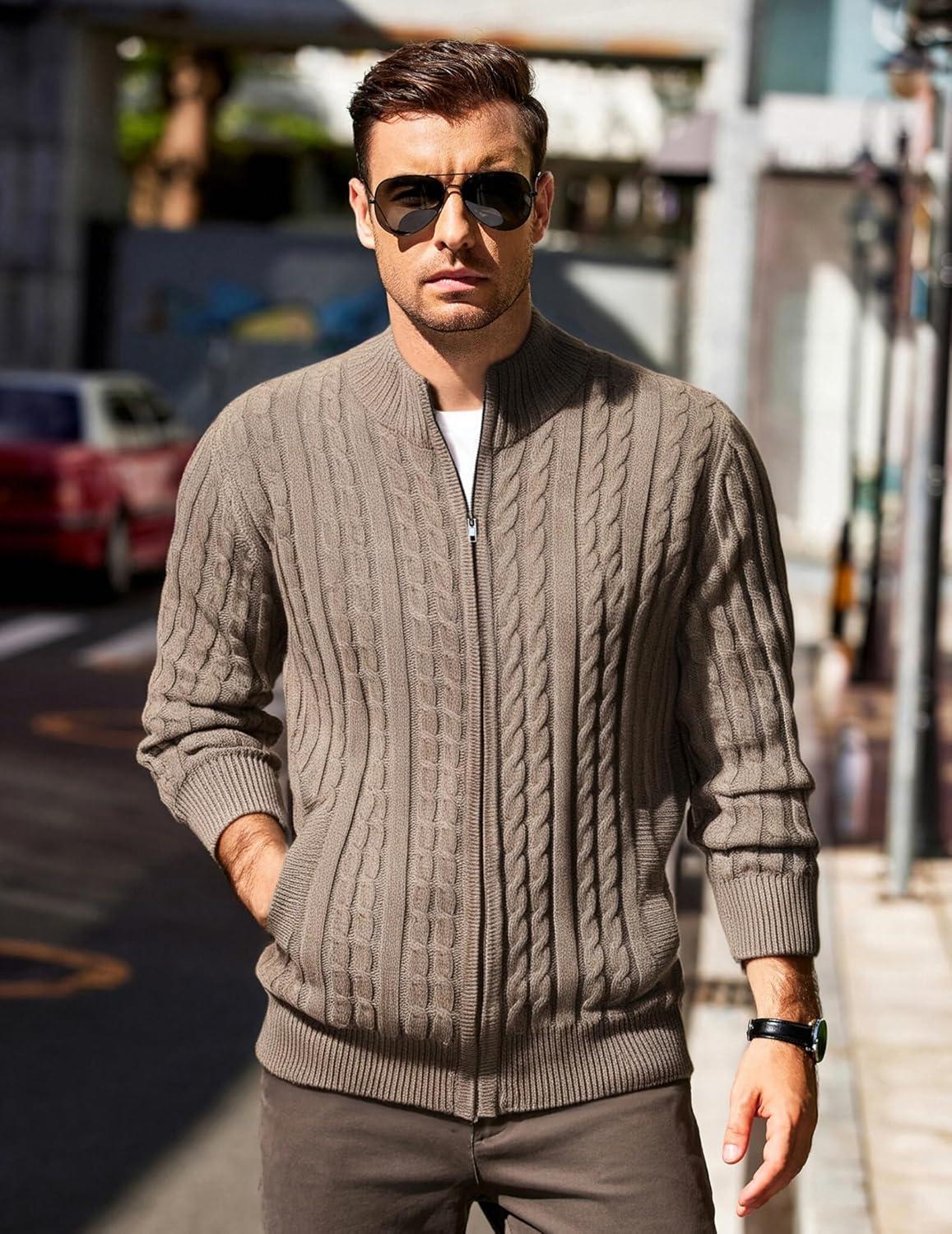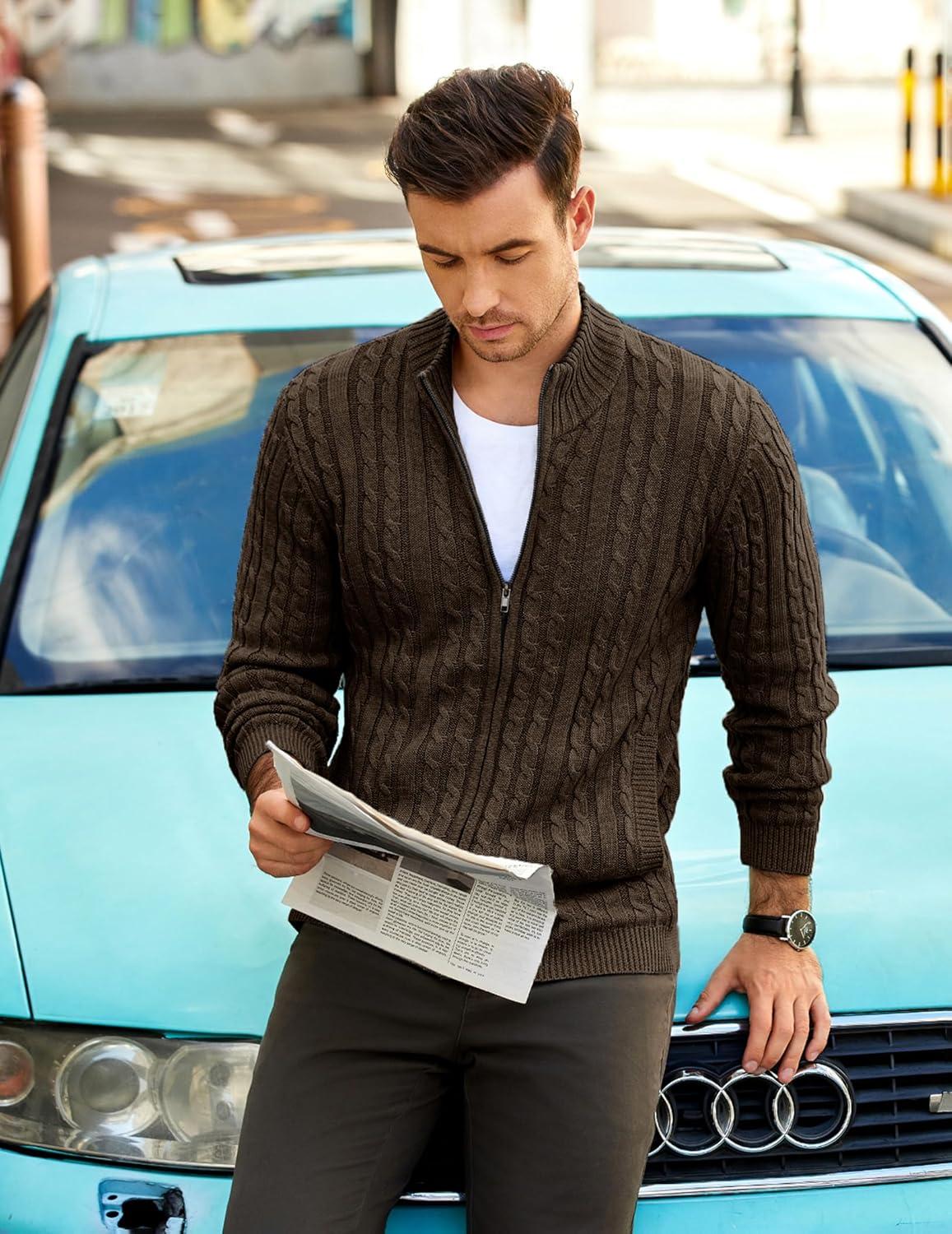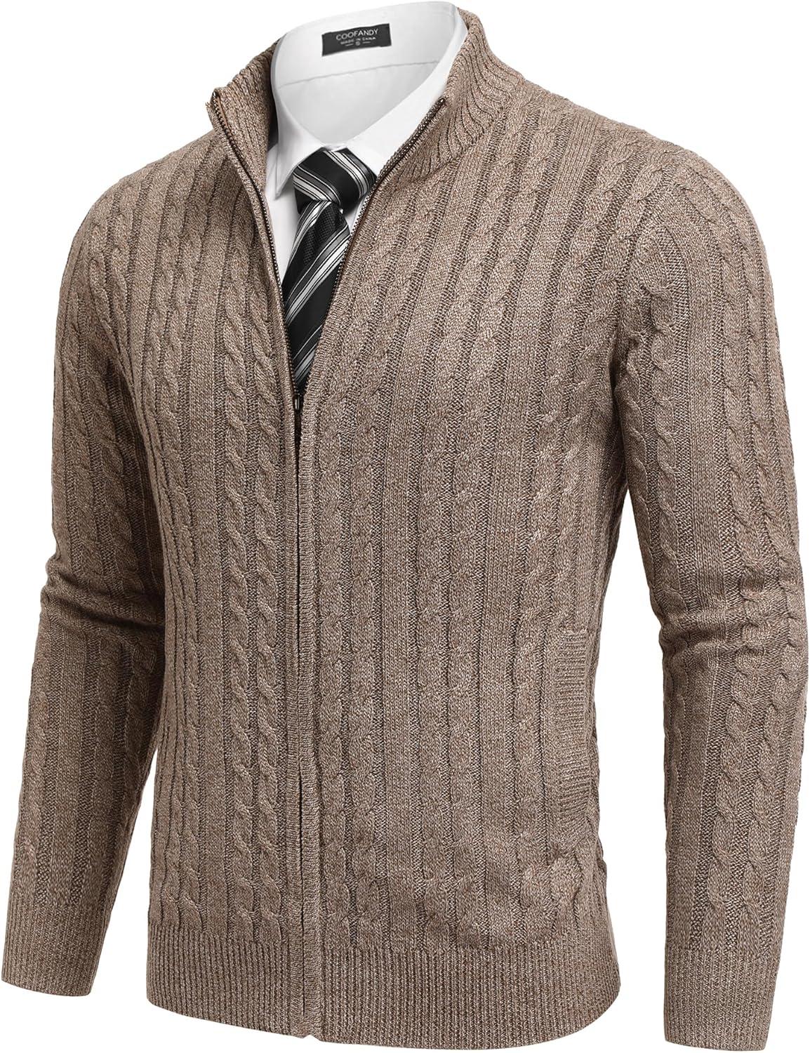 COOFANDY Men’s Full Zip Cardigan Sweater Slim Fit Cable Knitted Zip Up Sweater with Pockets(Brown)