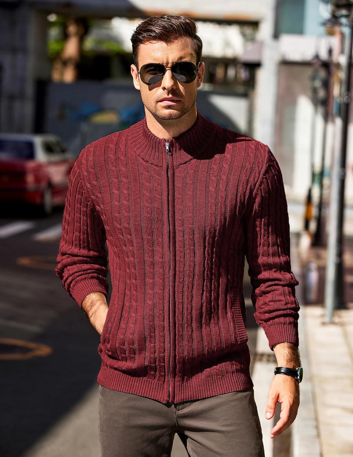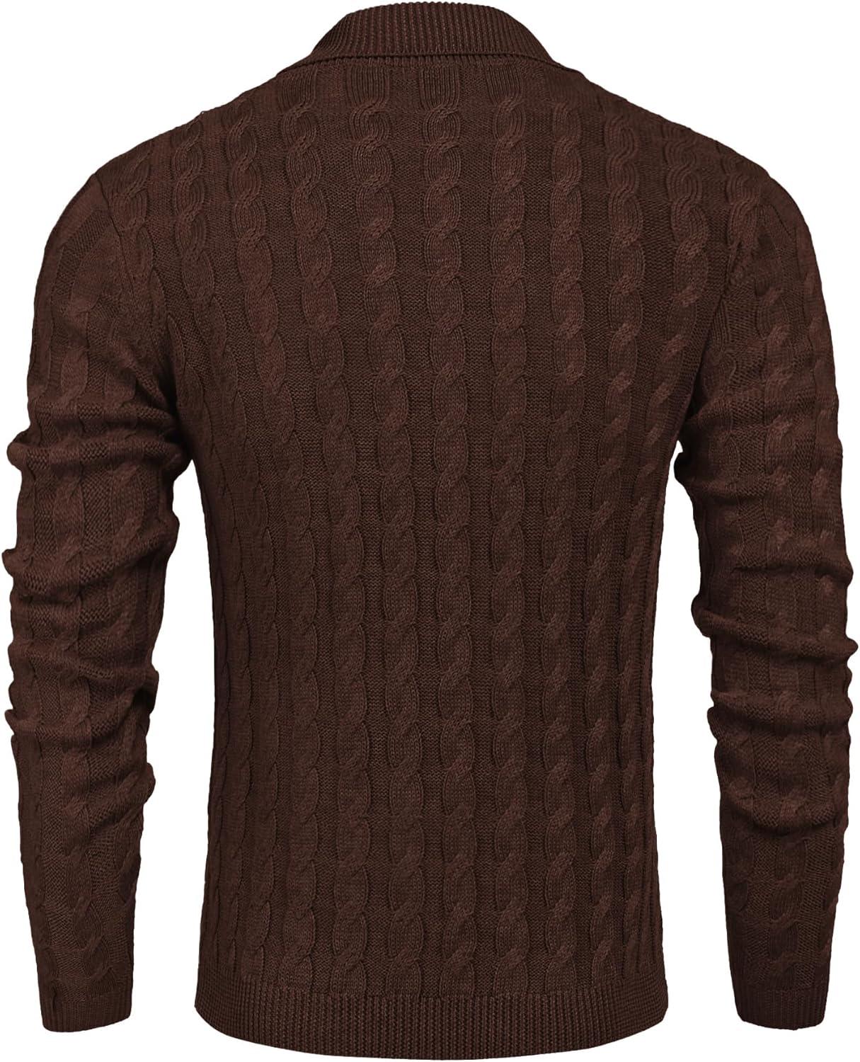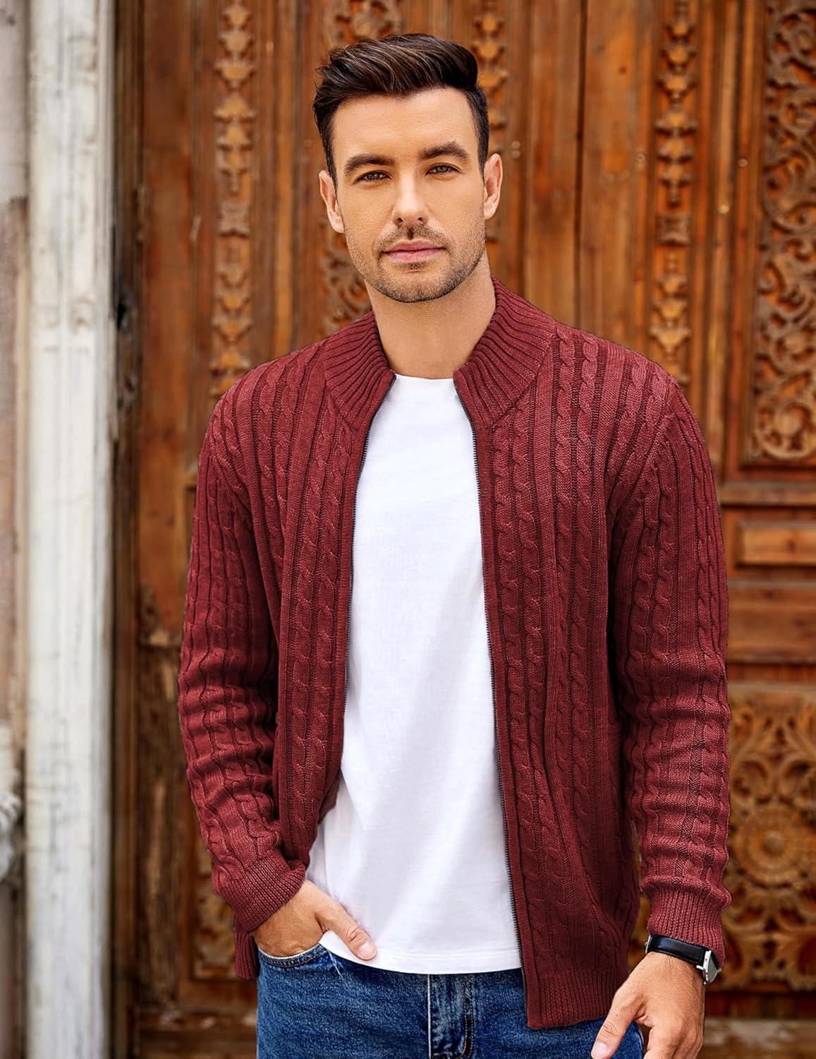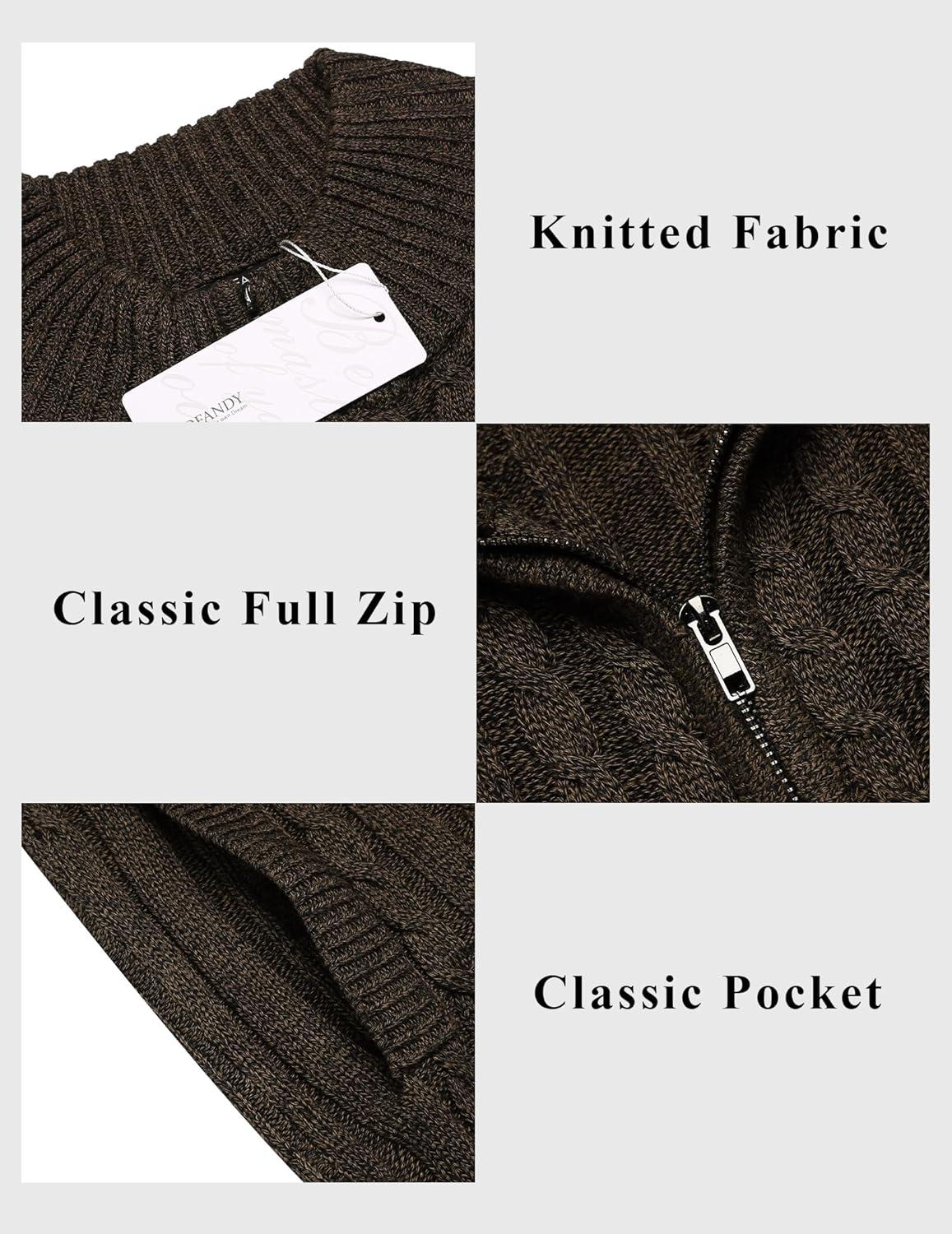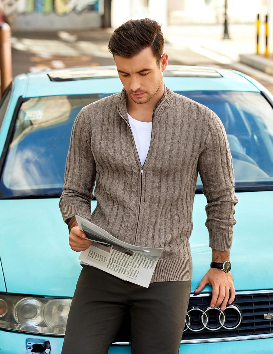 COOFANDY Men’s Full Zip Cardigan Sweater Slim Fit Cable Knitted Zip Up Sweater with Pockets(Brown)