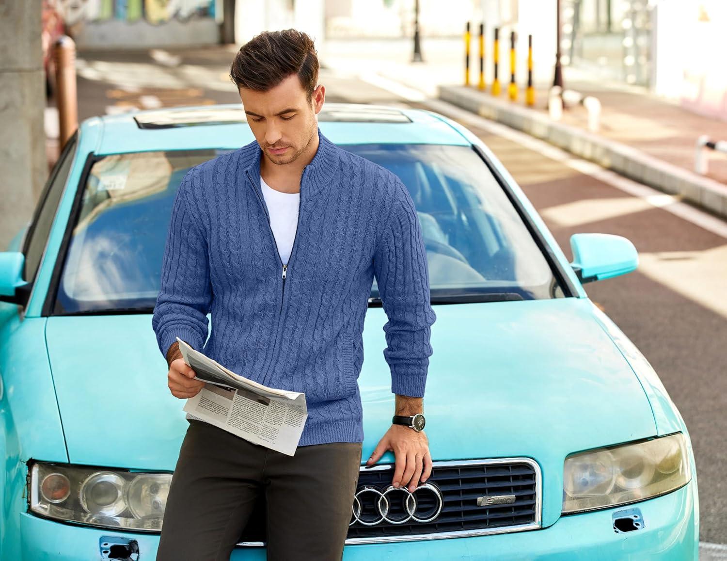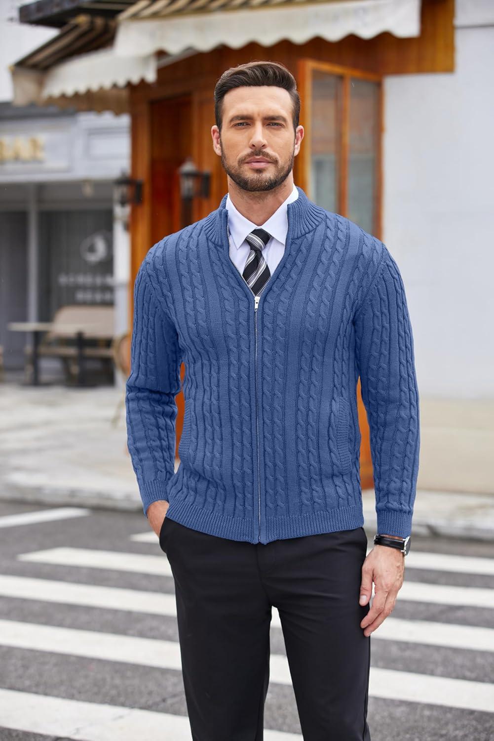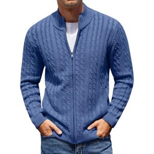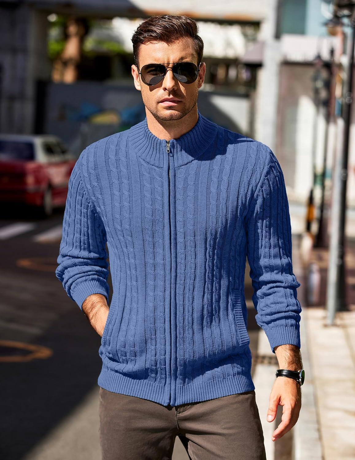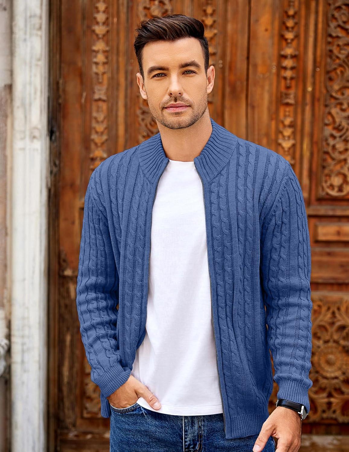 COOFANDY Men’s Full Zip Cardigan Sweater Slim Fit Cable Knitted Zip Up Sweater with Pockets(Blue)