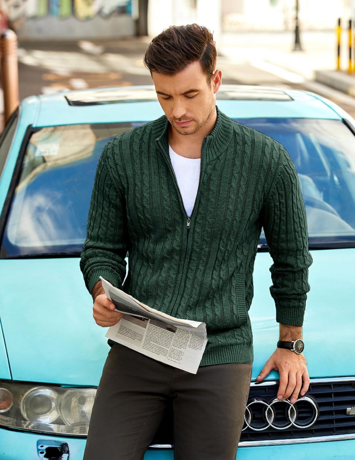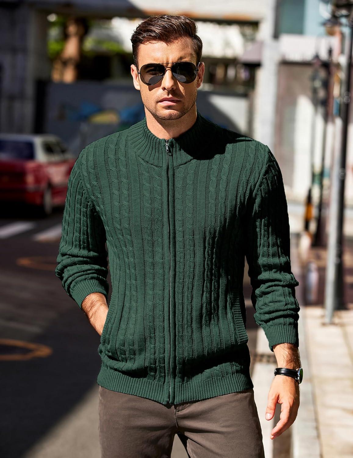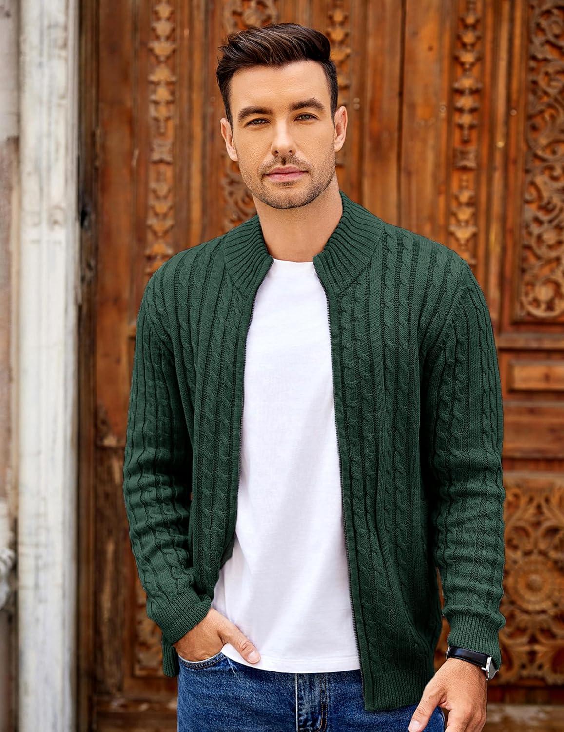 COOFANDY Men’s Full Zip Cardigan Sweater Slim Fit Cable Knitted Zip Up Sweater with Pockets(Green)