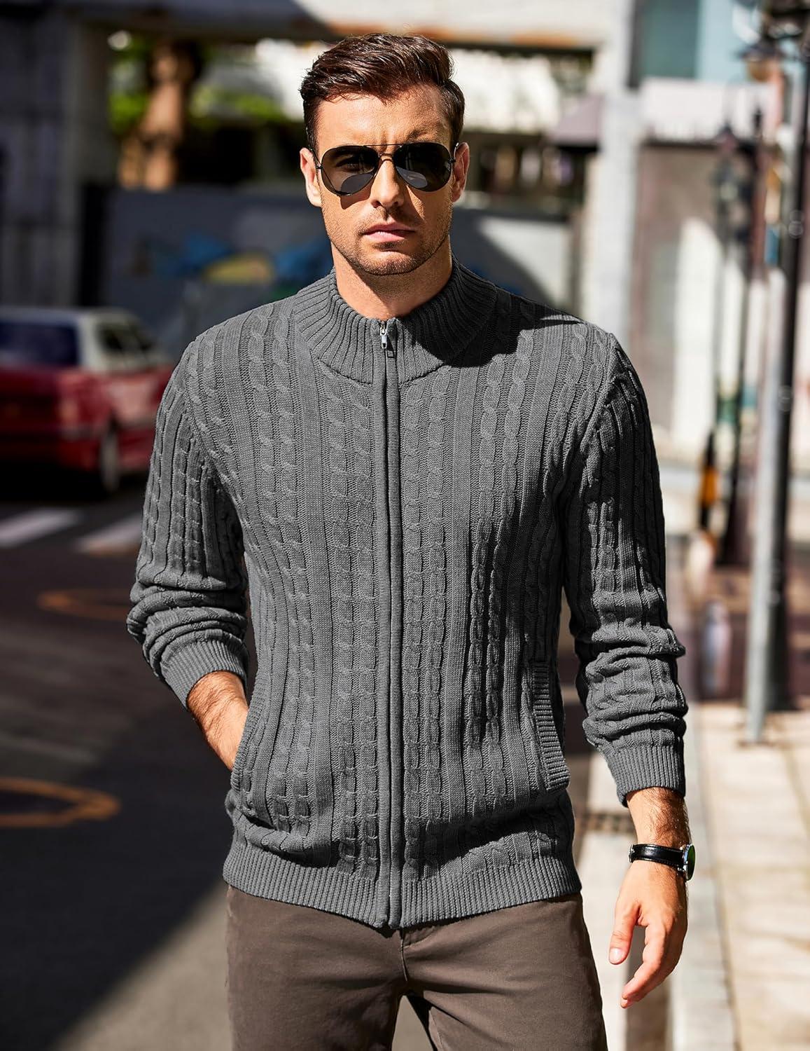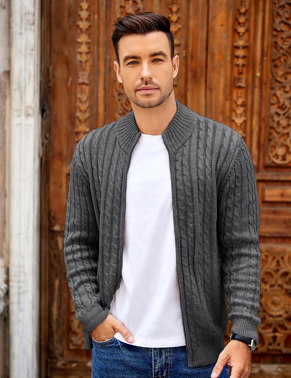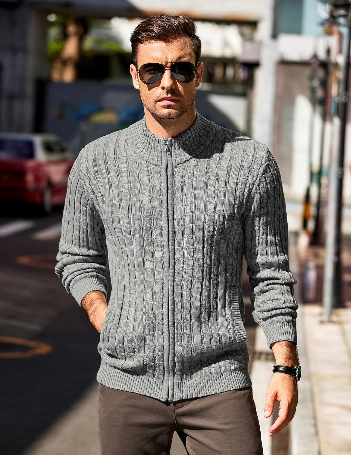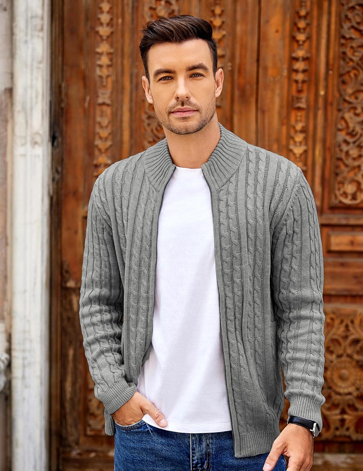 COOFANDY Men’s Full Zip Cardigan Sweater Slim Fit Cable Knitted Zip Up Sweater with Pockets(Grey)