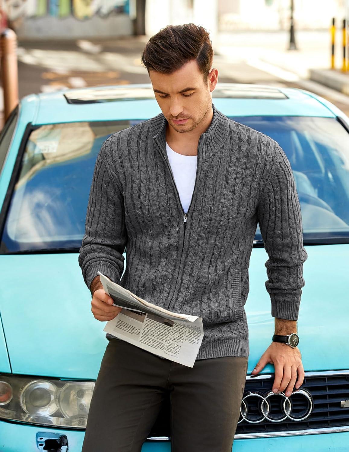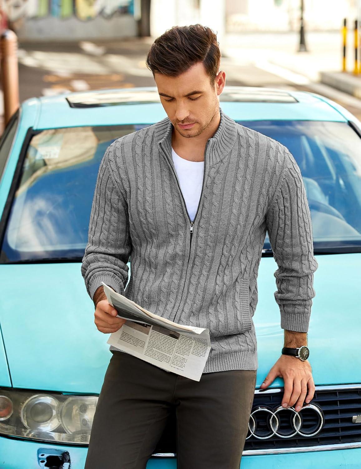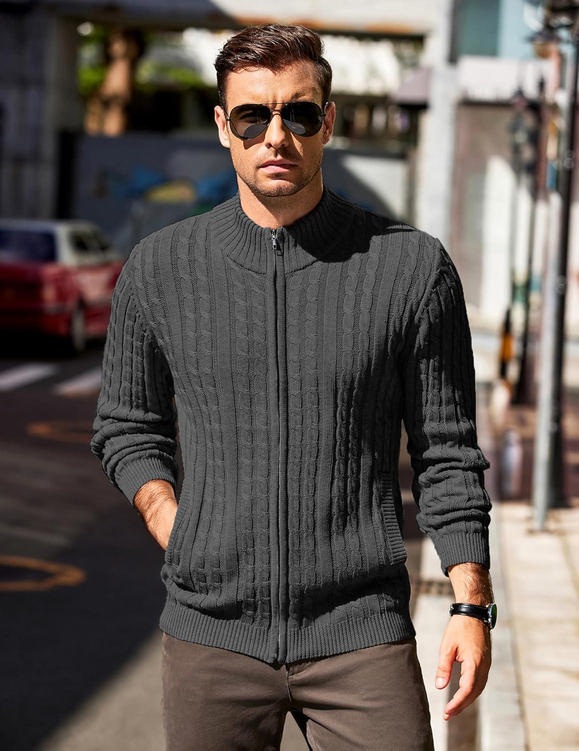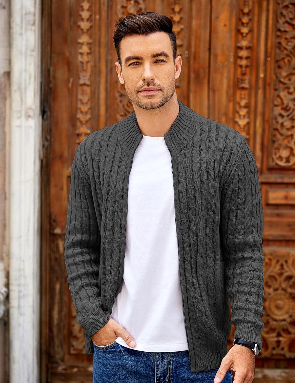 COOFANDY Men’s Full Zip Cardigan Sweater Slim Fit Cable Knitted Zip Up Sweater with Pockets(Grey)