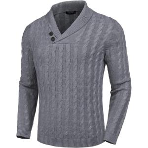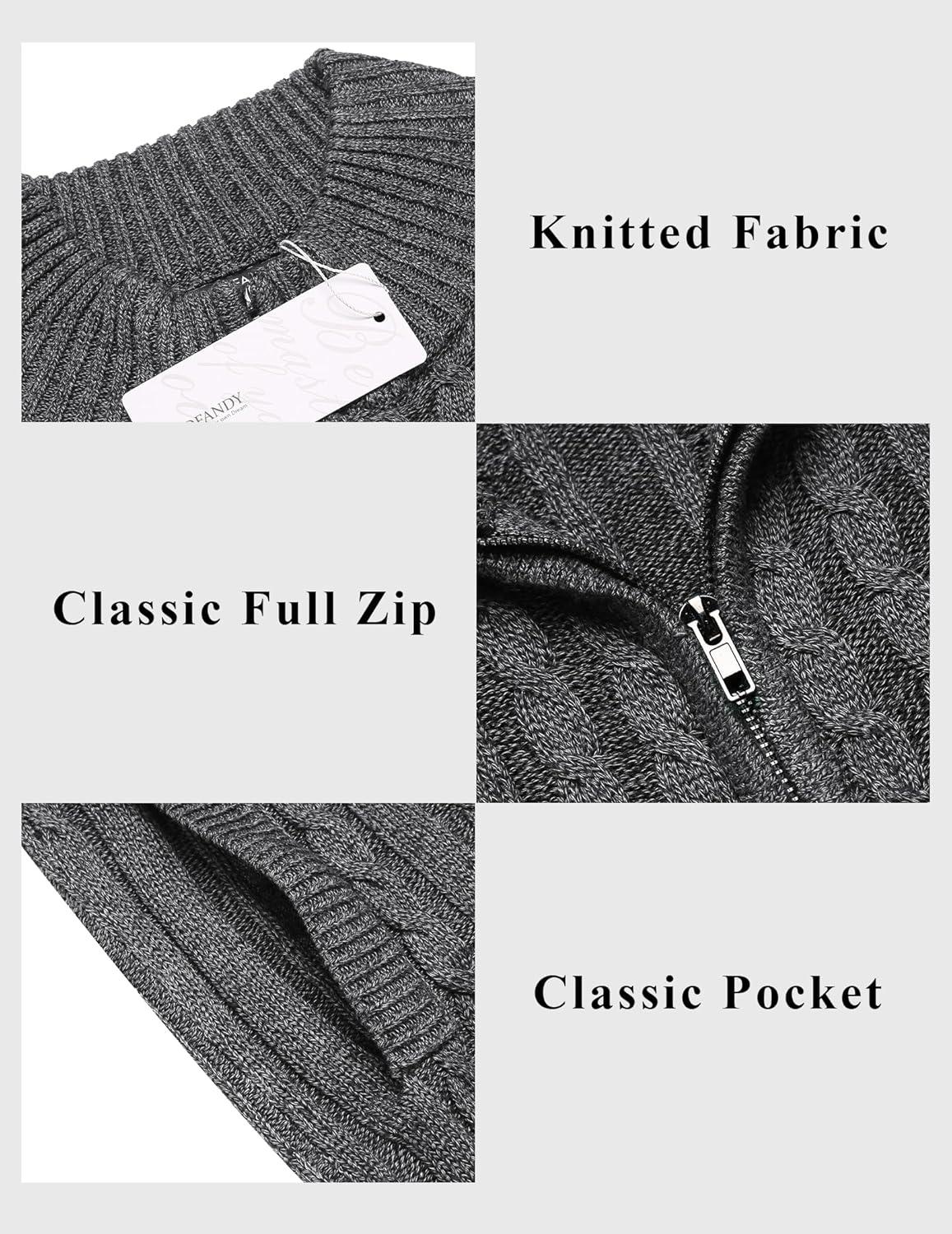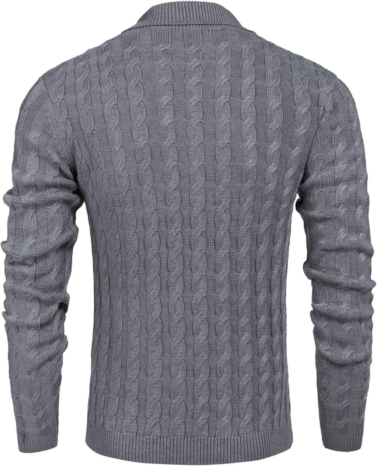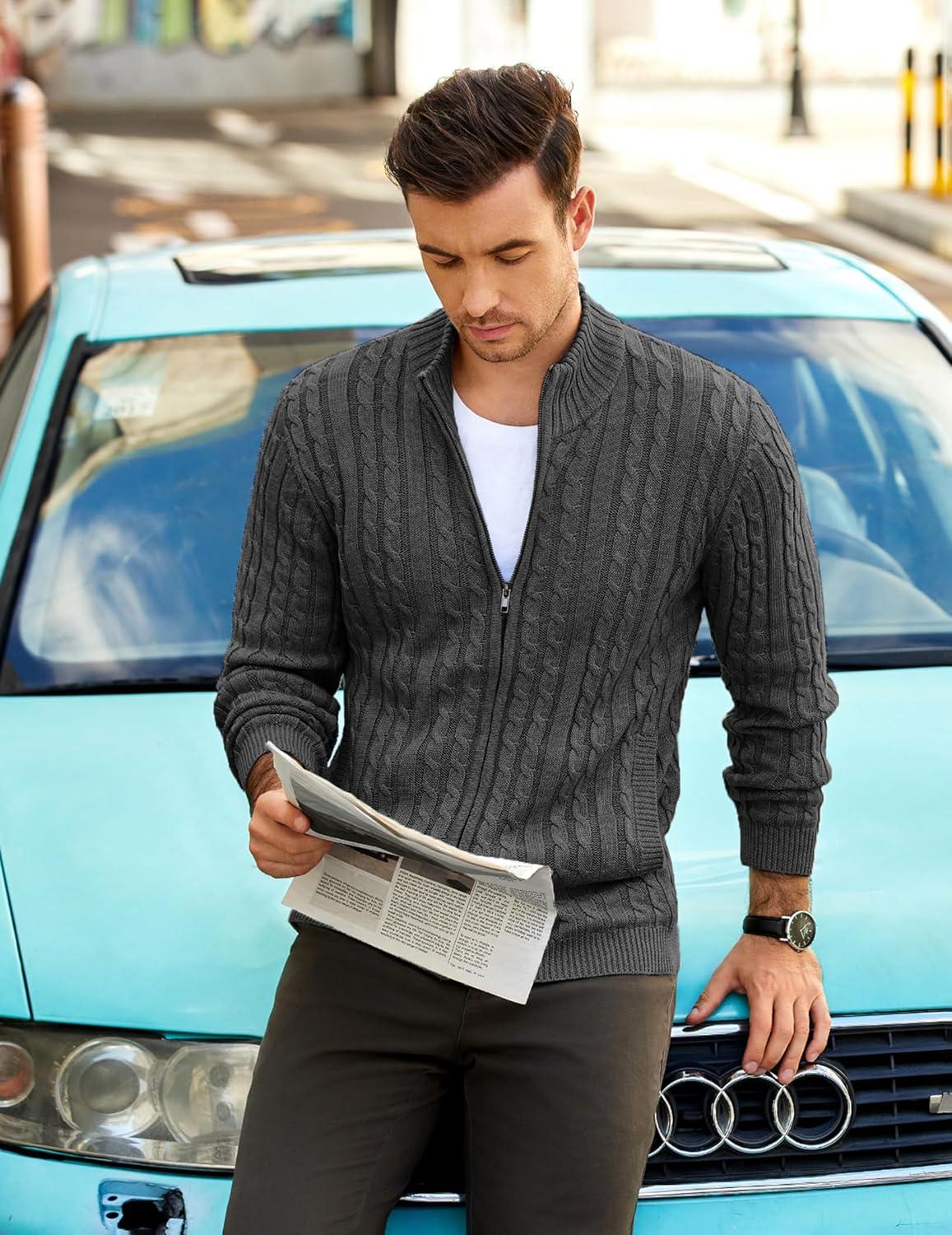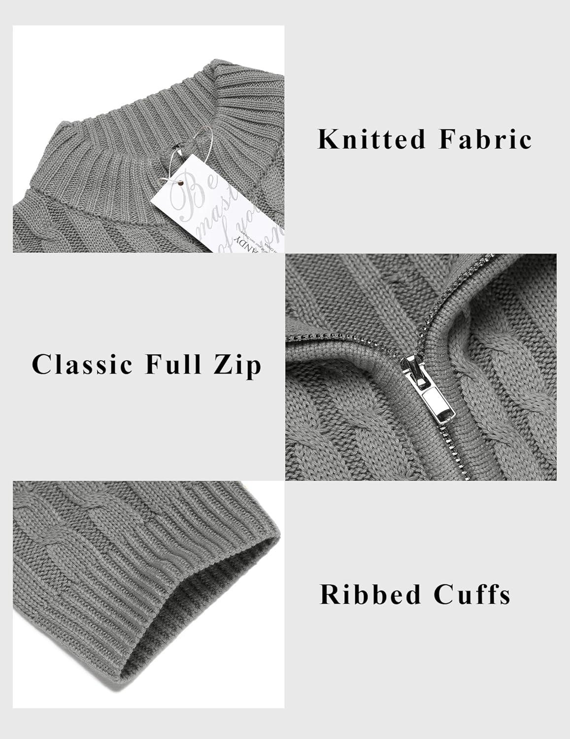 COOFANDY Men’s Full Zip Cardigan Sweater Slim Fit Cable Knitted Zip Up Sweater with Pockets(Grey)