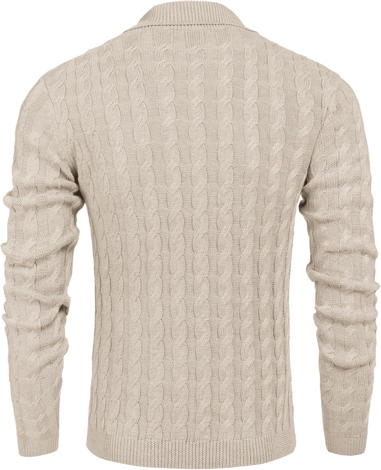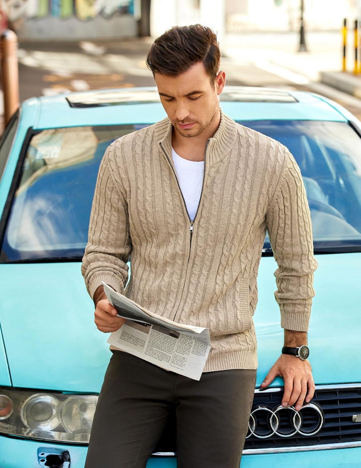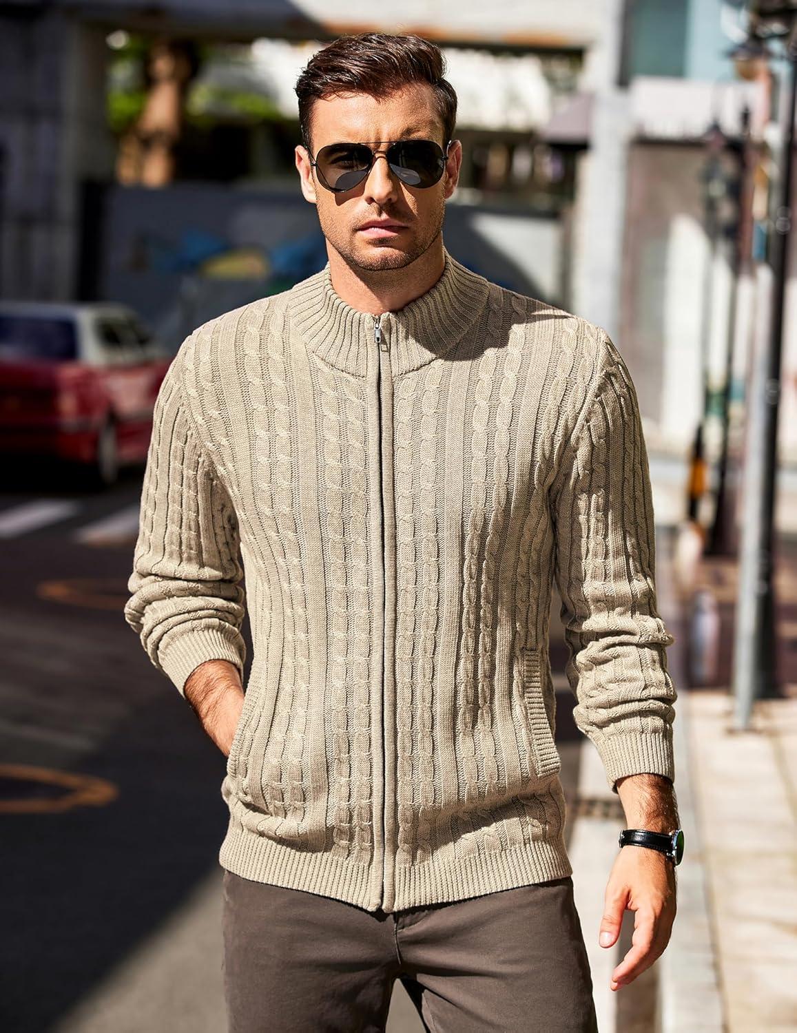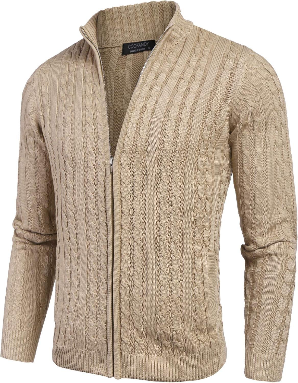 COOFANDY Men’s Full Zip Cardigan Sweater Slim Fit Cable Knitted Zip Up Sweater with Pockets(Beige)