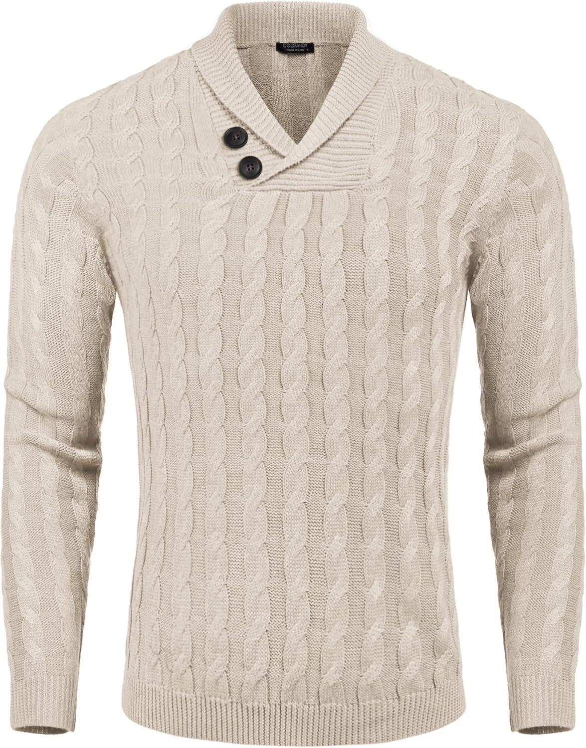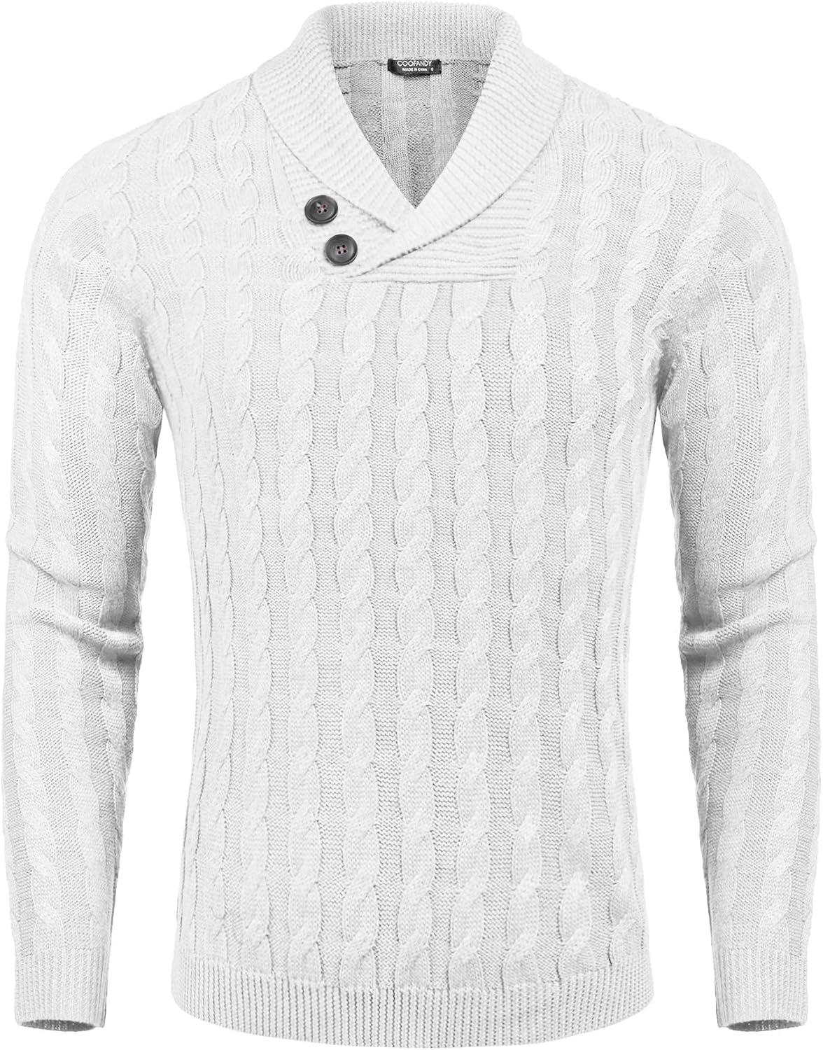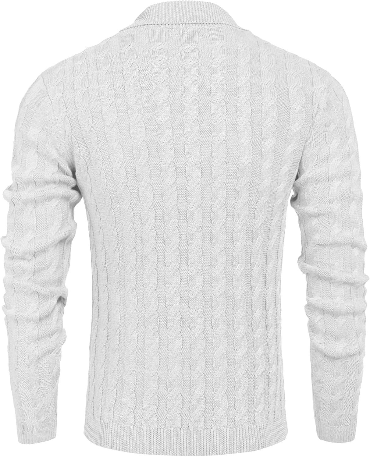 COOFANDY Mens Quarter Button Sweater Long Sleeve Stand Collar Sweaters Casual Knitted Ribbed Dress Pullover(White)