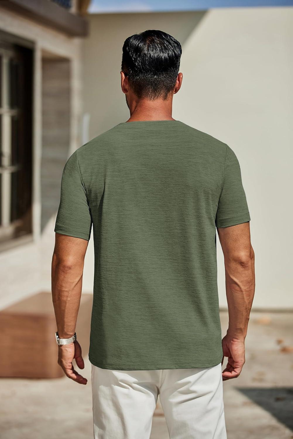 COOFANDY Men’s Casual Henley Shirt Short Sleeve Band Collar Linen Shirt Summer Beach Hippie T-Shirts(Army Green)