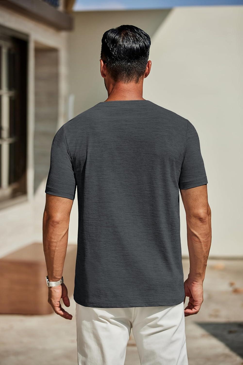 COOFANDY Men’s Casual Henley Shirt Short Sleeve Band Collar Linen Shirt Summer Beach Hippie T-Shirts(Dark Gray)