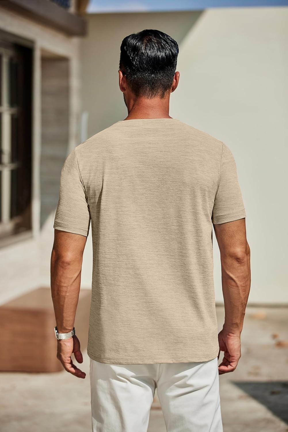 COOFANDY Men’s Casual Henley Shirt Short Sleeve Band Collar Linen Shirt Summer Beach Hippie T-Shirts(Khaki)