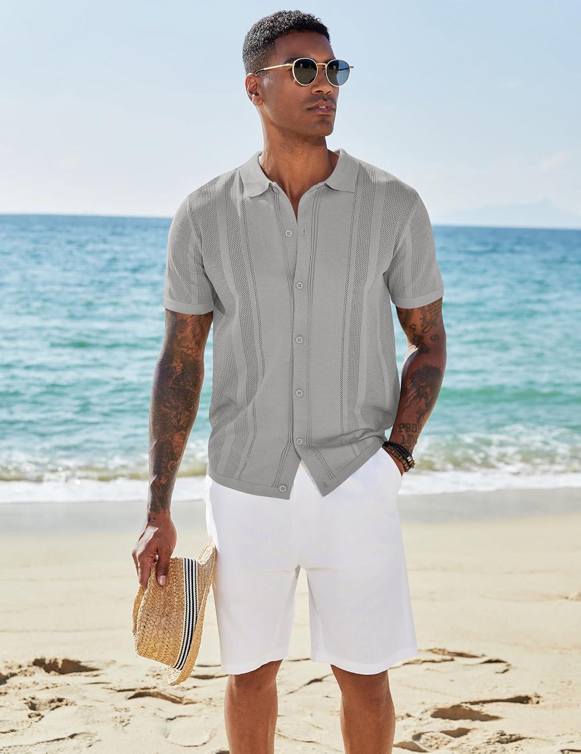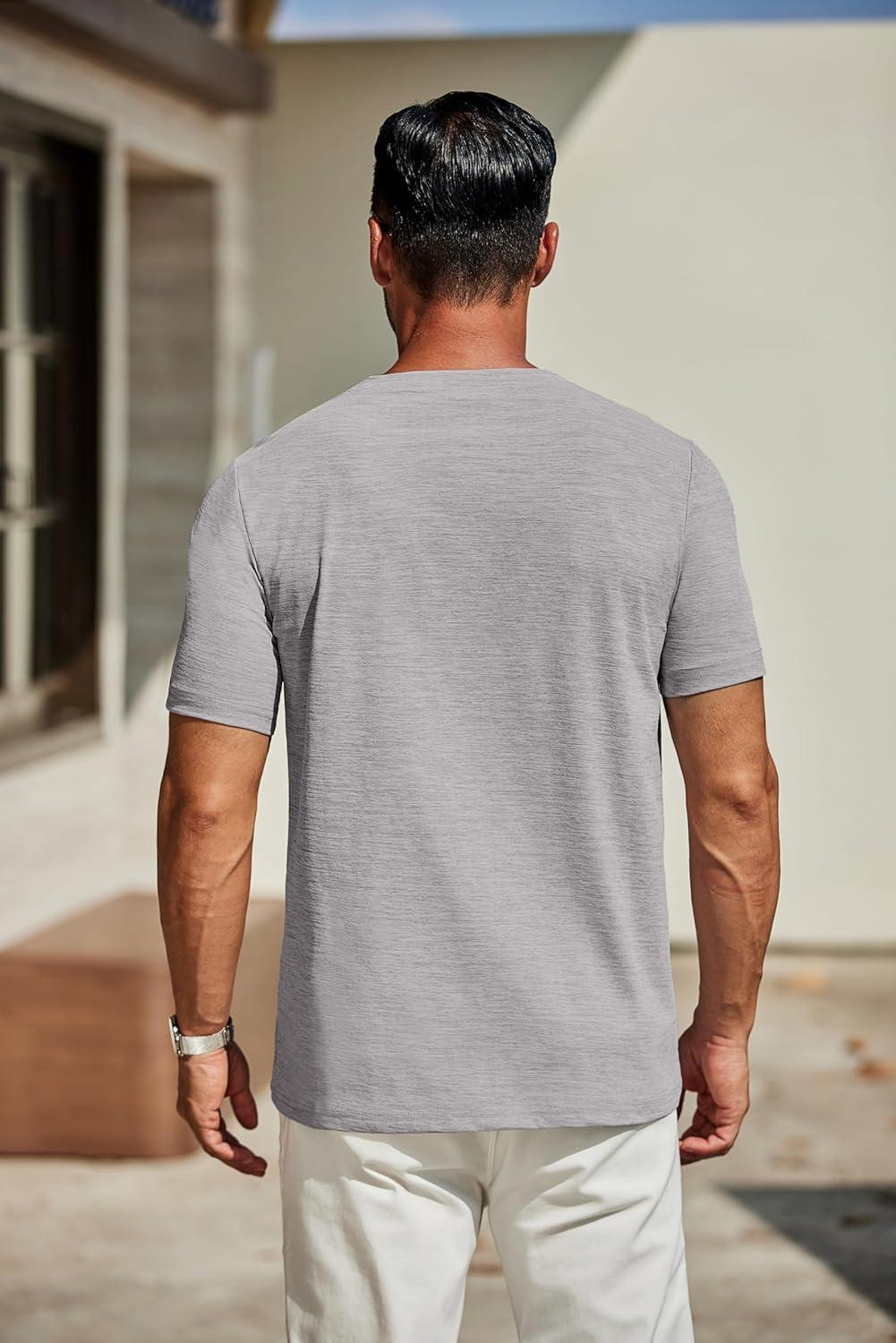 COOFANDY Men’s Casual Henley Shirt Short Sleeve Band Collar Linen Shirt Summer Beach Hippie T-Shirts(Light Grey)
