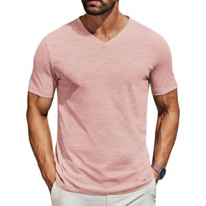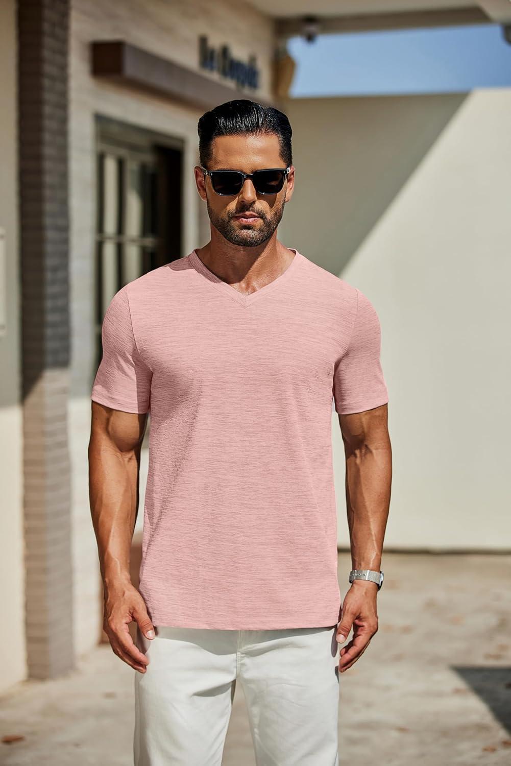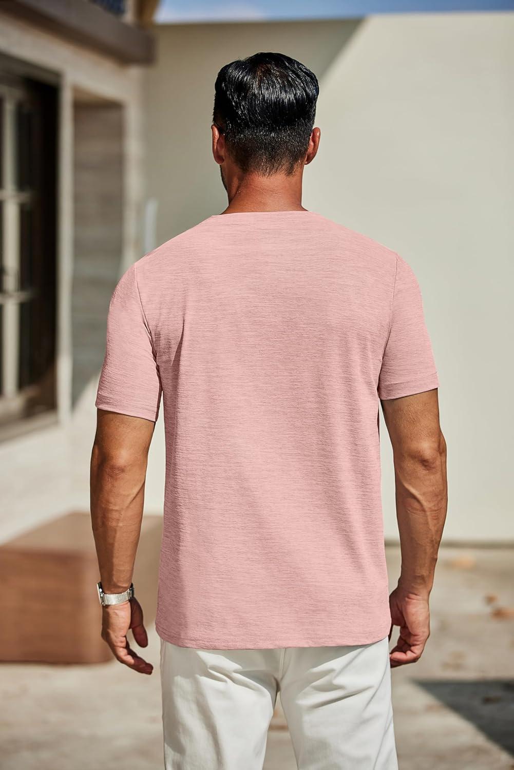 COOFANDY Men’s Casual Henley Shirt Short Sleeve Band Collar Linen Shirt Summer Beach Hippie T-Shirts(Pink)