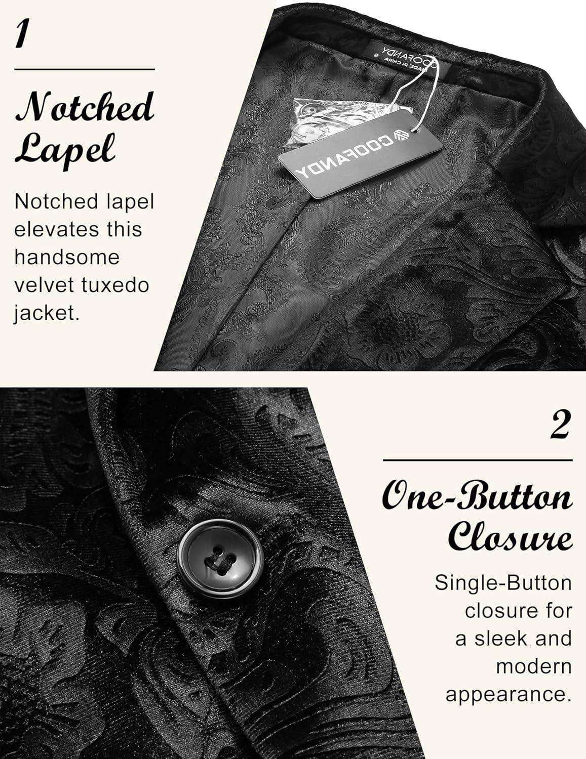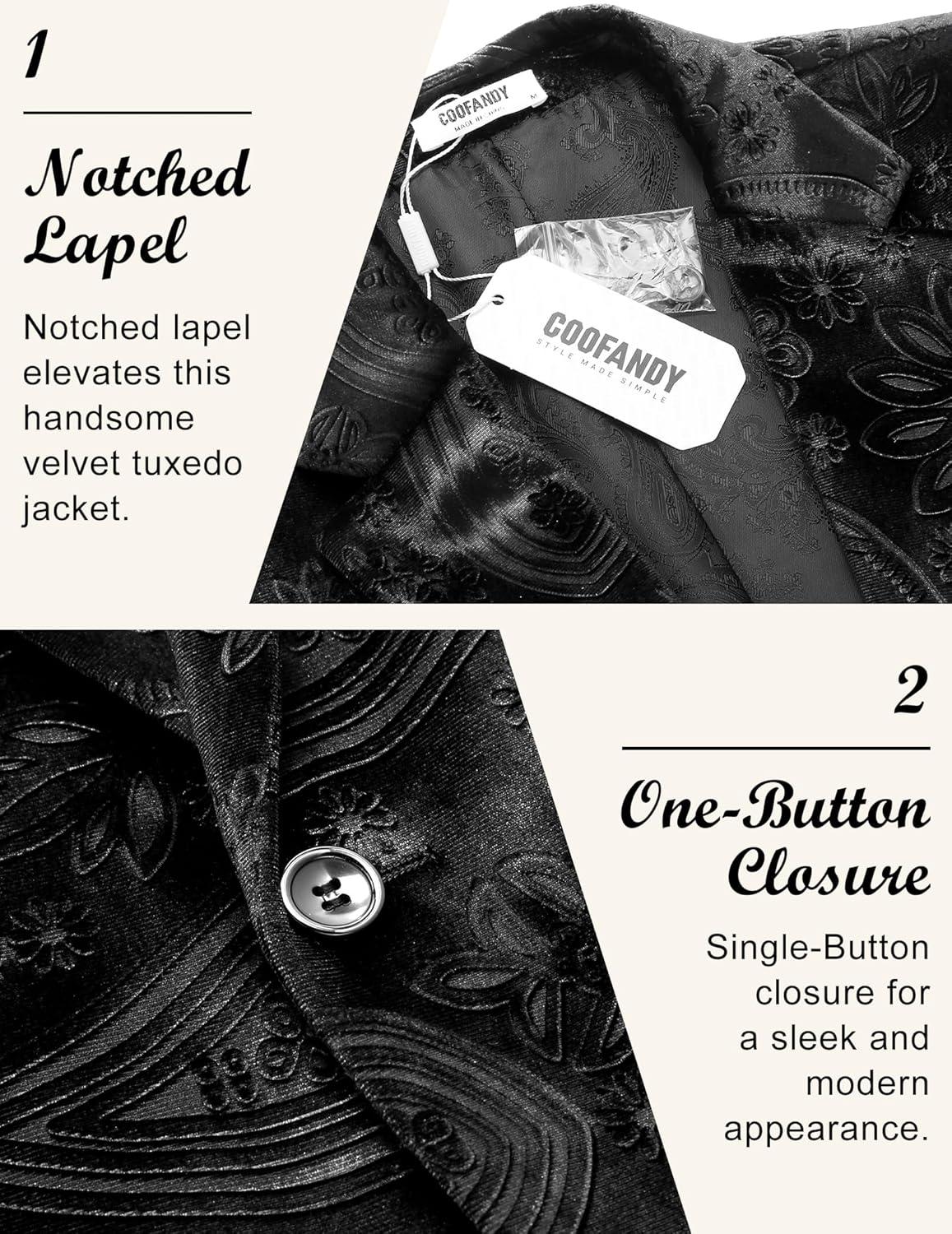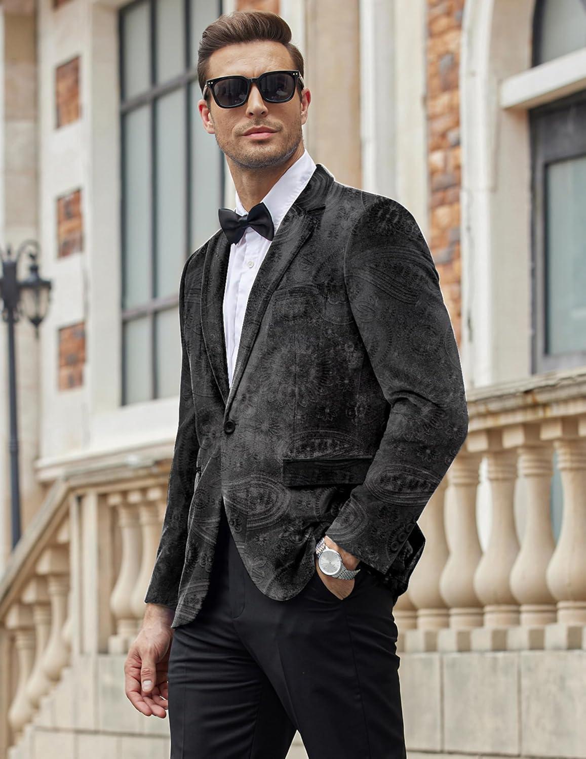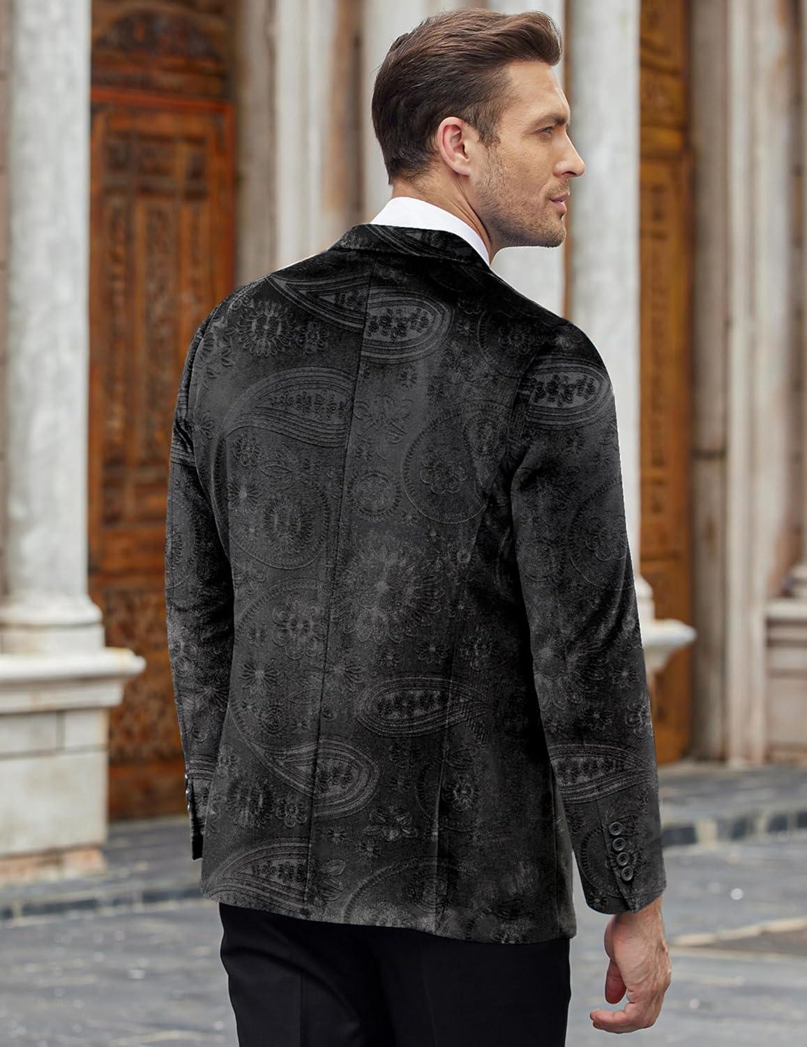 COOFANDY Men’s Velvet Blazer Notched Lapel Velour Suit Jacket One Button Tuxedo Jackets for Wedding Prom Party Dinner(Black Paisley)