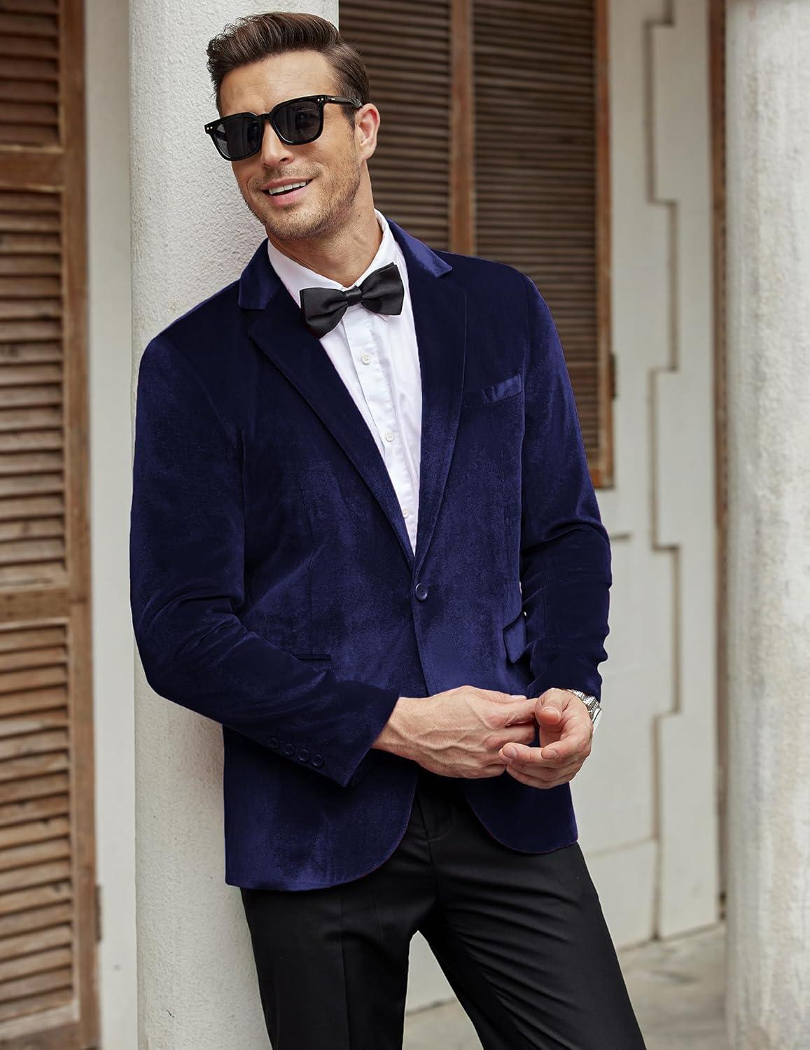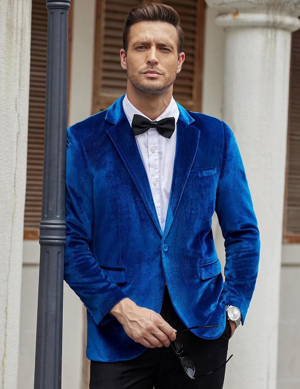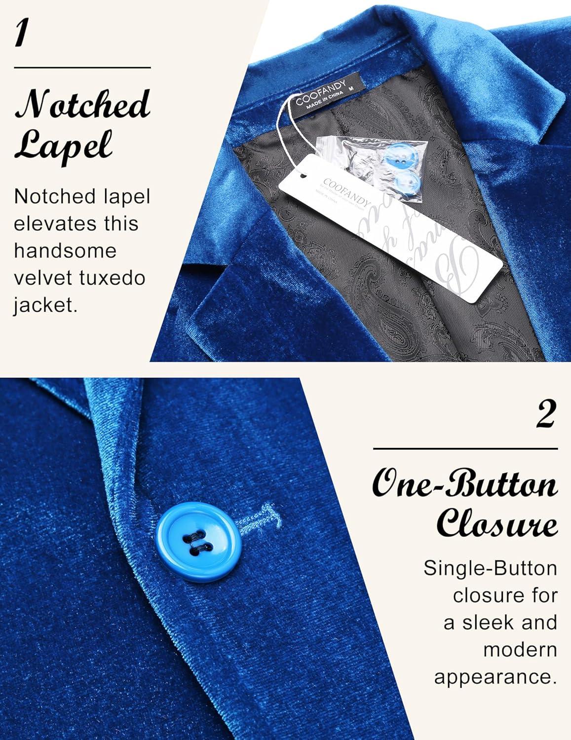 COOFANDY Men’s Velvet Blazer Notched Lapel Velour Suit Jacket One Button Tuxedo Jackets for Wedding Prom Party Dinner(Blue)