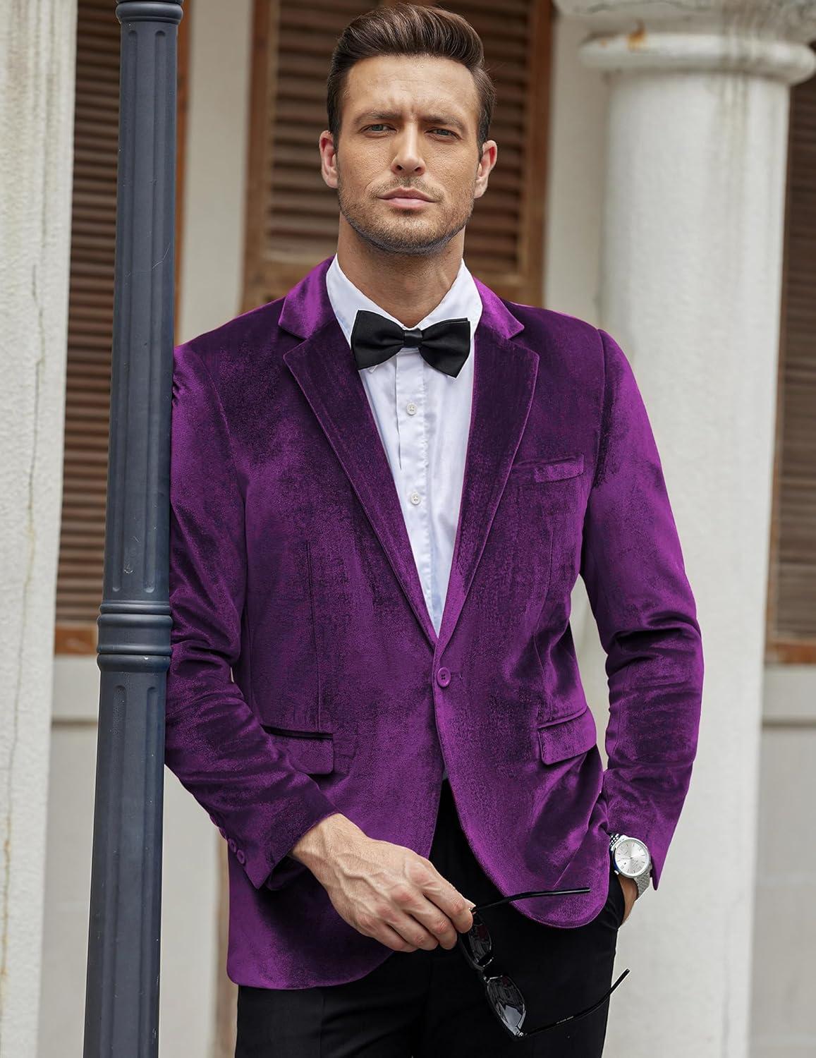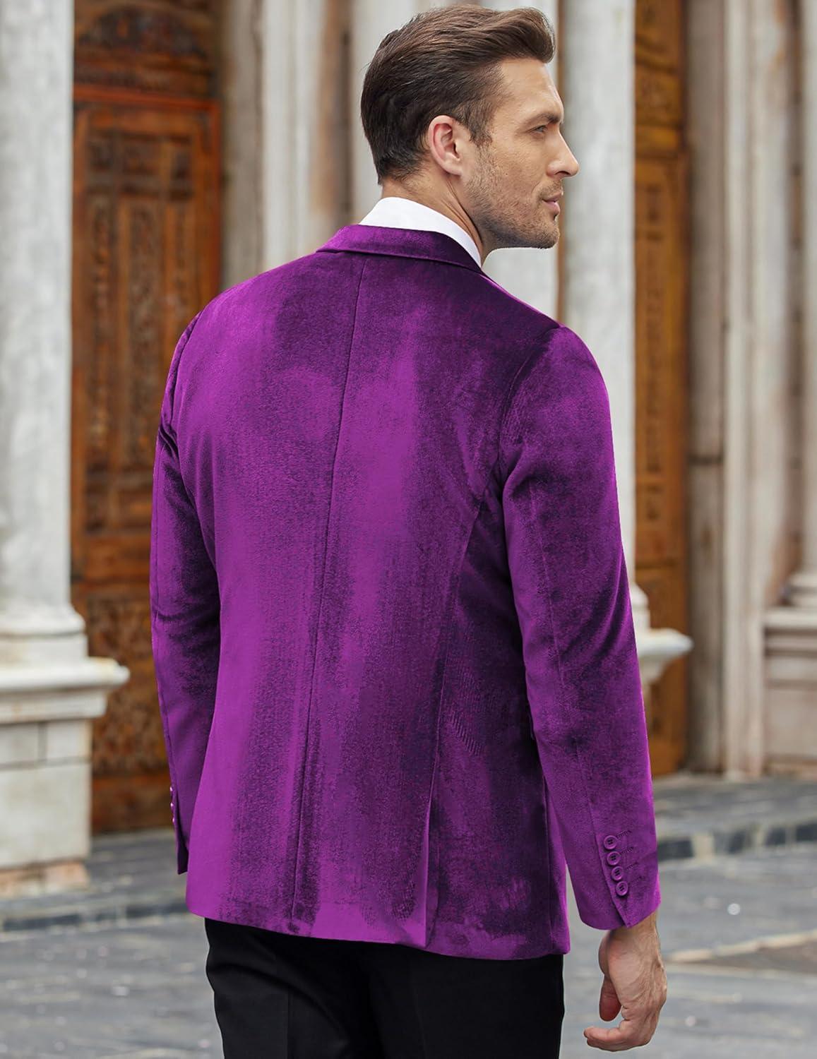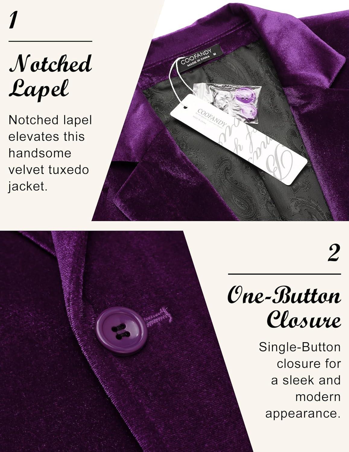 COOFANDY Men’s Velvet Blazer Notched Lapel Velour Suit Jacket One Button Tuxedo Jackets for Wedding Prom Party Dinner(Purple)
