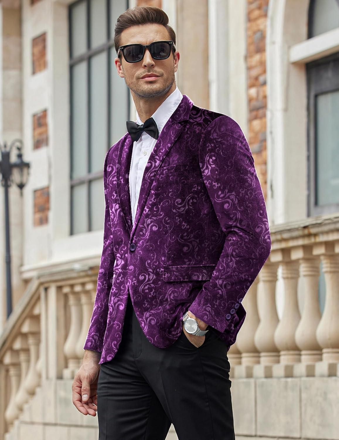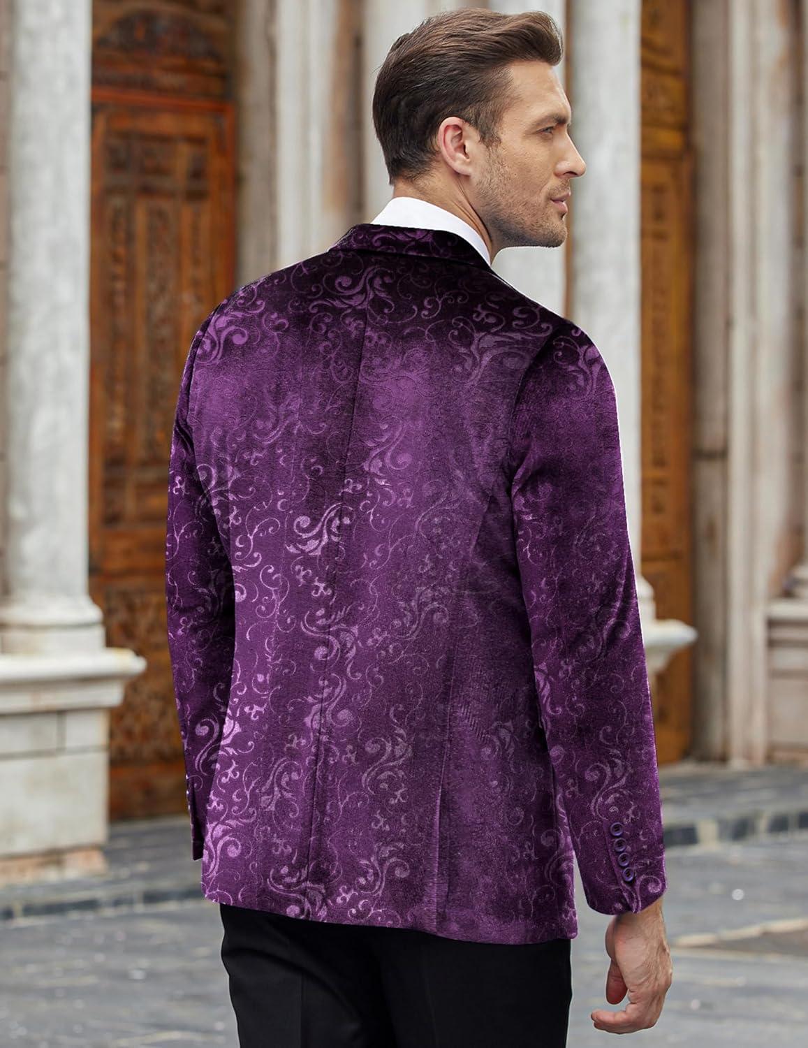 COOFANDY Men’s Velvet Blazer Notched Lapel Velour Suit Jacket One Button Tuxedo Jackets for Wedding Prom Party Dinner(Purple Retro Floral)
