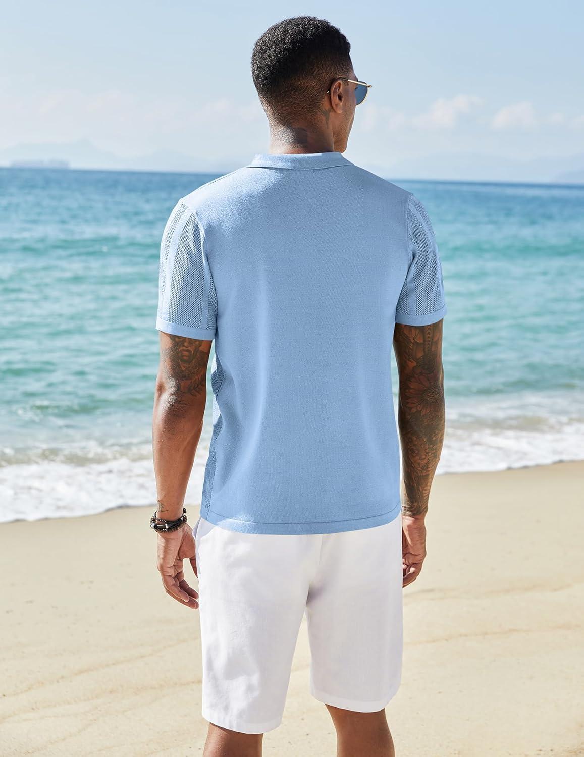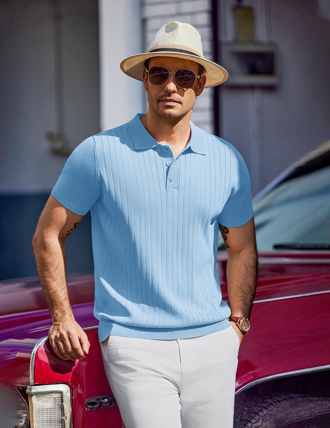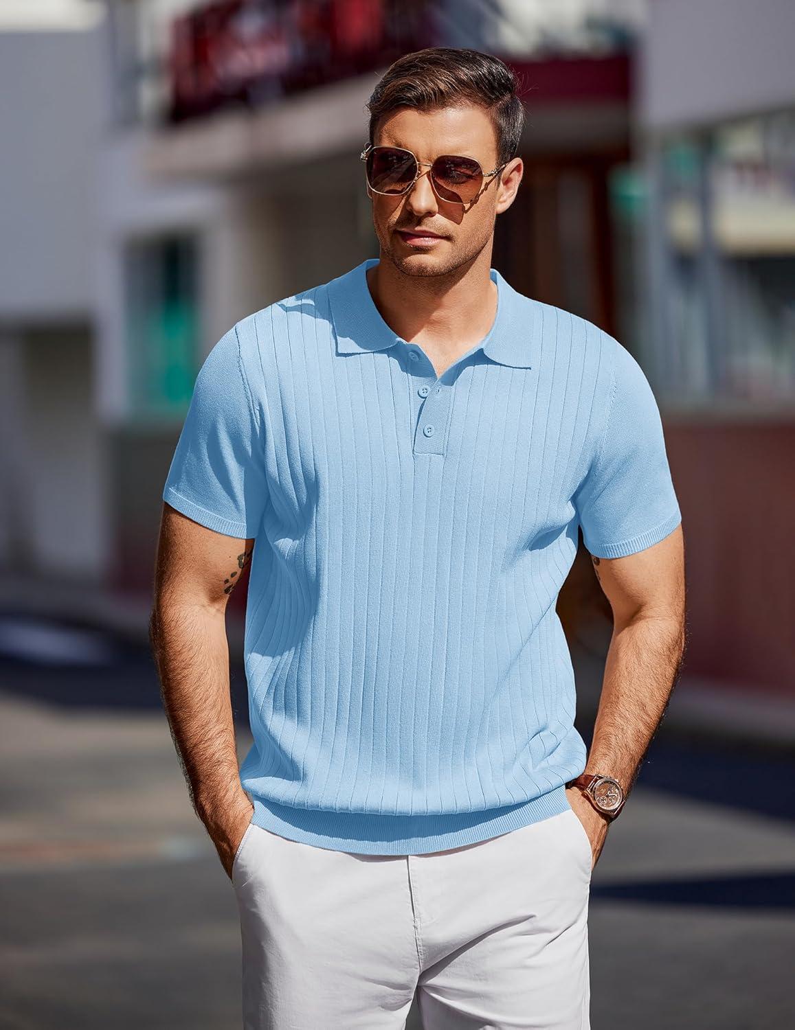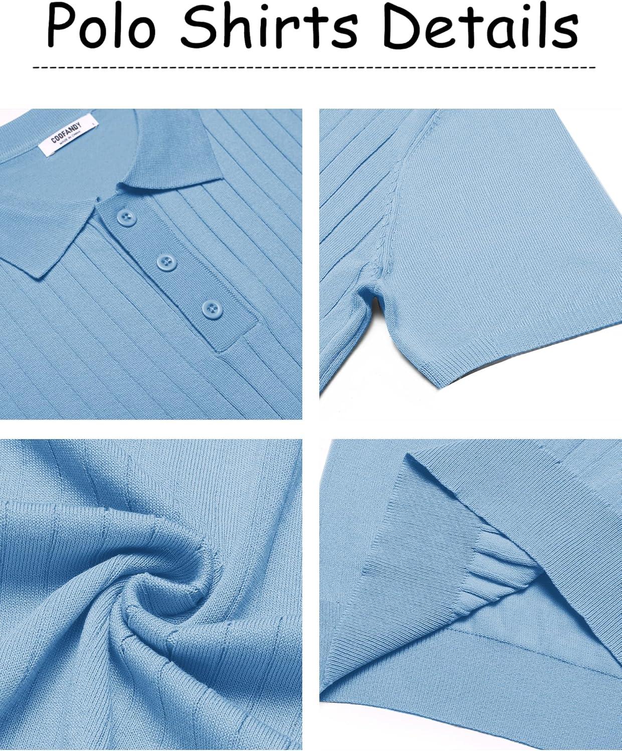 COOFANDY Mens Knit Polo Sweater Long Sleeve Polos Lightweight Casual Dress Pullover Sweaters(Light Blue)