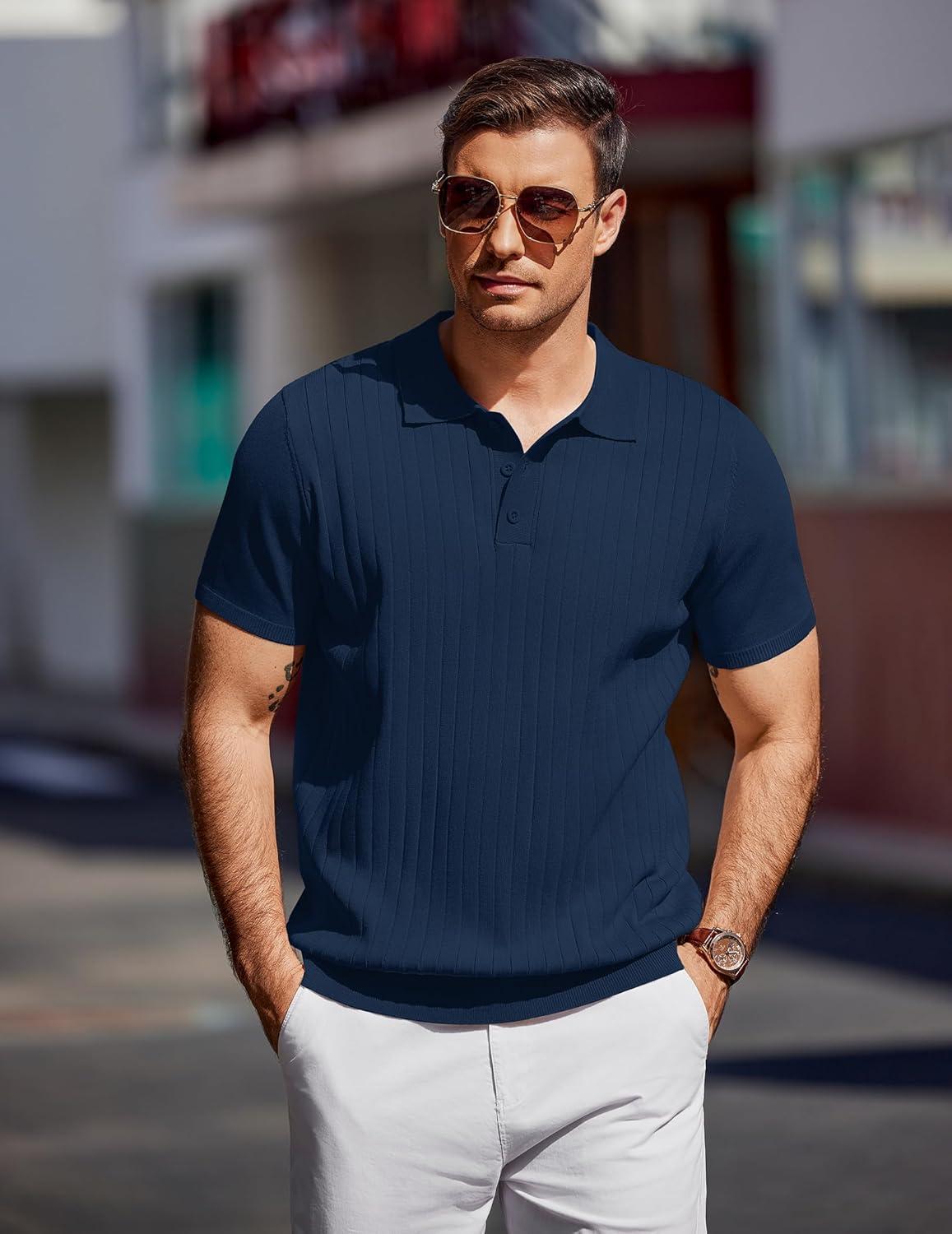 COOFANDY Mens Knit Polo Sweater Long Sleeve Polos Lightweight Casual Dress Pullover Sweaters(Demin Blue)