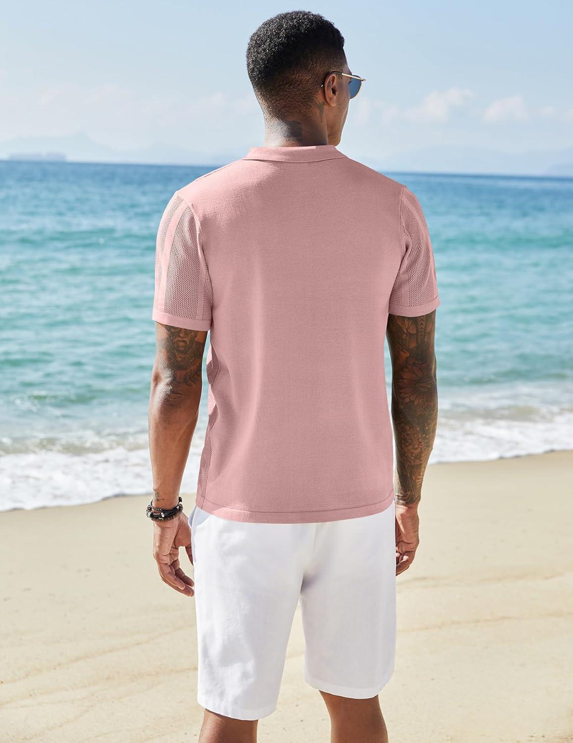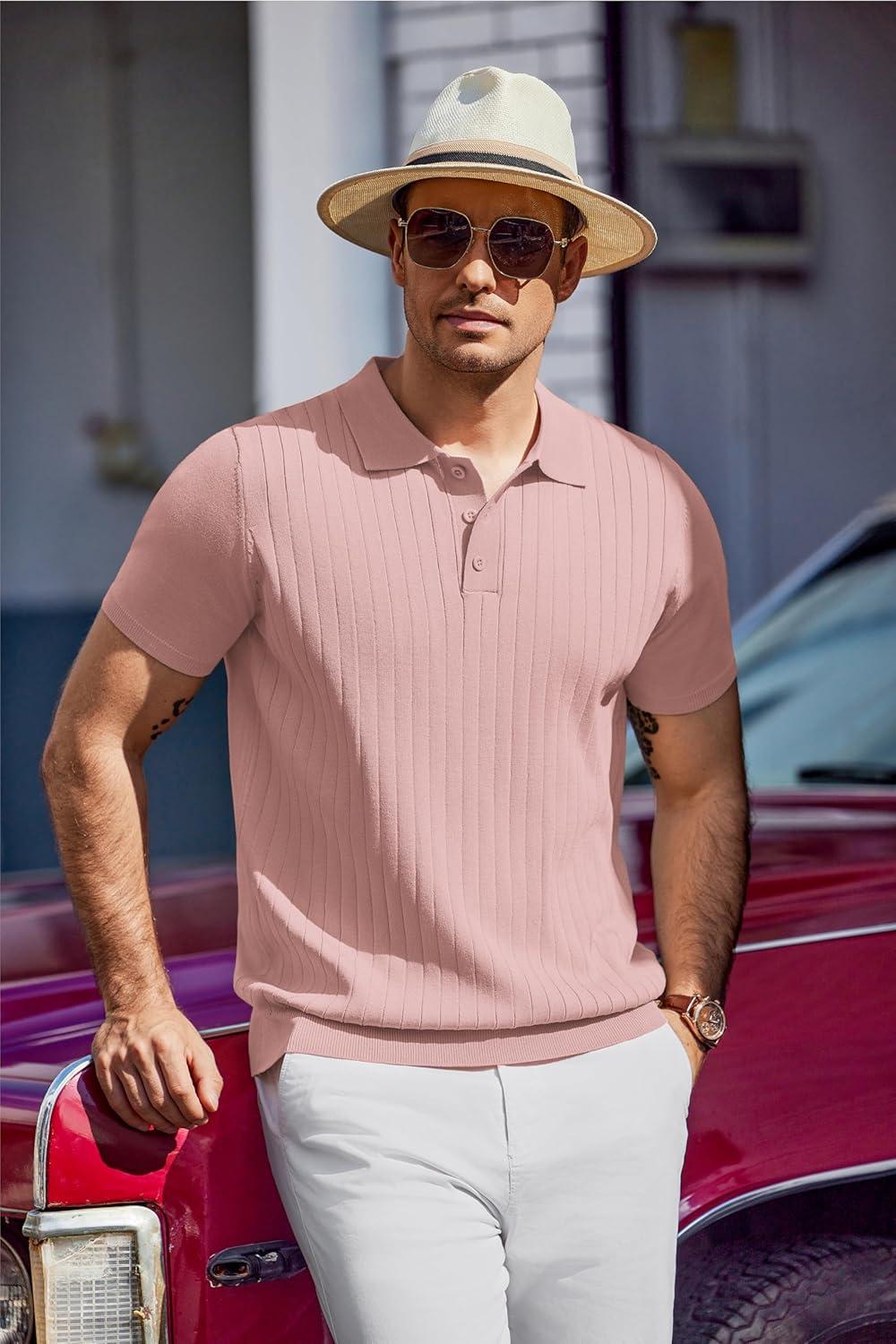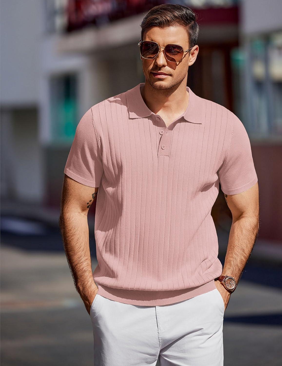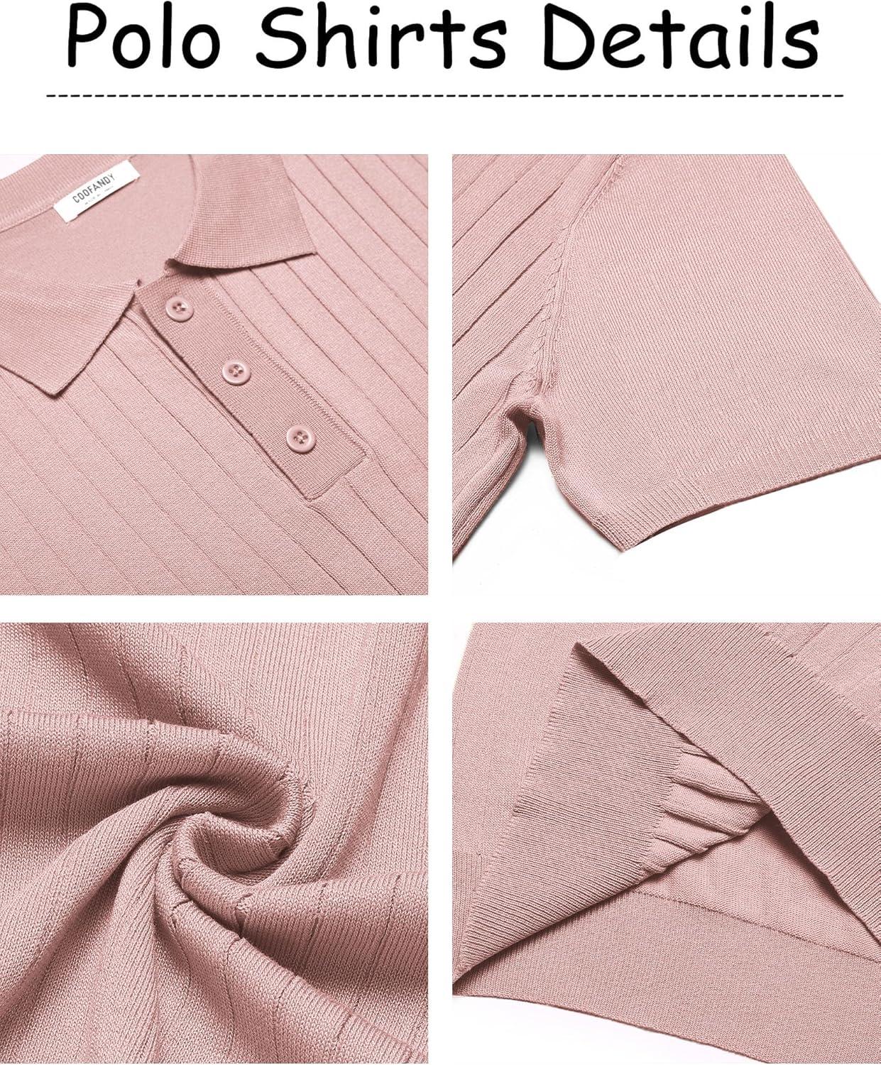 COOFANDY Mens Knit Polo Sweater Long Sleeve Polos Lightweight Casual Dress Pullover Sweaters(Pink)