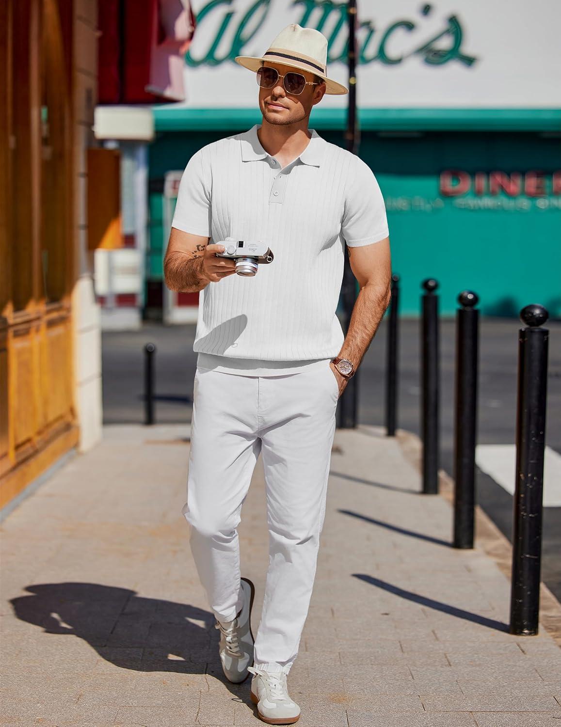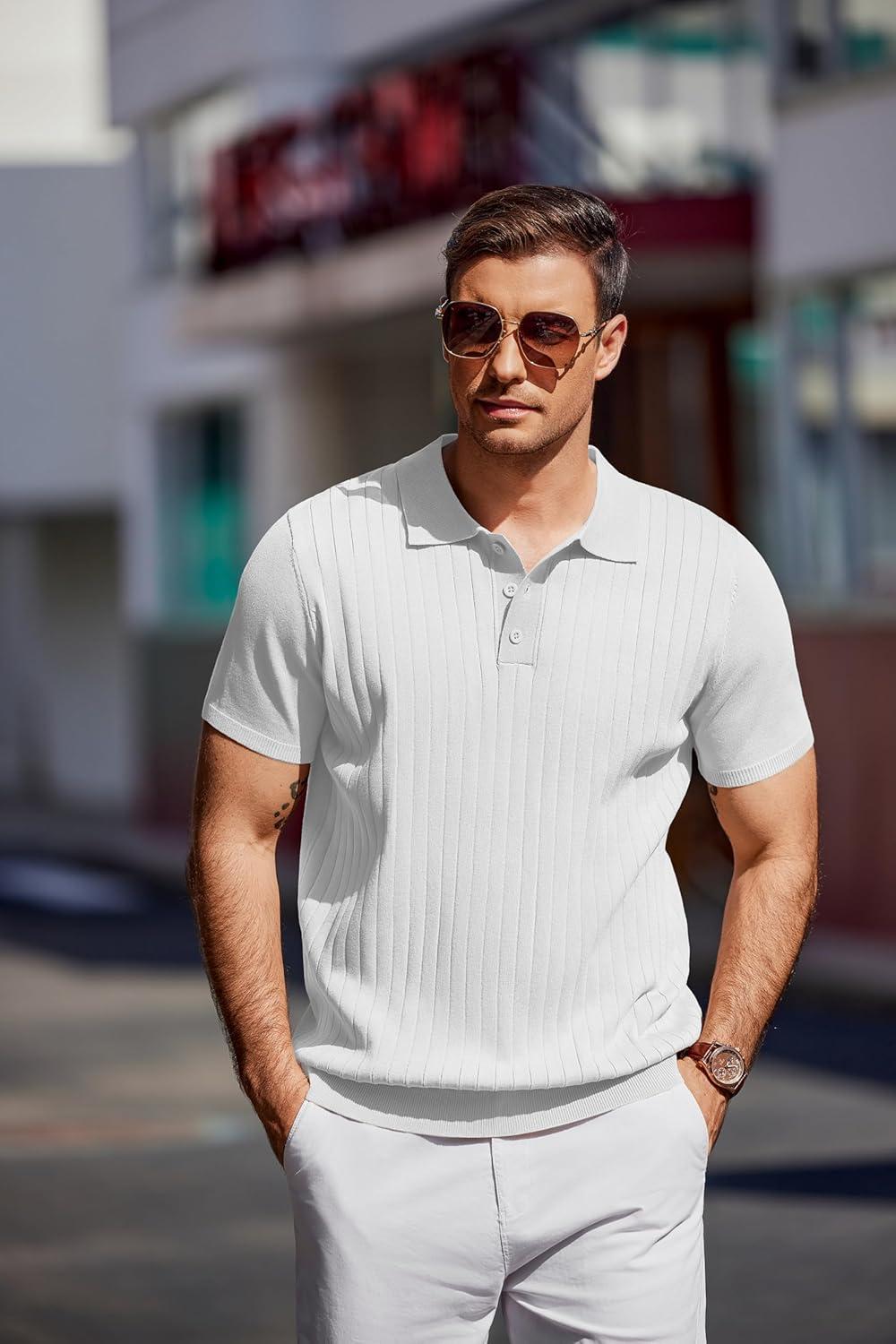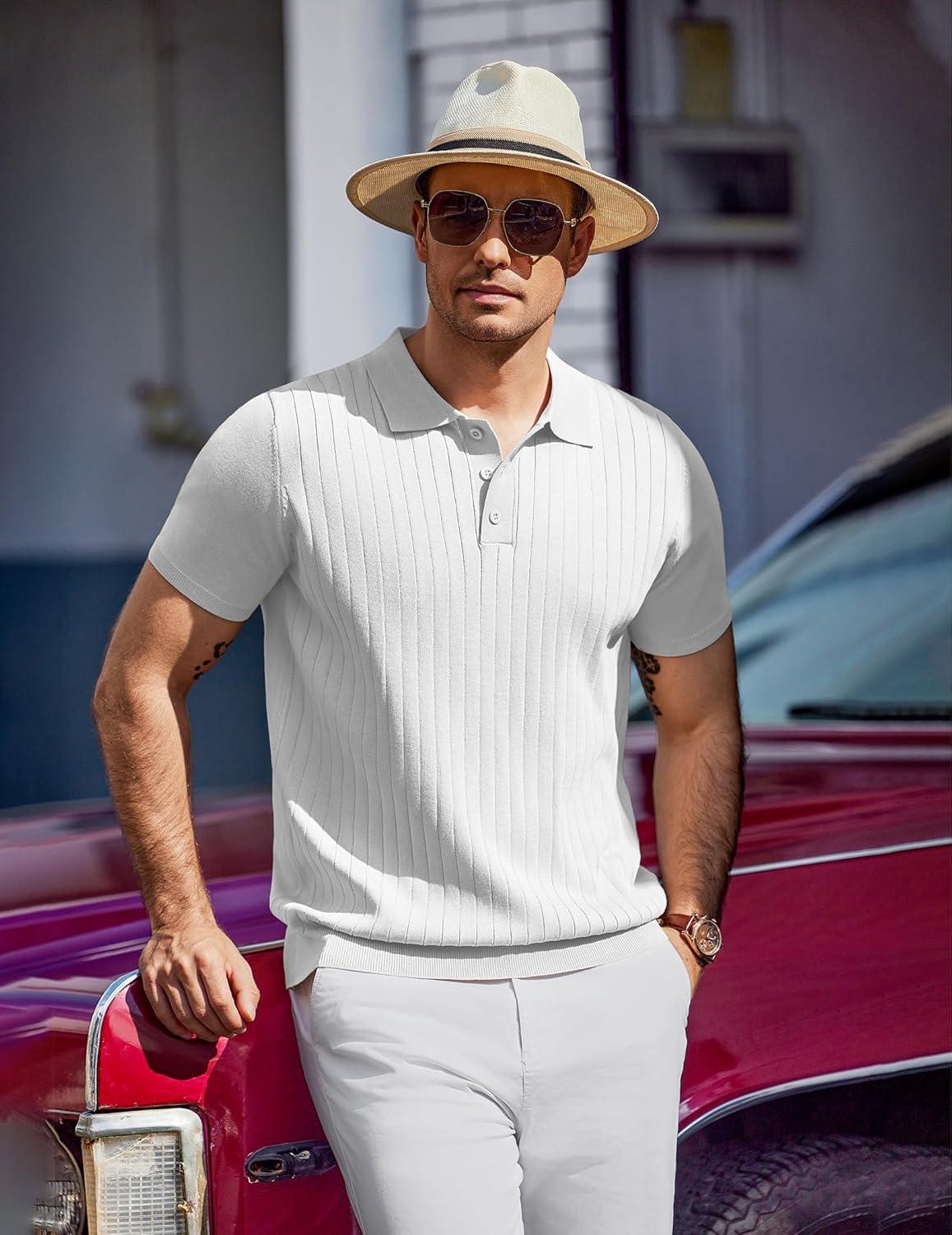 COOFANDY Mens Knit Polo Sweater Long Sleeve Polos Lightweight Casual Dress Pullover Sweaters(White)