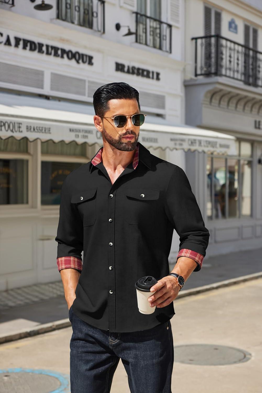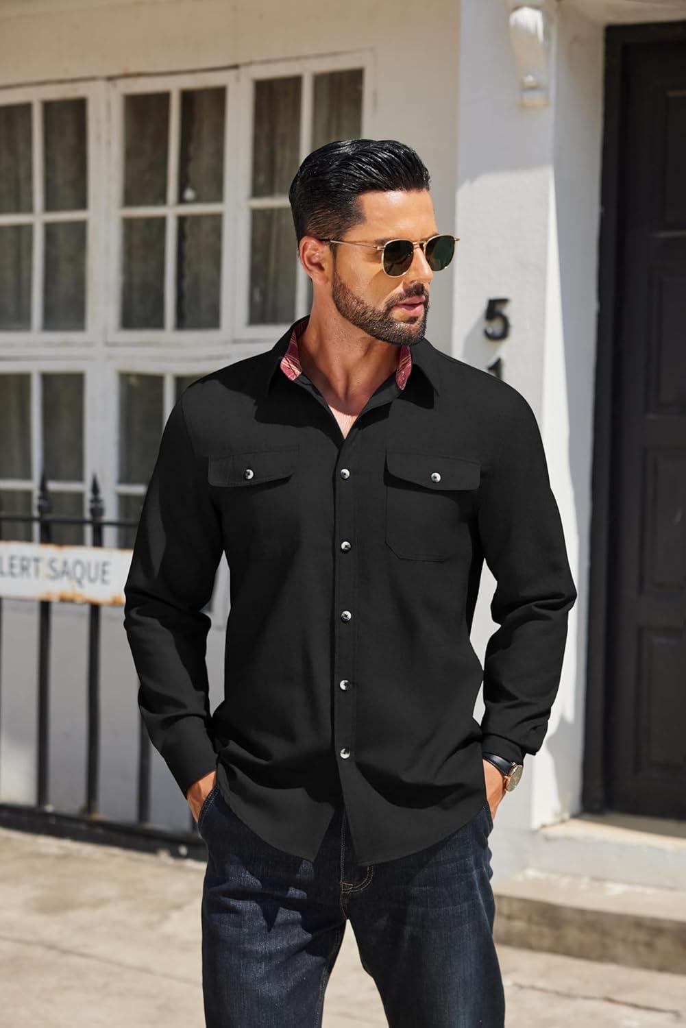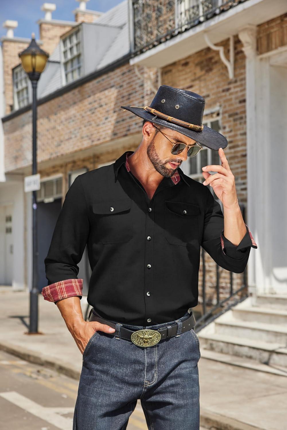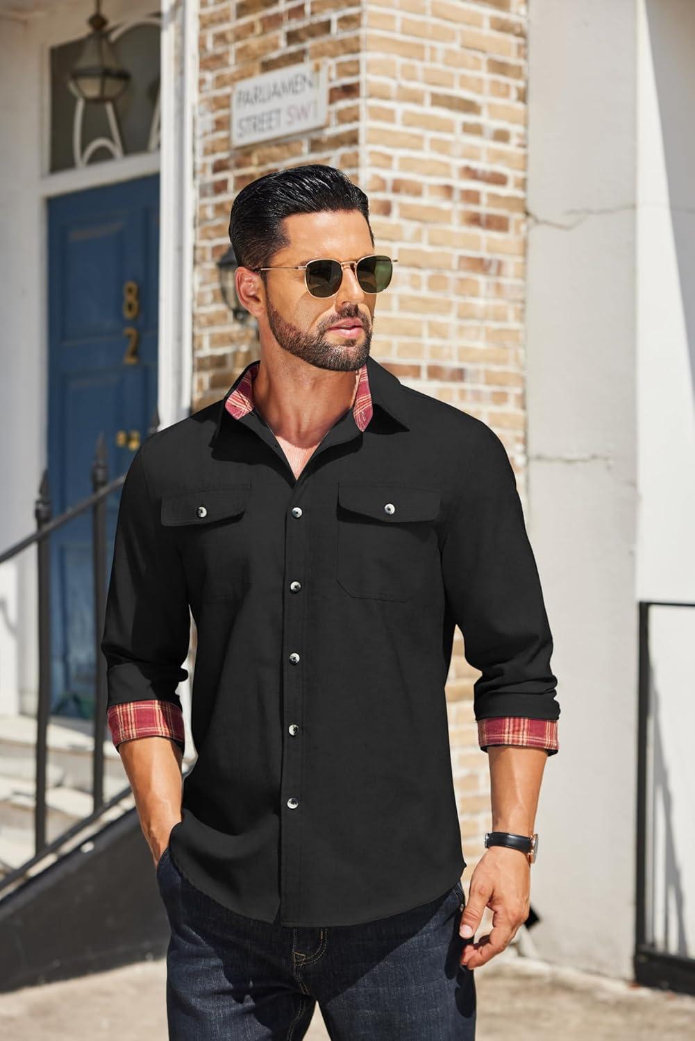 COOFANDY Men’s Casual Button Down Shirt Fall Long Sleeve Work Western Cowboy Shirts with Pockets,Plaid Cuffs(Solid-black)