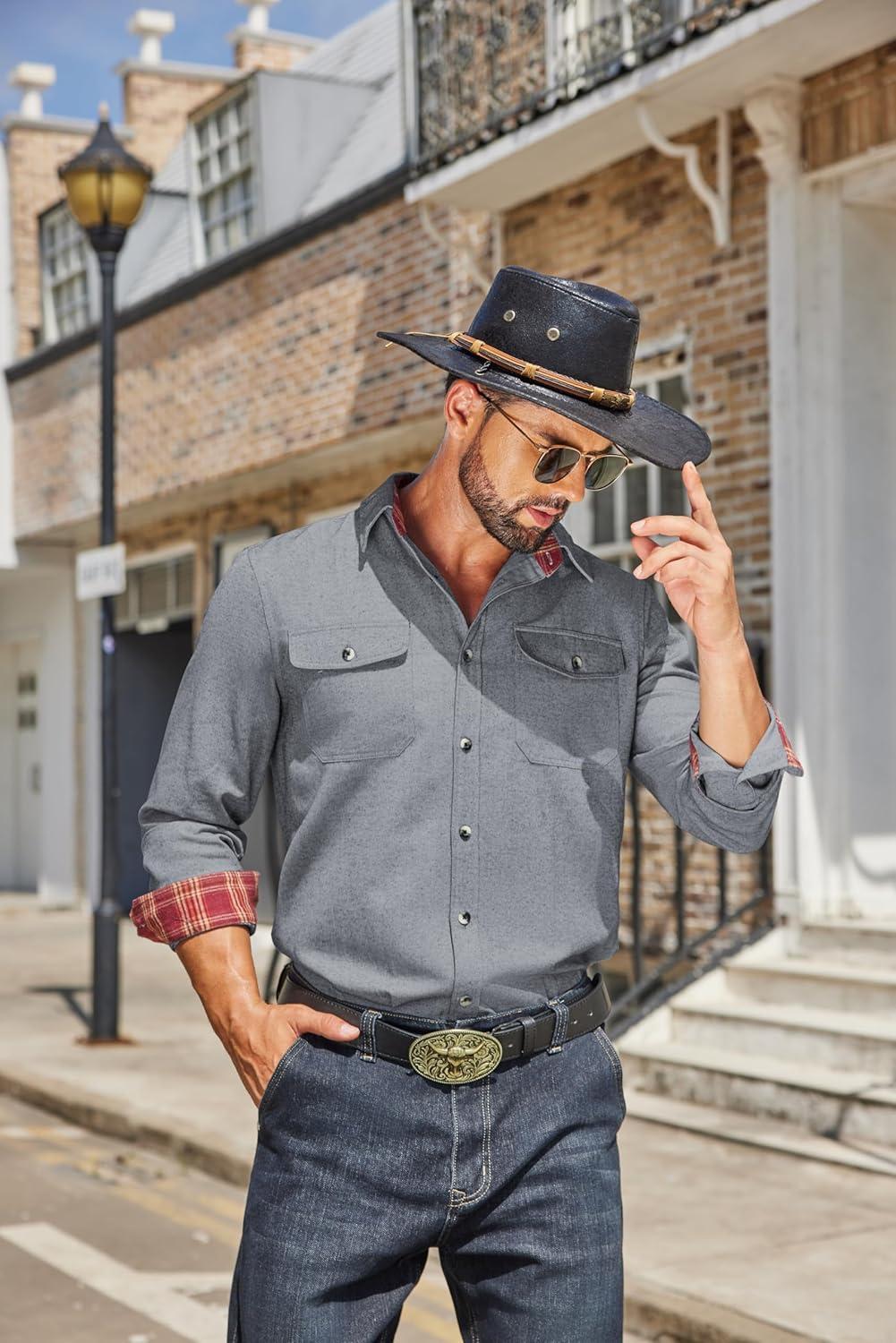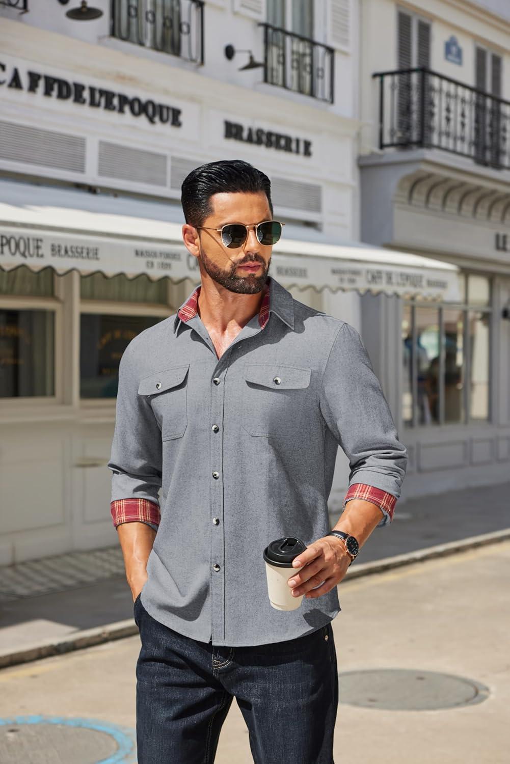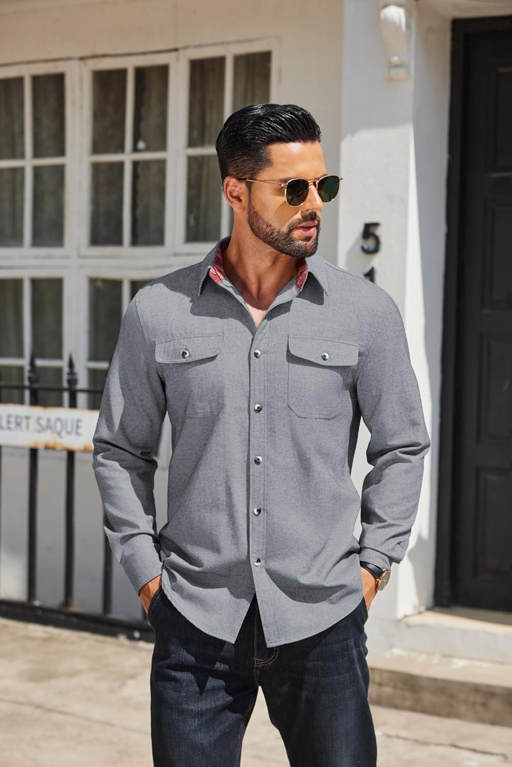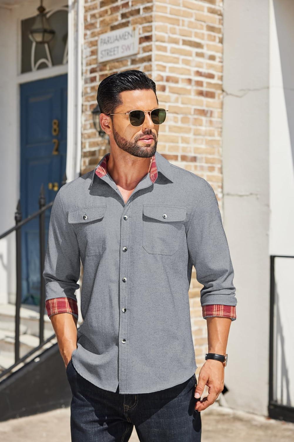 COOFANDY Men’s Casual Button Down Shirt Fall Long Sleeve Work Western Cowboy Shirts with Pockets,Plaid Cuffs(Solid-grey Heather)
