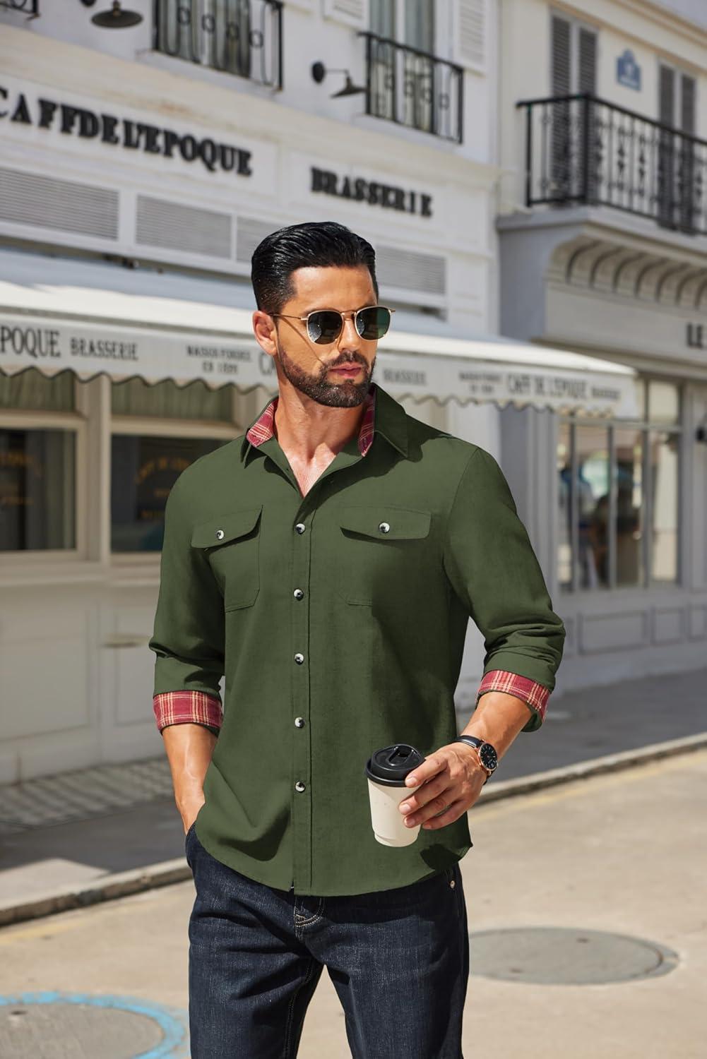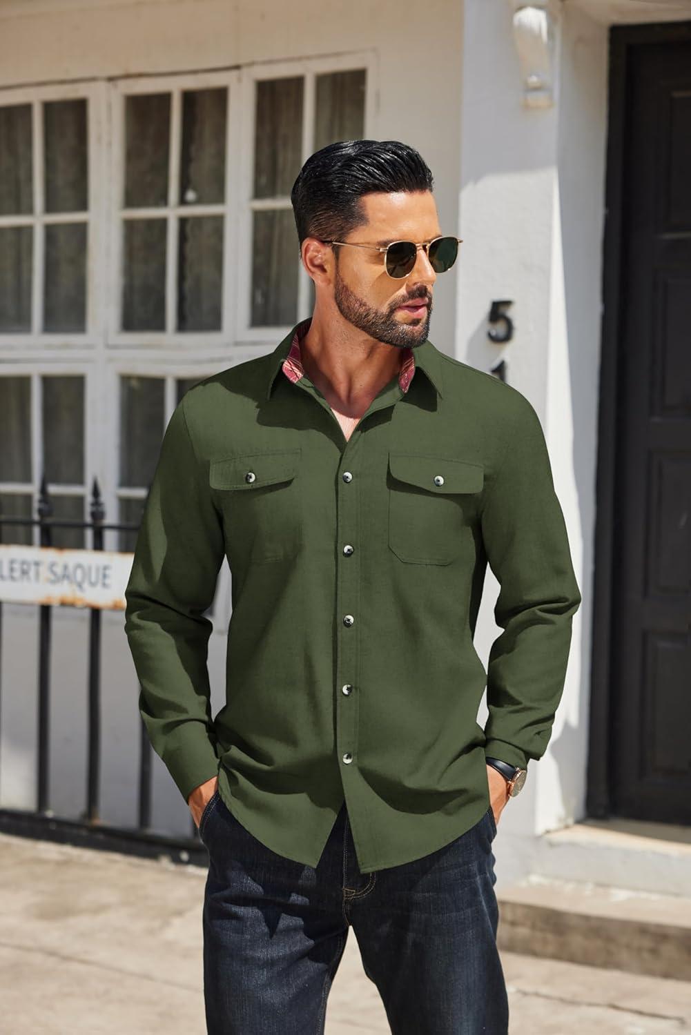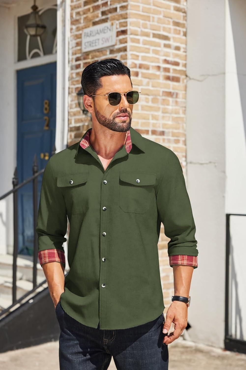 COOFANDY Men’s Casual Button Down Shirt Fall Long Sleeve Work Western Cowboy Shirts with Pockets,Plaid Cuffs(Solid-olive Green)